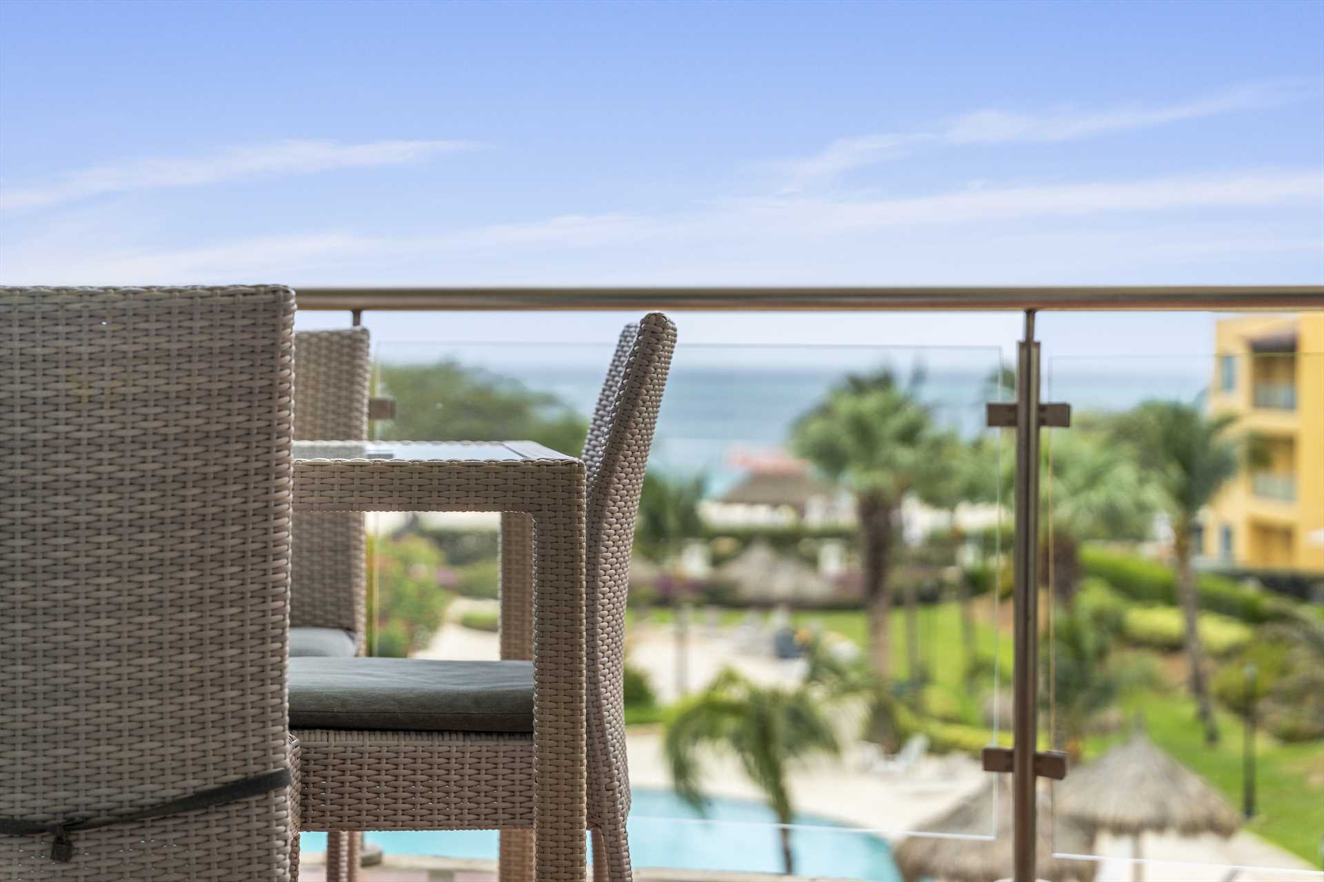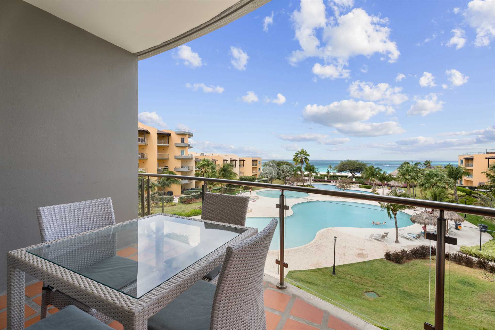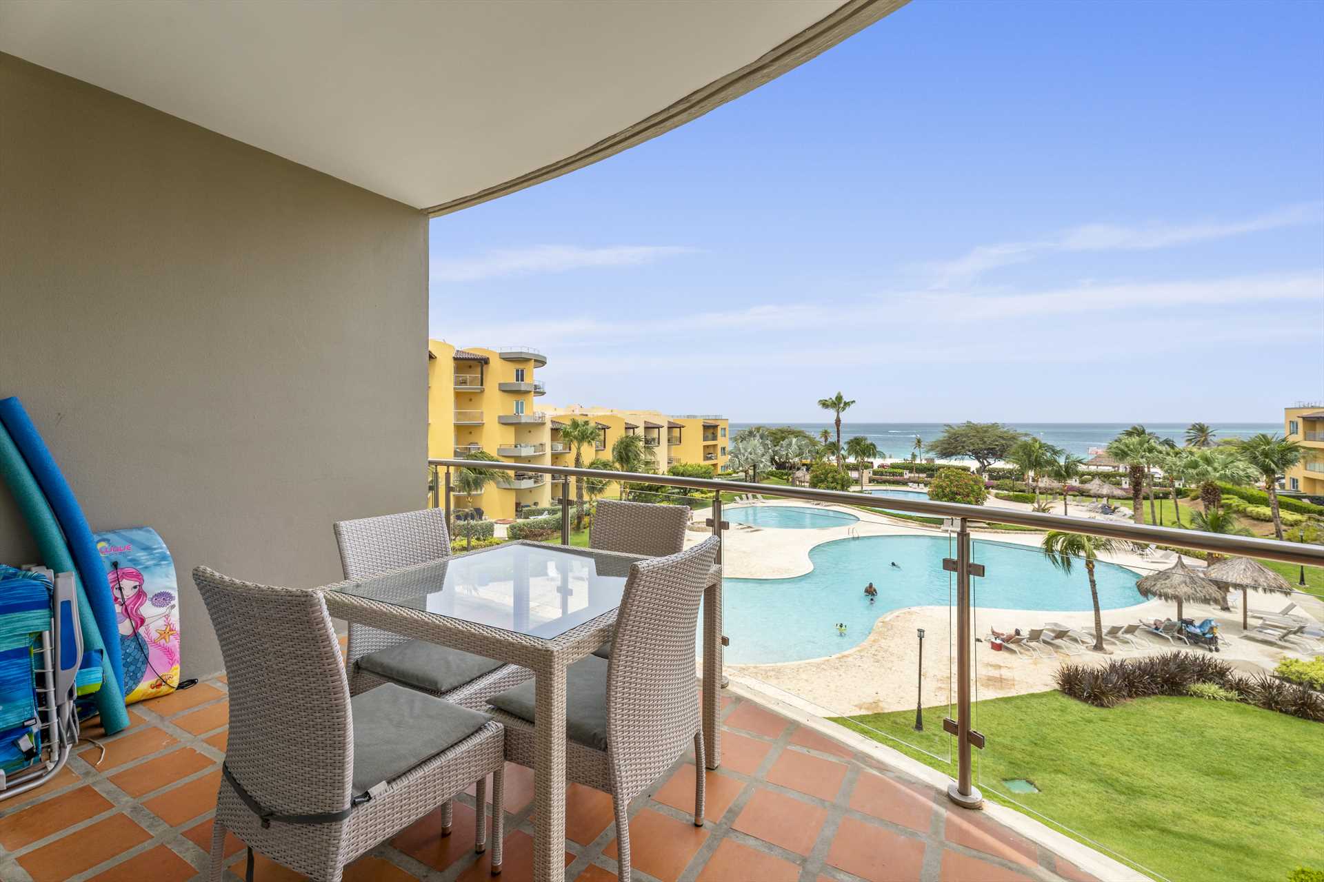 Welcome to the Supreme View Two-bedroom condo at Oceania Beachfront Condo Resort, a coastal haven just steps from Eagle Beach. Revel in ocean views from the balcony, living room, and primary bedroom. The half-circular balcony boasts a 4-seat dining table, an idyllic setting to savor Aruba's weather.