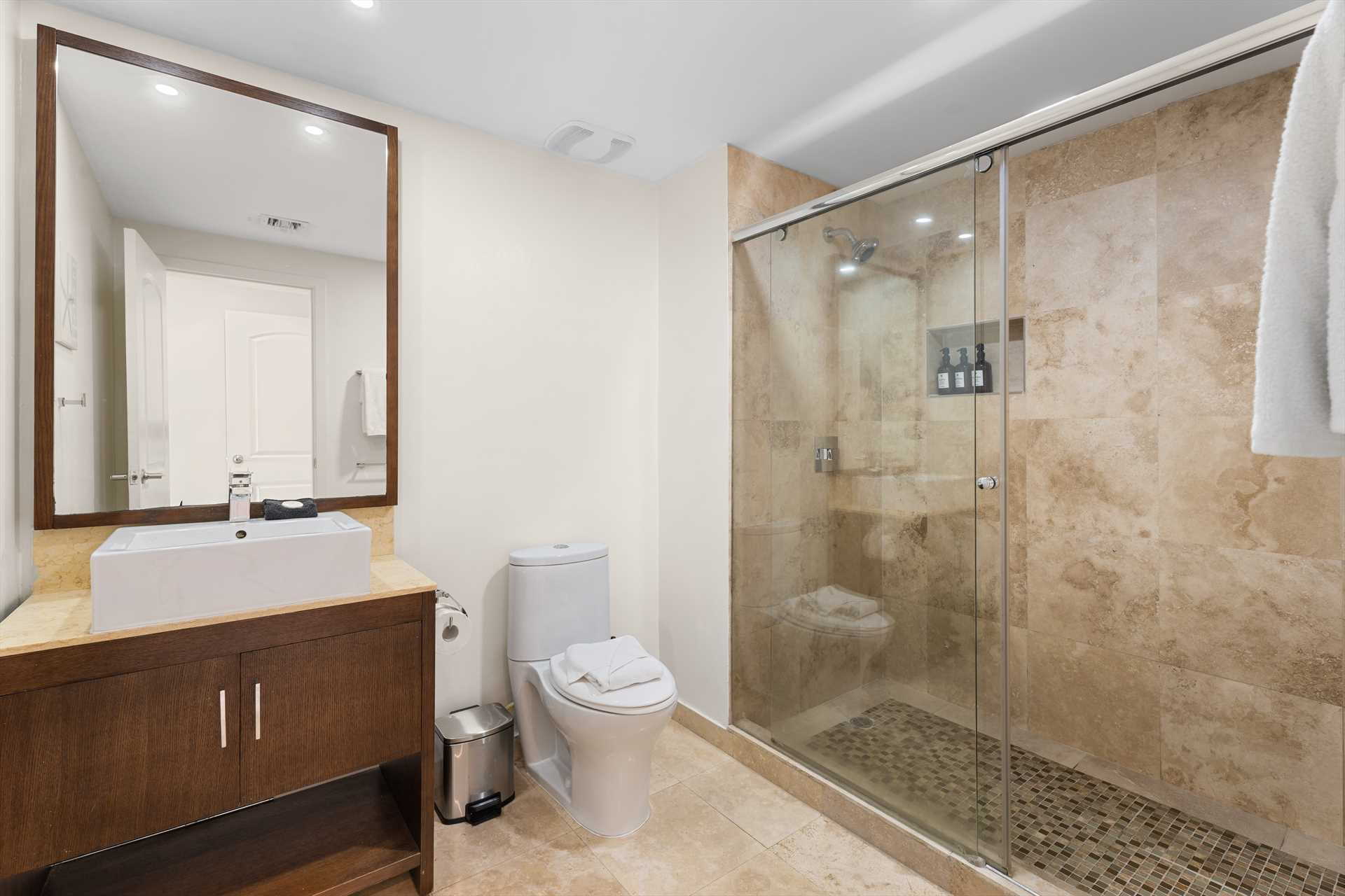 The primary bedroom indulges with a king-size bed, a TV, a desk with chair, walk-in closet, and an en-suite bathroom with a shower. Access the balcony directly from this room. The second bedroom offers two full-size beds, built-in closet, and a separate bathroom with a shower.