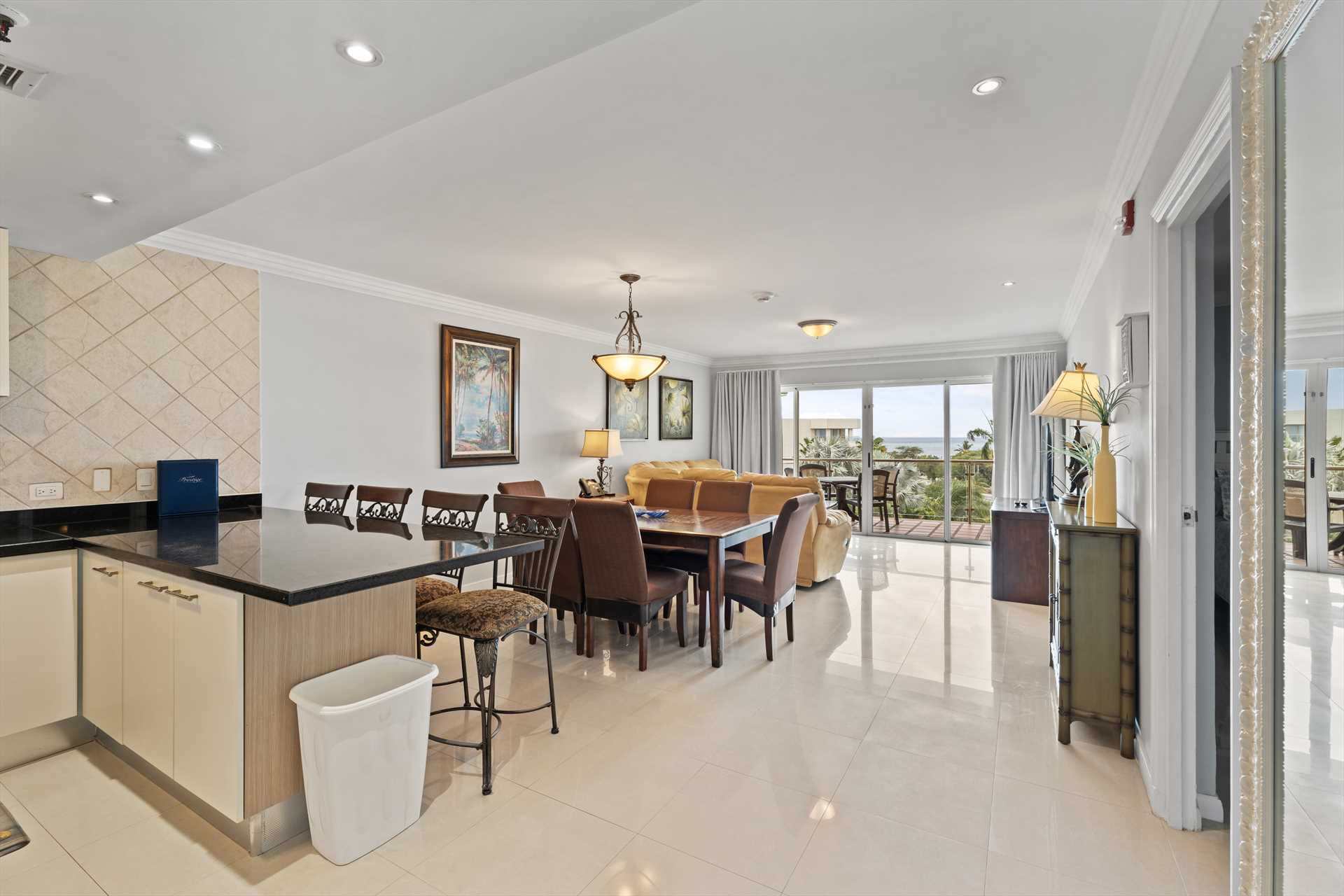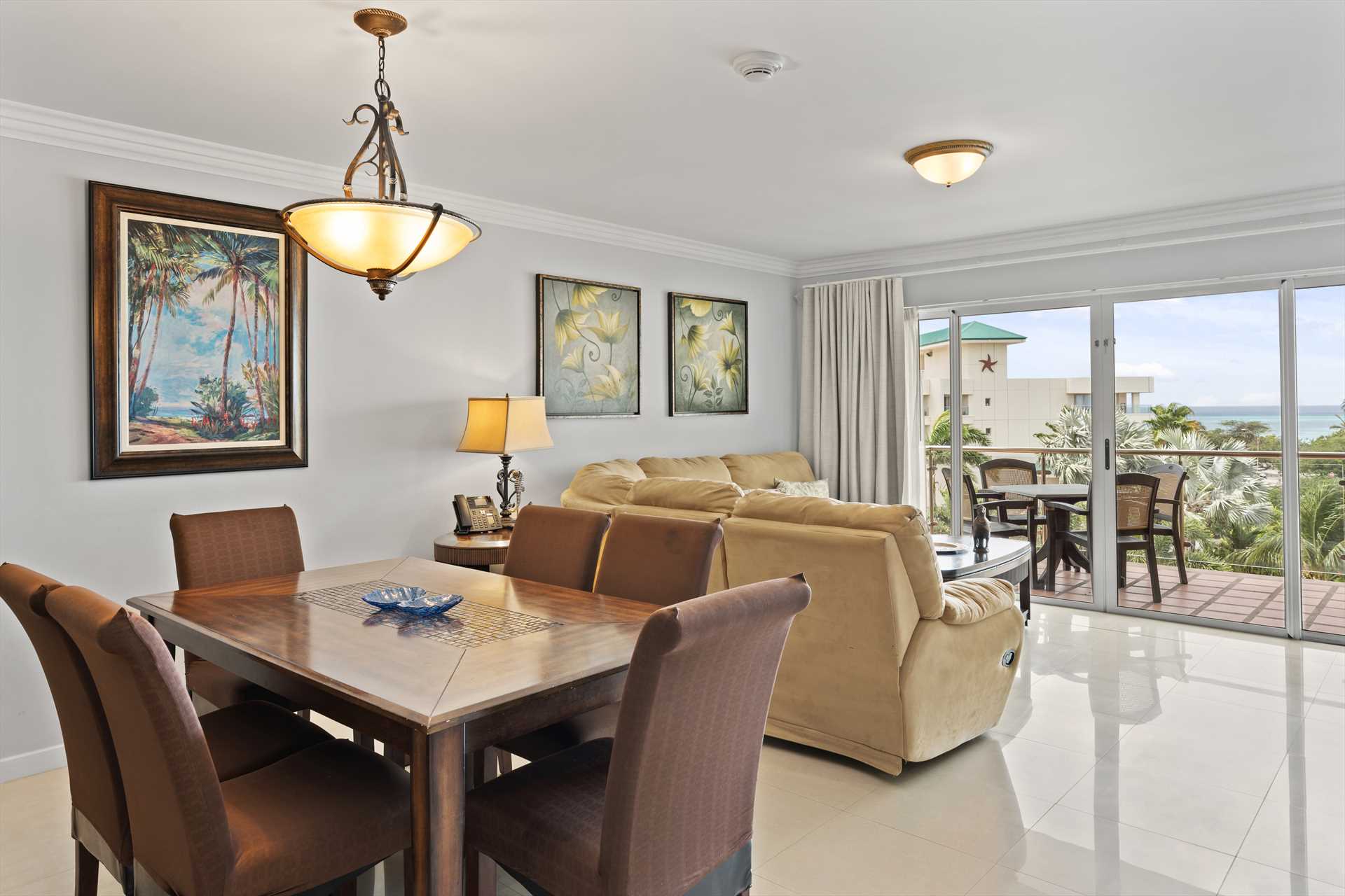 The Glamour View Three-bedroom condo is a combination of the Glamour View Studio (E422-1) and the Glamour View Two-bedroom (E422-2) condos, which have a connecting door in the living room facility hallway. This implies that you can spend your vacation enjoying views of the ocean from three different balconies. With floor-to-ceiling glass sliding doors on every balcony, you can take in stunning sunset views from inside the condo or on the balconies. Eagle Beach is only a short distance away.