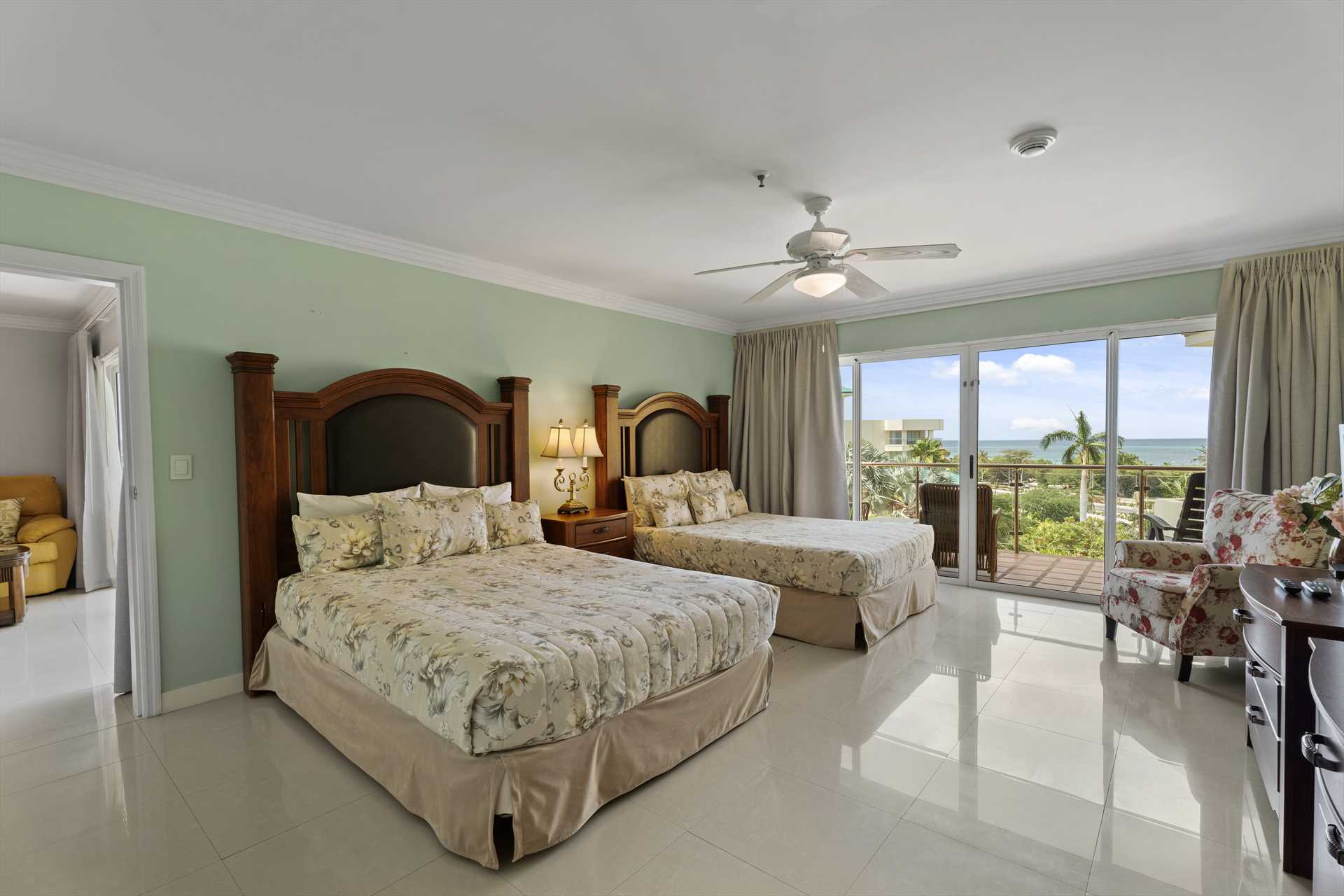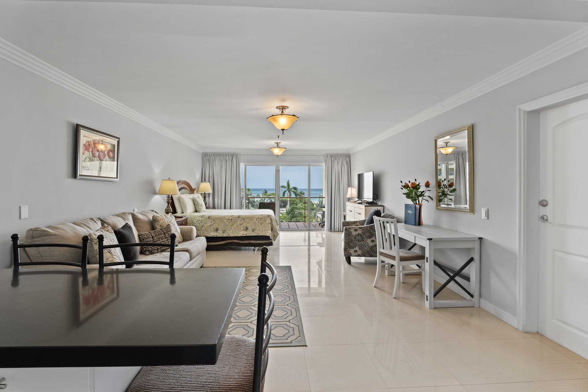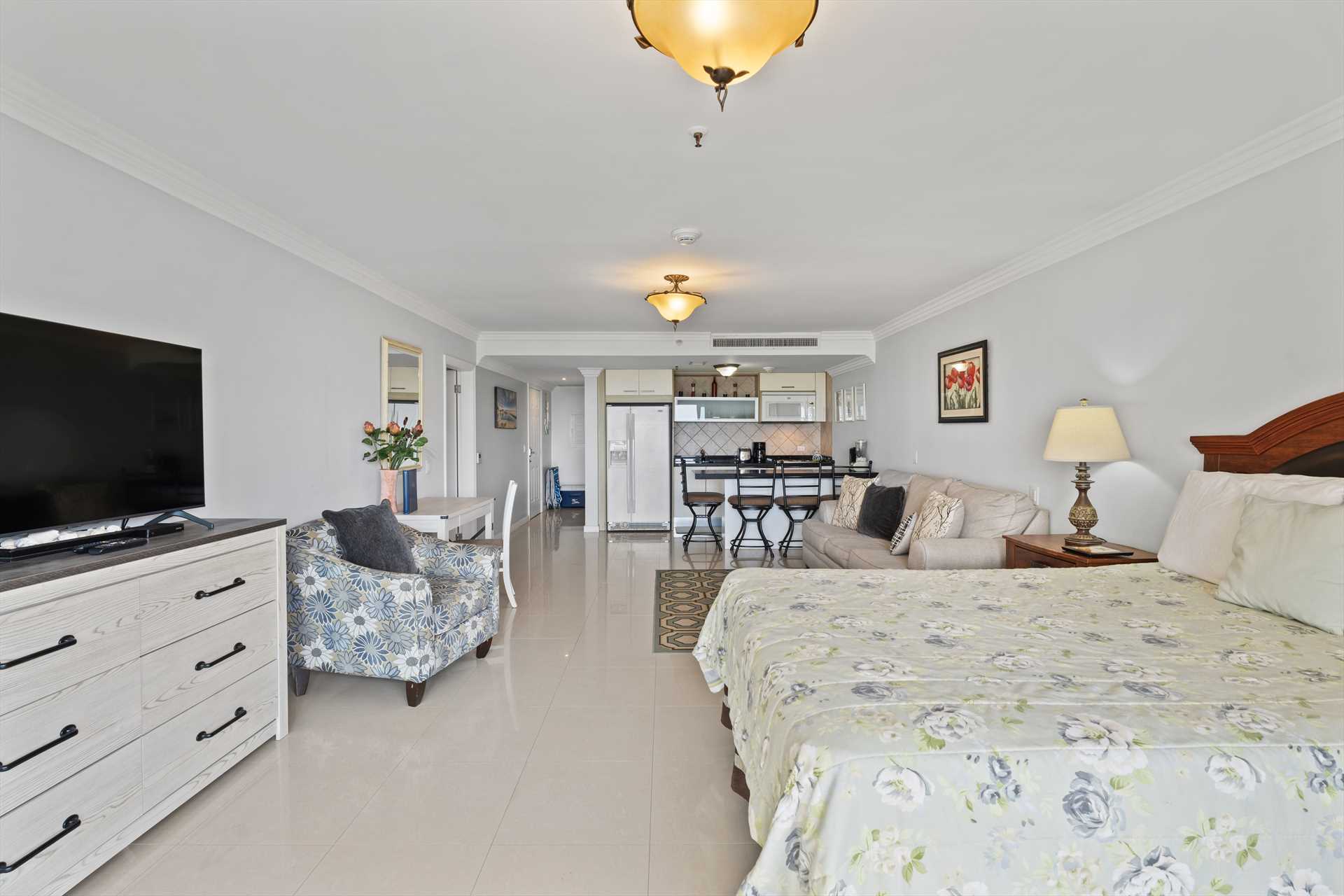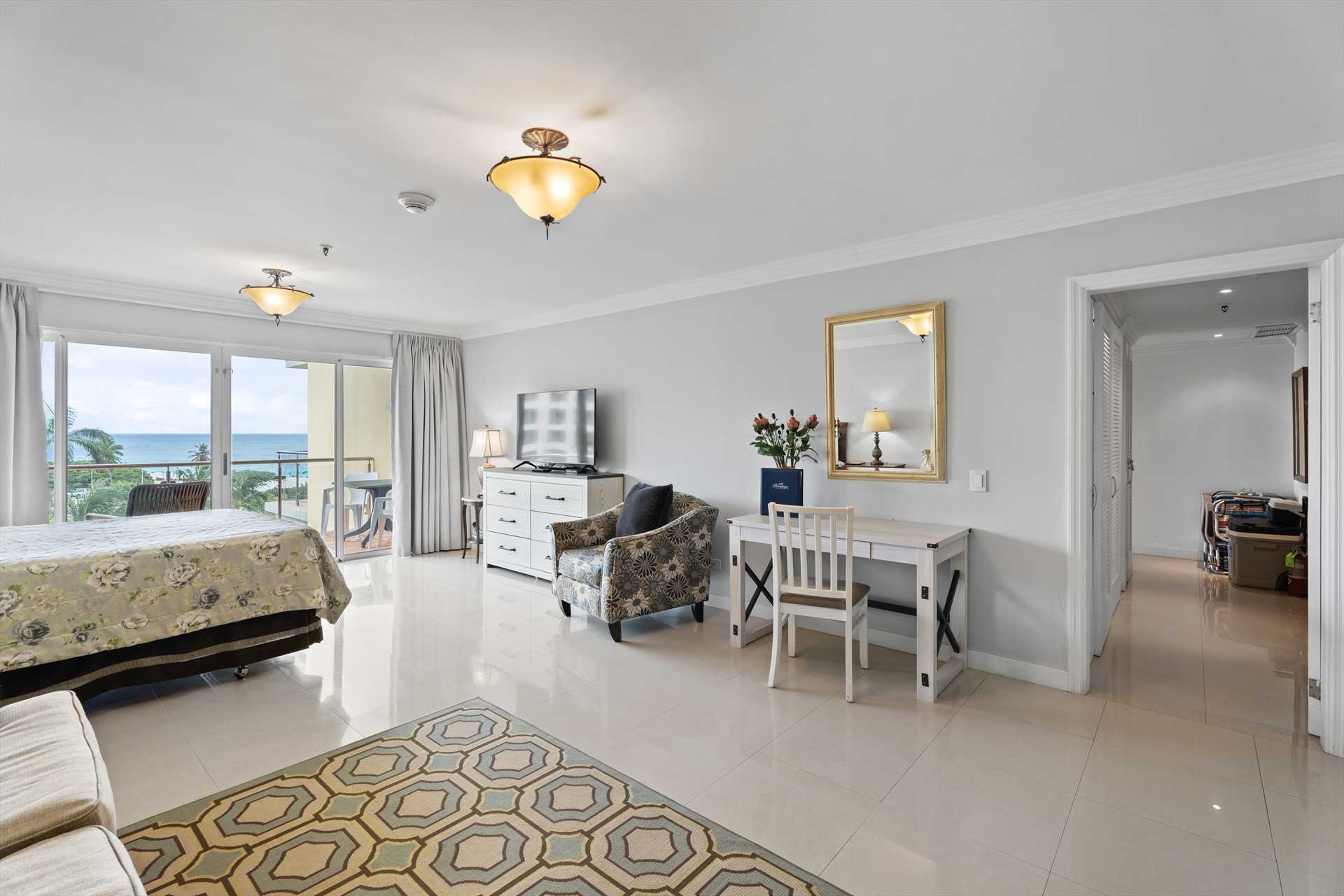 The third bedroom is the studio room that has a separate entry door and balcony with great ocean views. It sleeps 4 guests in a queen-size bed and a queen-size sofa bed. There is a balcony with amazing ocean and resort pool views. The studio room features a kitchenette with a full-sized fridge and freezer, a 2-burner electric stove, microwave, small appliances, kitchenware, and tableware. It includes a 4 bar stools, a TV, and a walk-in closet leading to a bathroom with a shower.