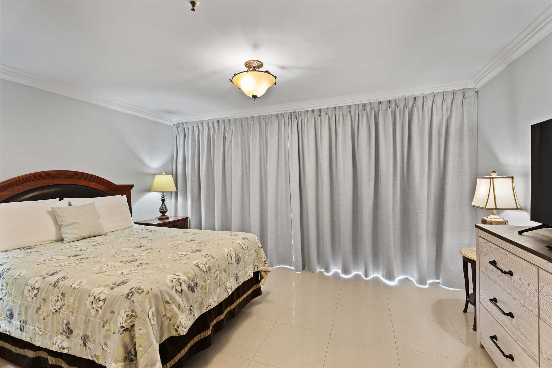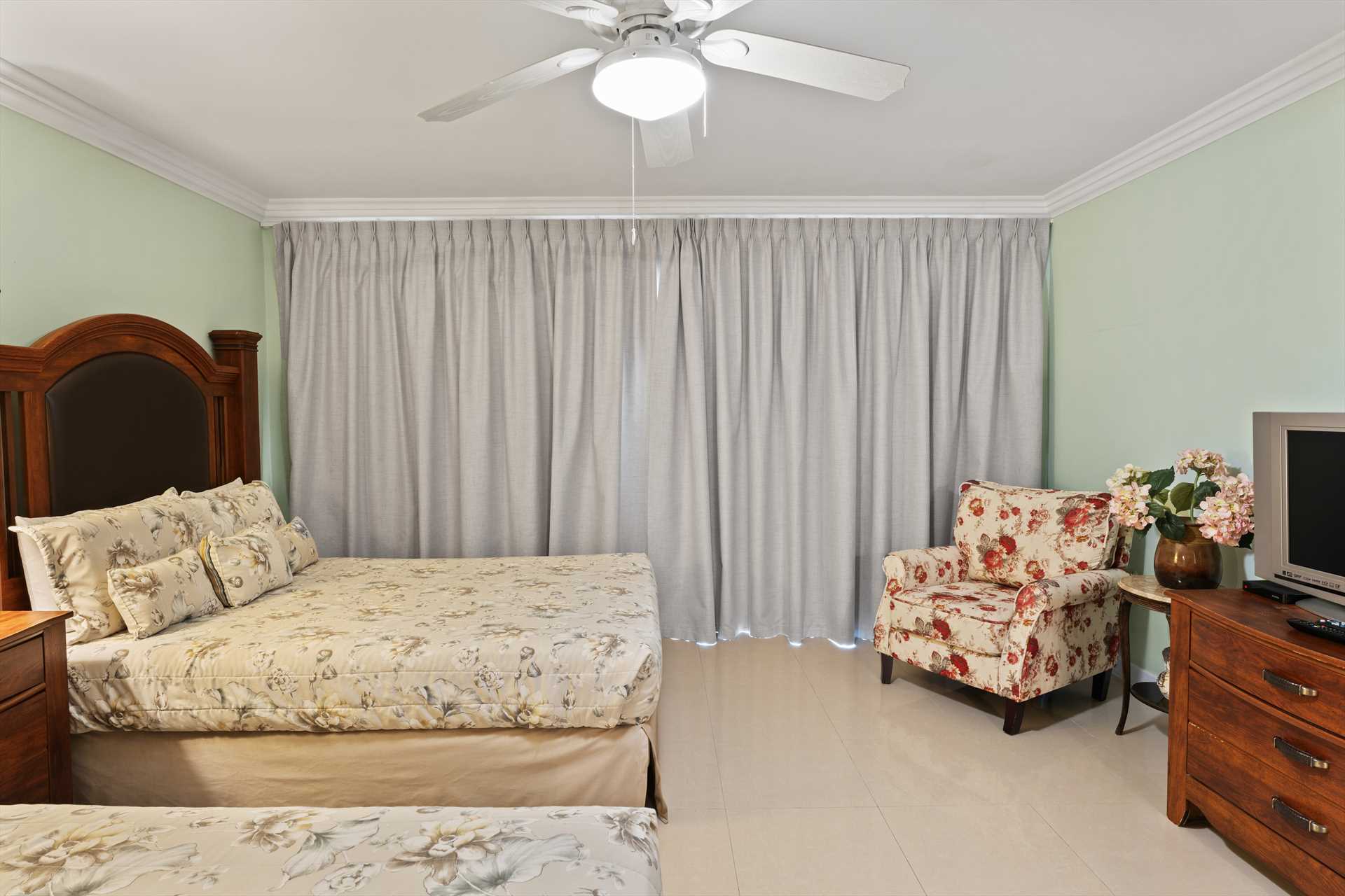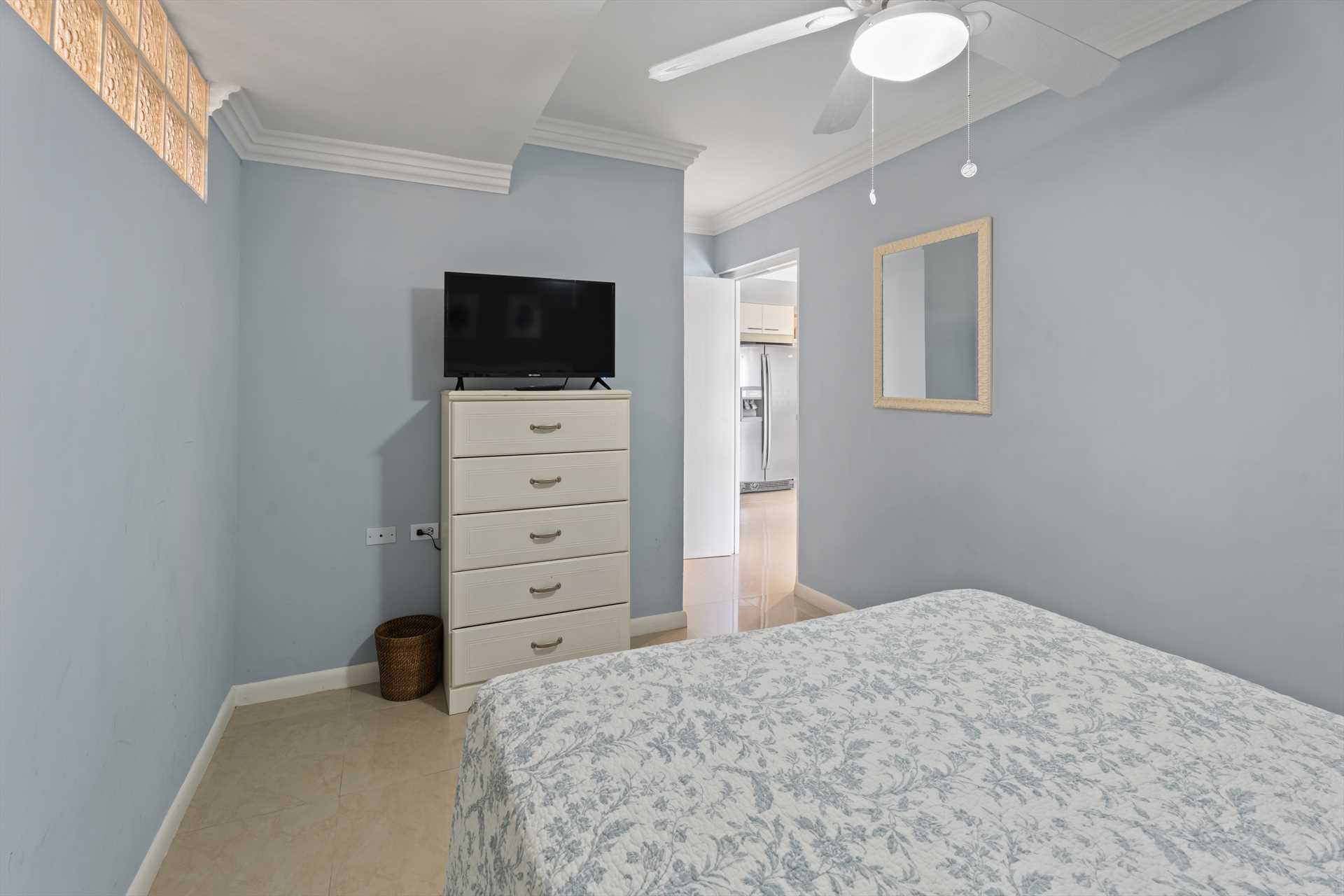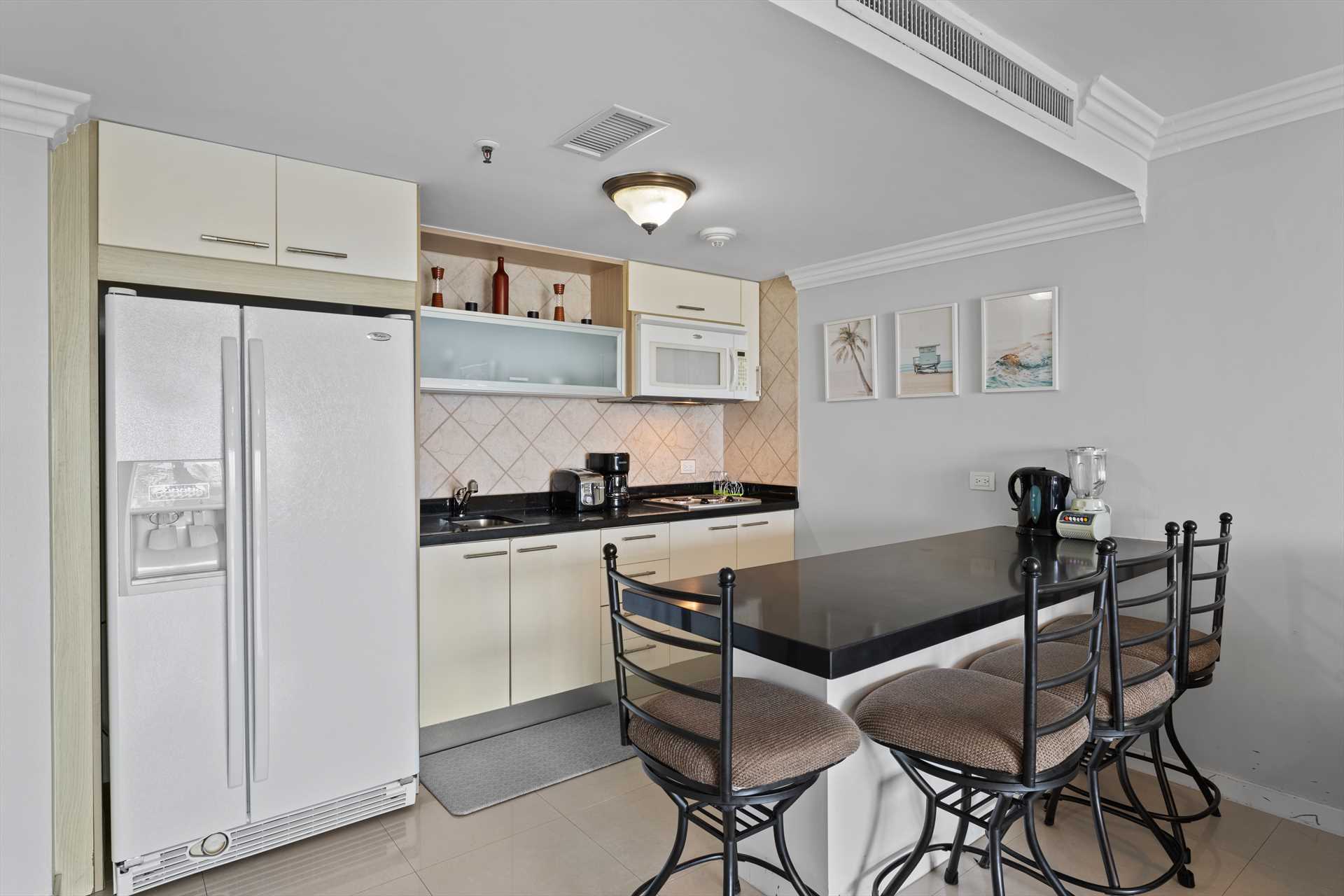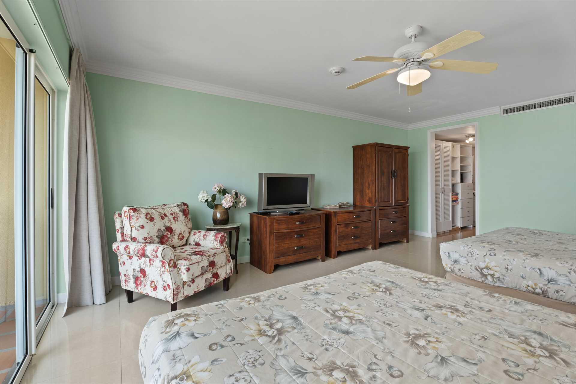 The third bedroom is the studio room that has a separate entry door and balcony with great ocean views. It sleeps 4 guests in a queen-size bed and a queen-size sofa bed. There is a balcony with amazing ocean and resort pool views. The studio room features a kitchenette with a full-sized fridge and freezer, a 2-burner electric stove, microwave, small appliances, kitchenware, and tableware. It includes a 4 bar stools, a TV, and a walk-in closet leading to a bathroom with a shower.