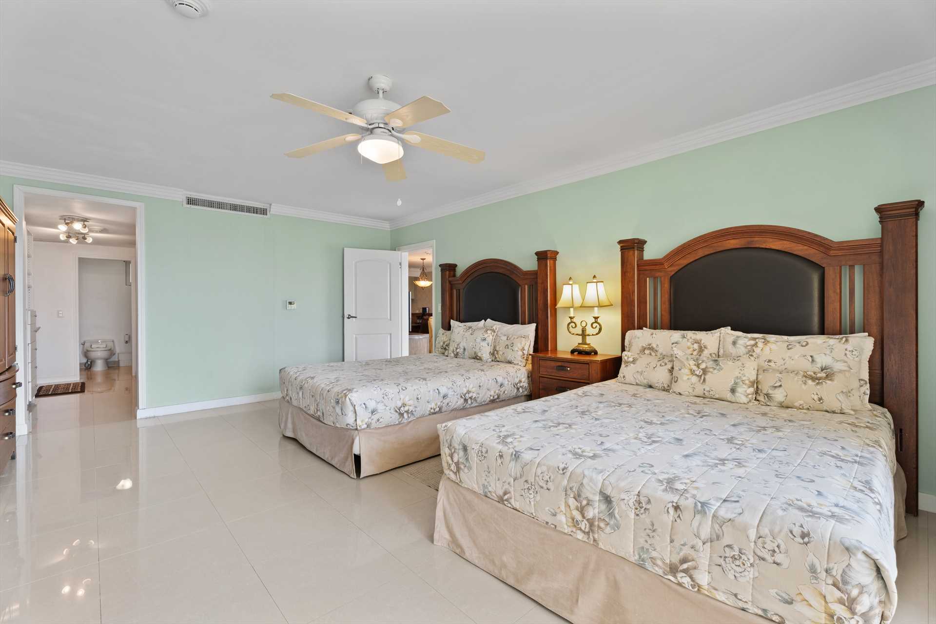 The two bedrooms, the front door, and the main balcony are all accessible from the living room. The living room has a curving sofa with a full-size sofa bed, a TV, a 6-seat dining table, and a well-equipped kitchen with four bar stools. The primary bedroom has two queen-size beds, a TV, balcony access, and an en-suite bathroom with a shower. The second bedroom has a double-size bed and a TV. Along with access to the studio room, the facility hallway includes a washer and dryer closet and the second bathroom with a shower.