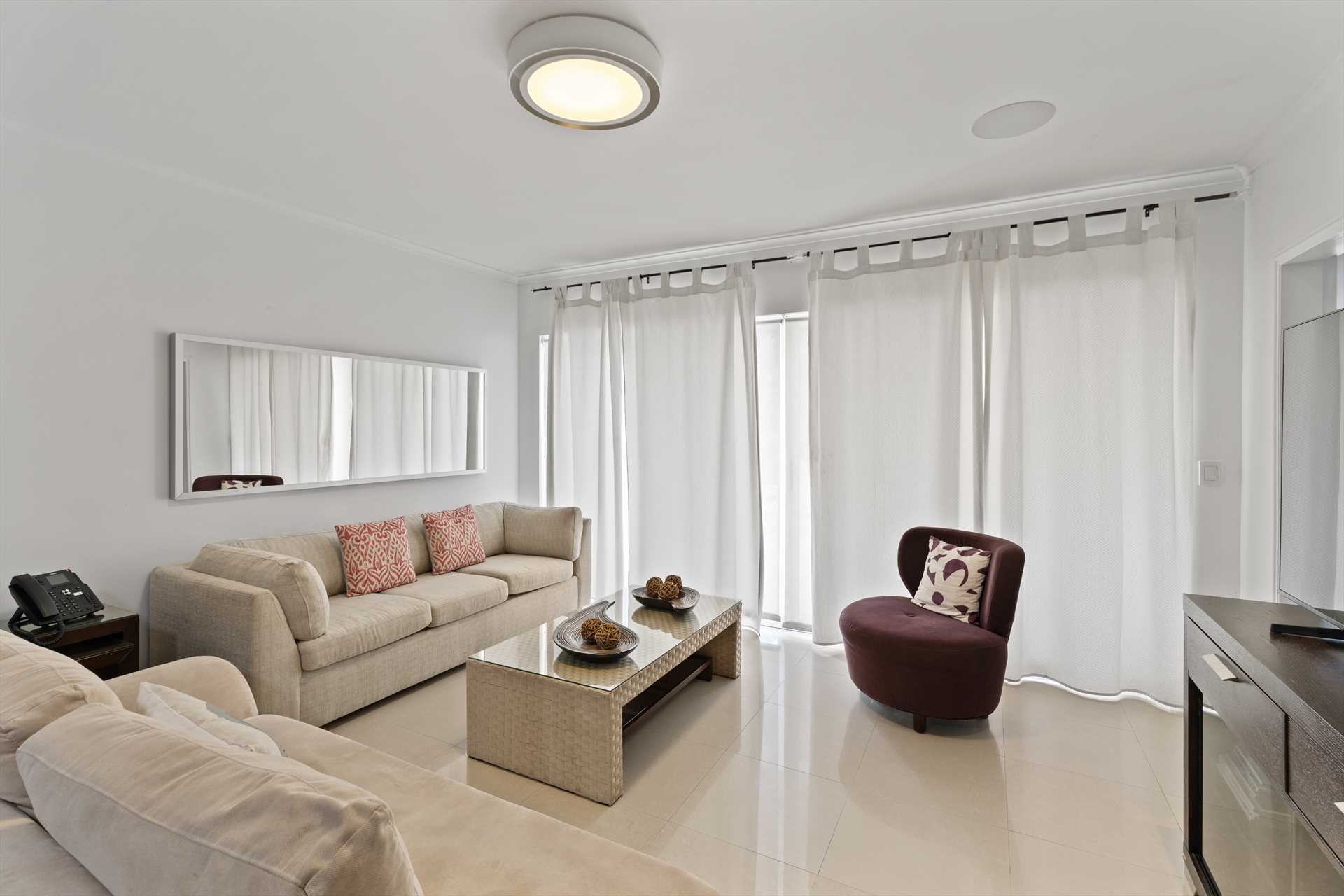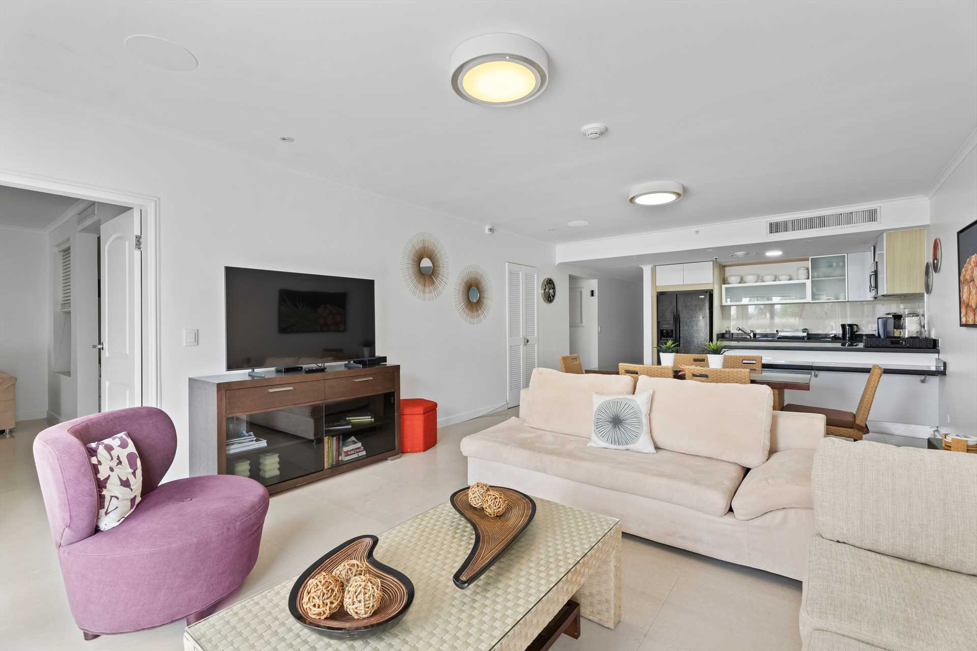 - The spacious living area features a 3-seat sofa bed (queen-size), a 2-seat sofa, an armchair, and a large TV for your entertainment.