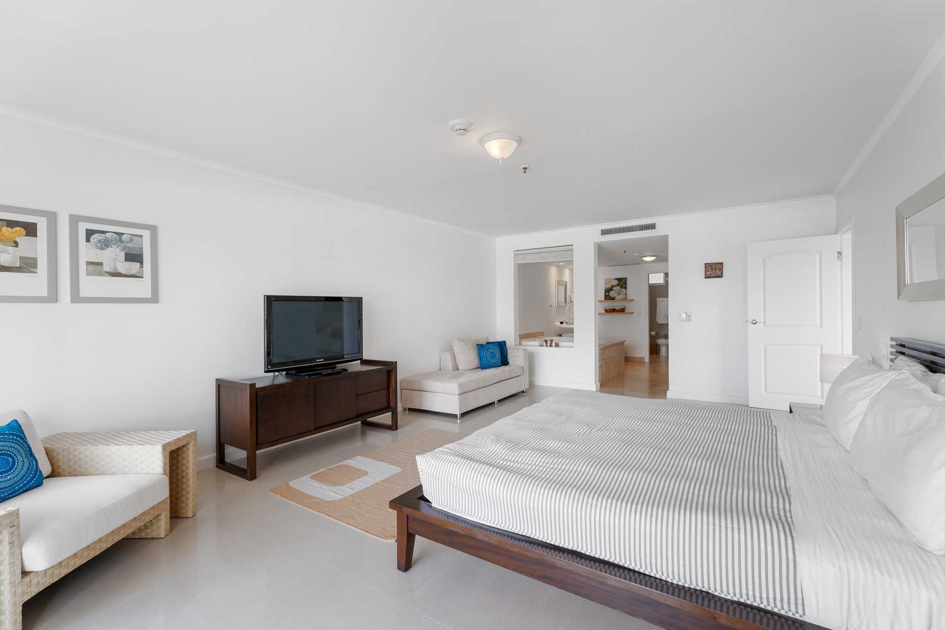 The bedroom features a king-size bed, TV, built-in closets, and direct access to the private terrace. It includes a spacious en-suite bathroom with an indoor jacuzzi tub and a separate shower room.