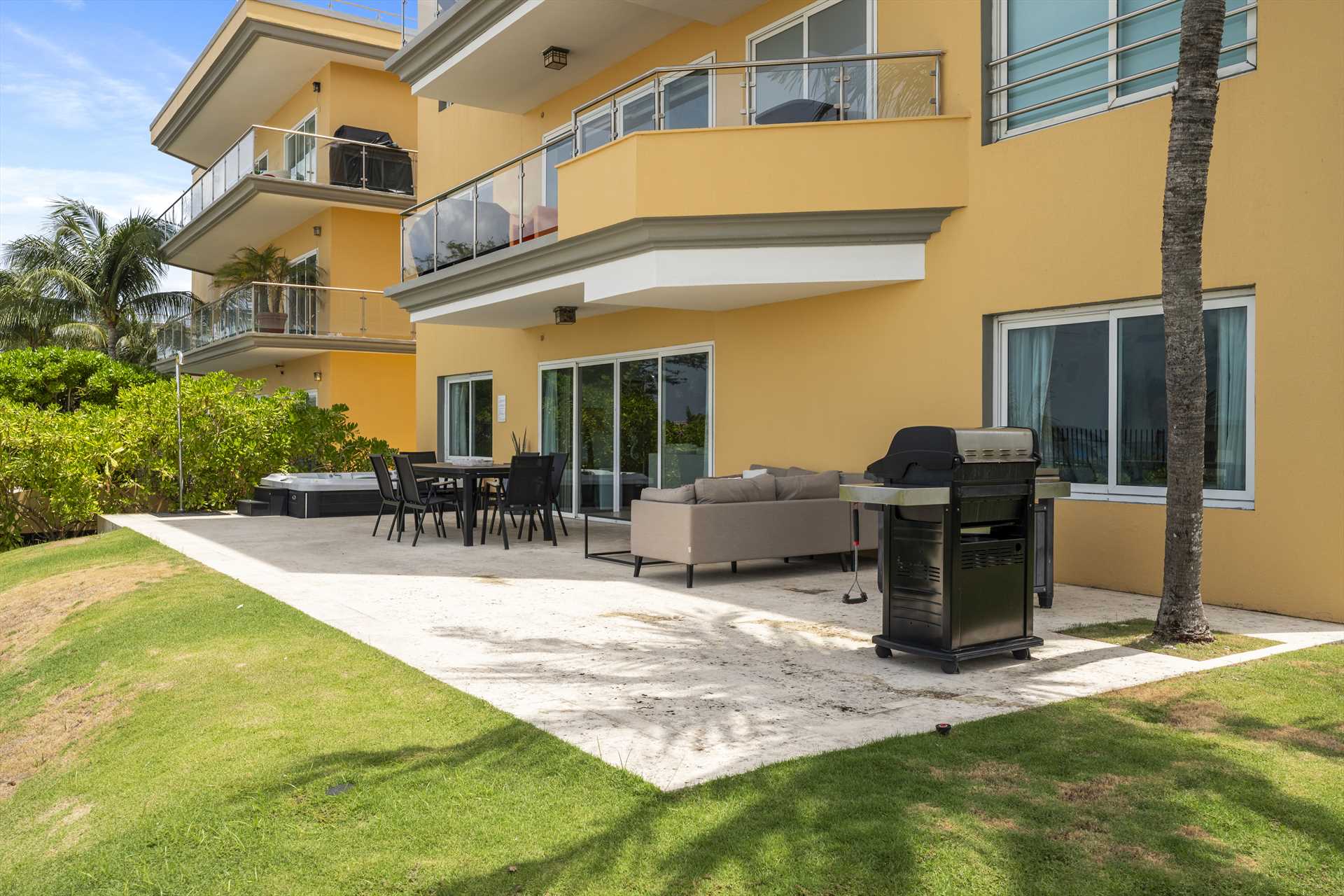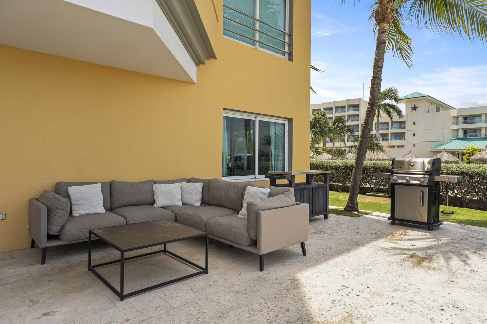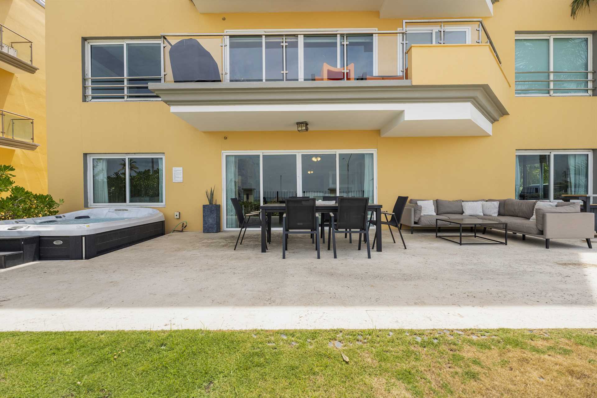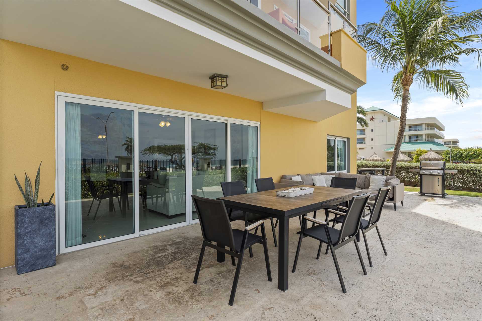 The Ocean Extravaganza Two-bedroom condo at Oceania Resort is located on the ground floor and offers unbeatable beachfront views of Eagle Beach. Its highlight is the private patio off the living room, featuring a large outdoor Jacuzzi, an L-shaped sofa, a dining table, and a BBQ grill, perfect for enjoying Aruba's weather and stunning sunsets. From the patio, guests have private and direct access to one of the resort's three swimming pools as well as the beach access gates, making Eagle Beach just a few steps away.