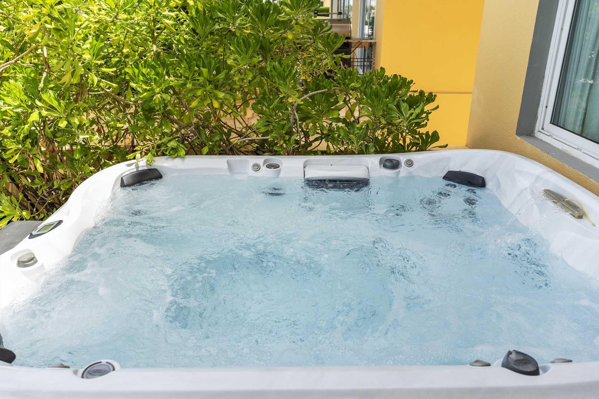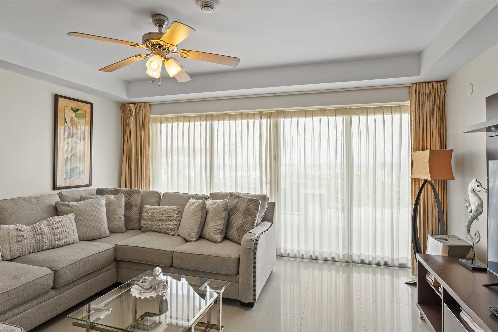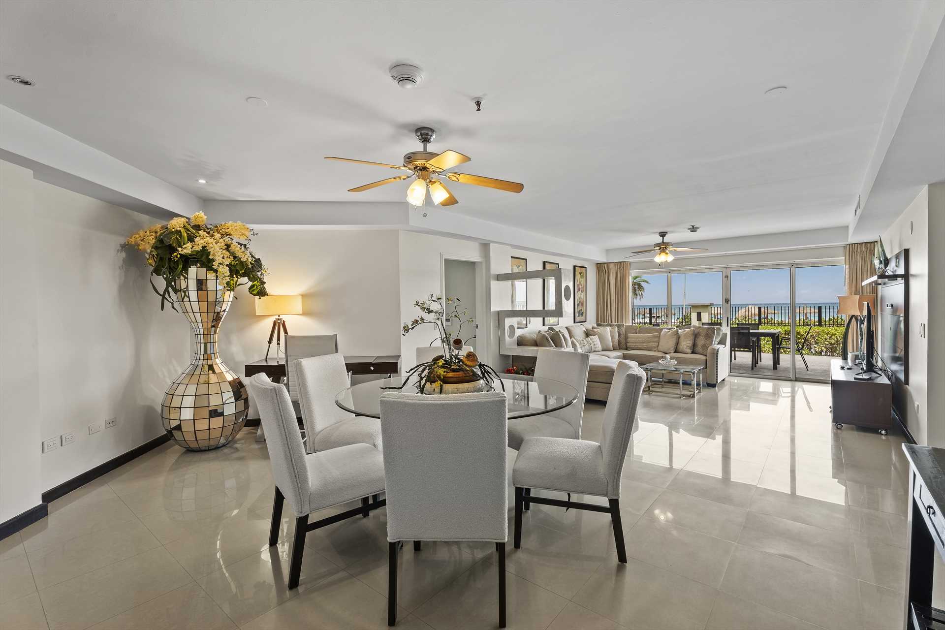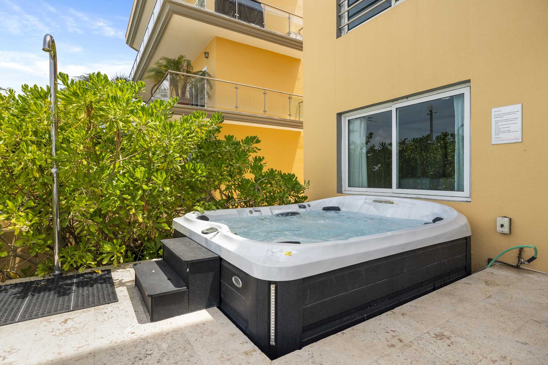 The Ocean Extravaganza Two-bedroom condo at Oceania Resort is located on the ground floor and offers unbeatable beachfront views of Eagle Beach. Its highlight is the private patio off the living room, featuring a large outdoor Jacuzzi, an L-shaped sofa, a dining table, and a BBQ grill, perfect for enjoying Aruba's weather and stunning sunsets. From the patio, guests have private and direct access to one of the resort's three swimming pools as well as the beach access gates, making Eagle Beach just a few steps away.
