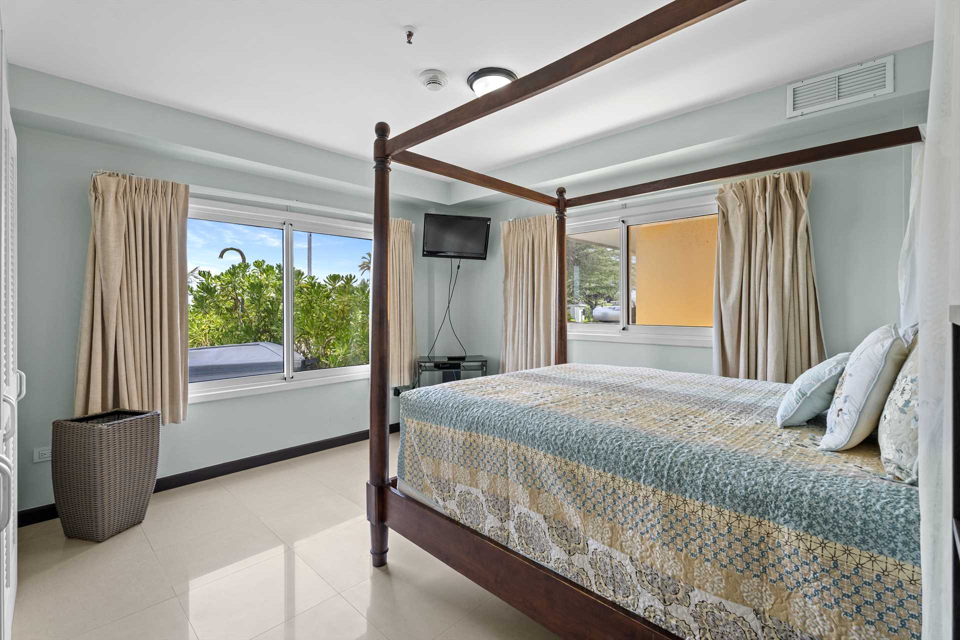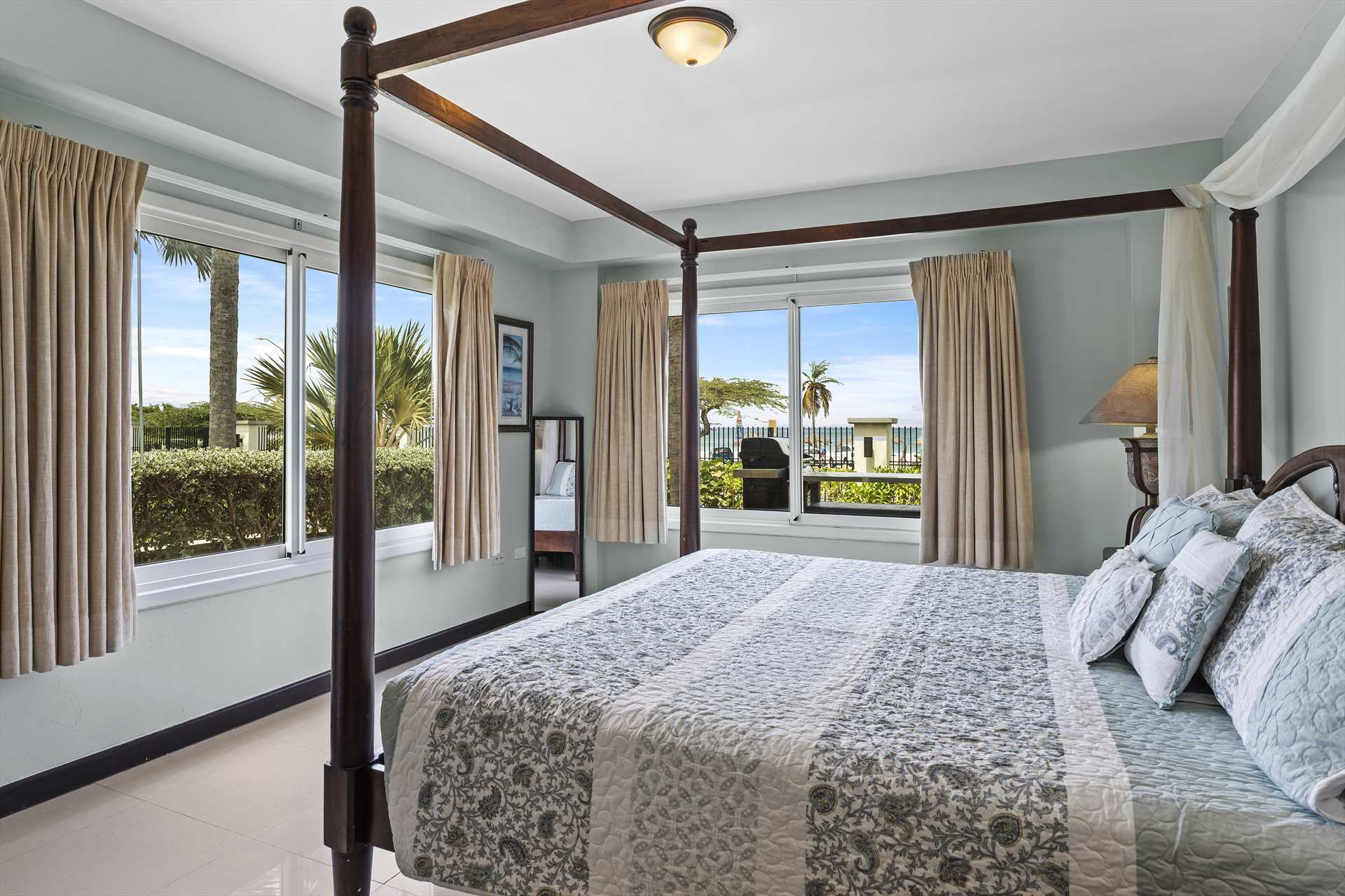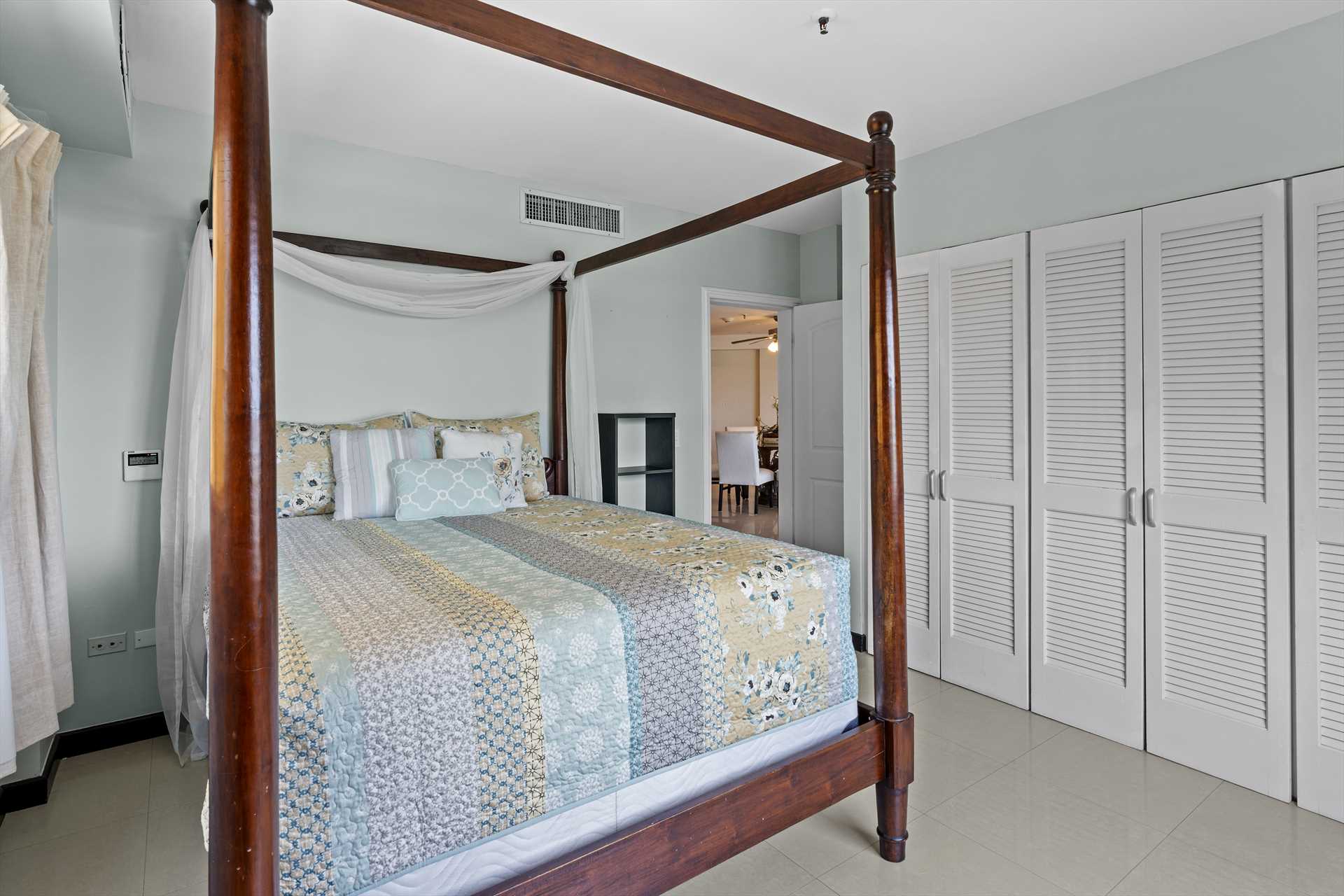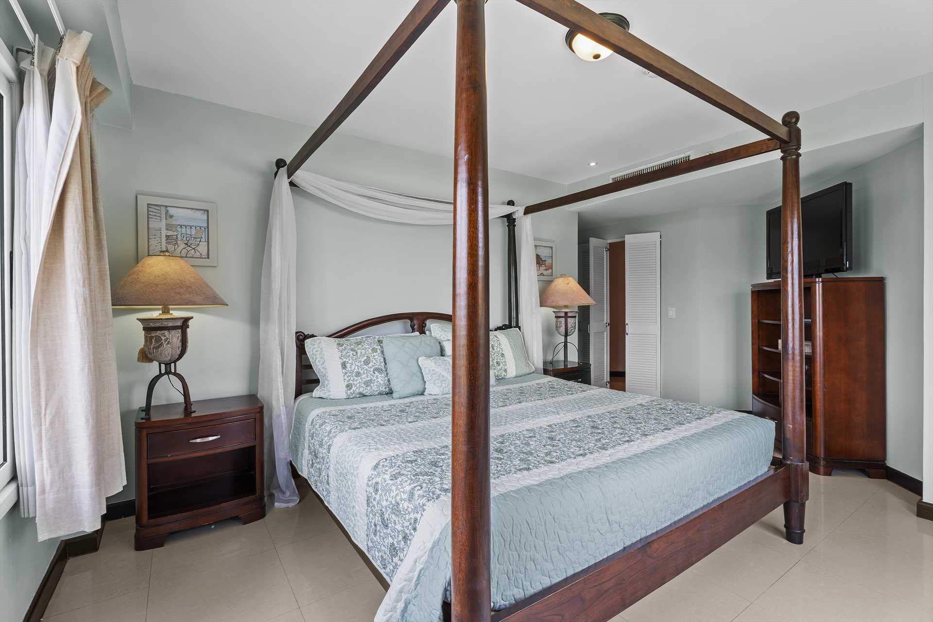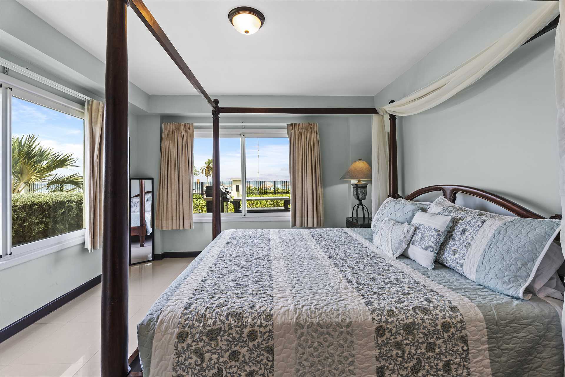 The primary bedroom with views of the ocean and the resort pool and is equipped with a king-size canopy bed, TV, walk-in closet, and en-suite bathroom with shower. The second bedroom with oecan view and has a queen-size canopy bed, TV, built-in closets. A second full bathroom with shower is also available.