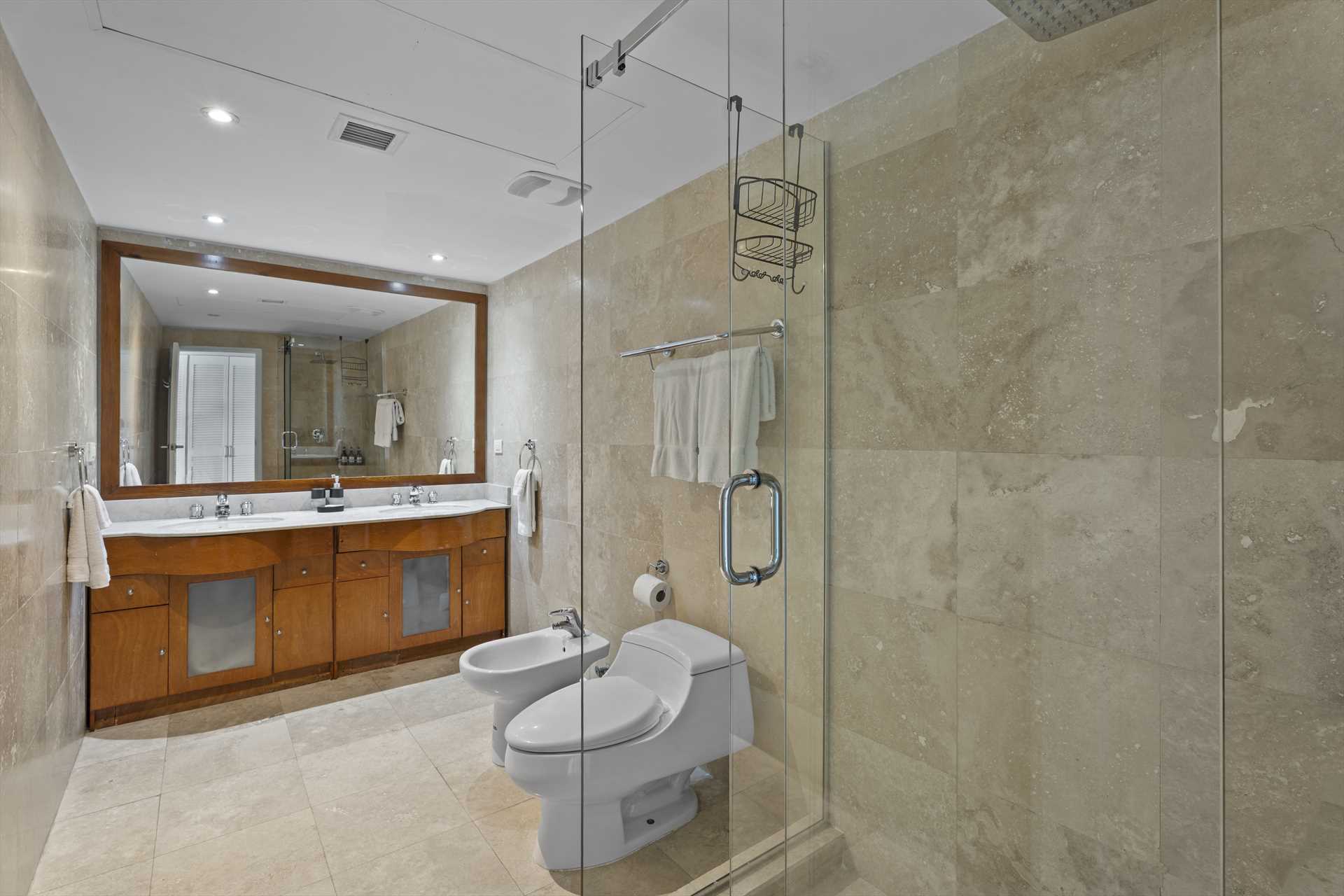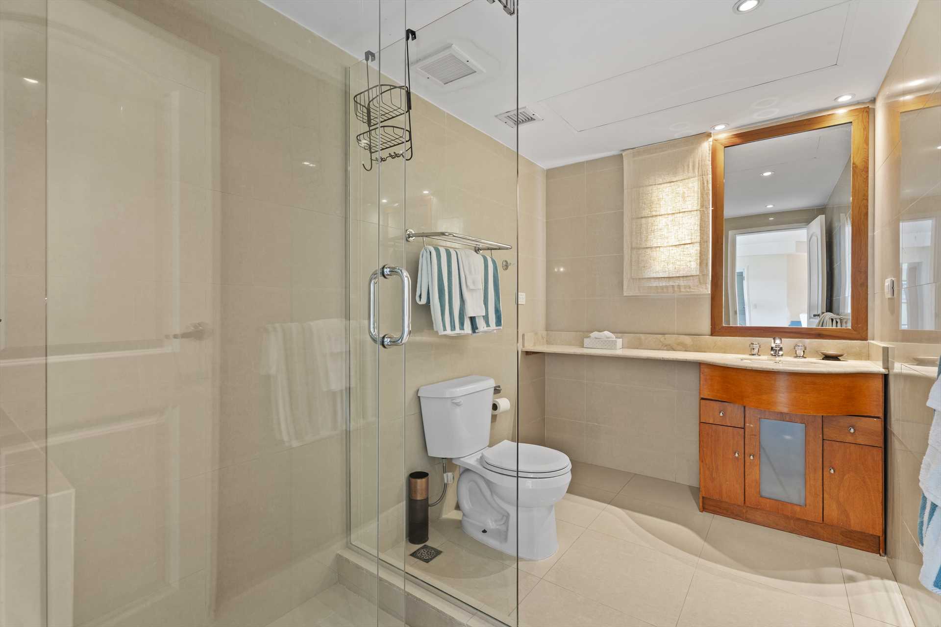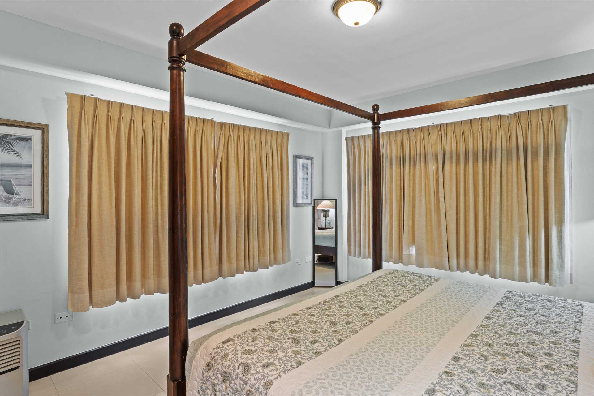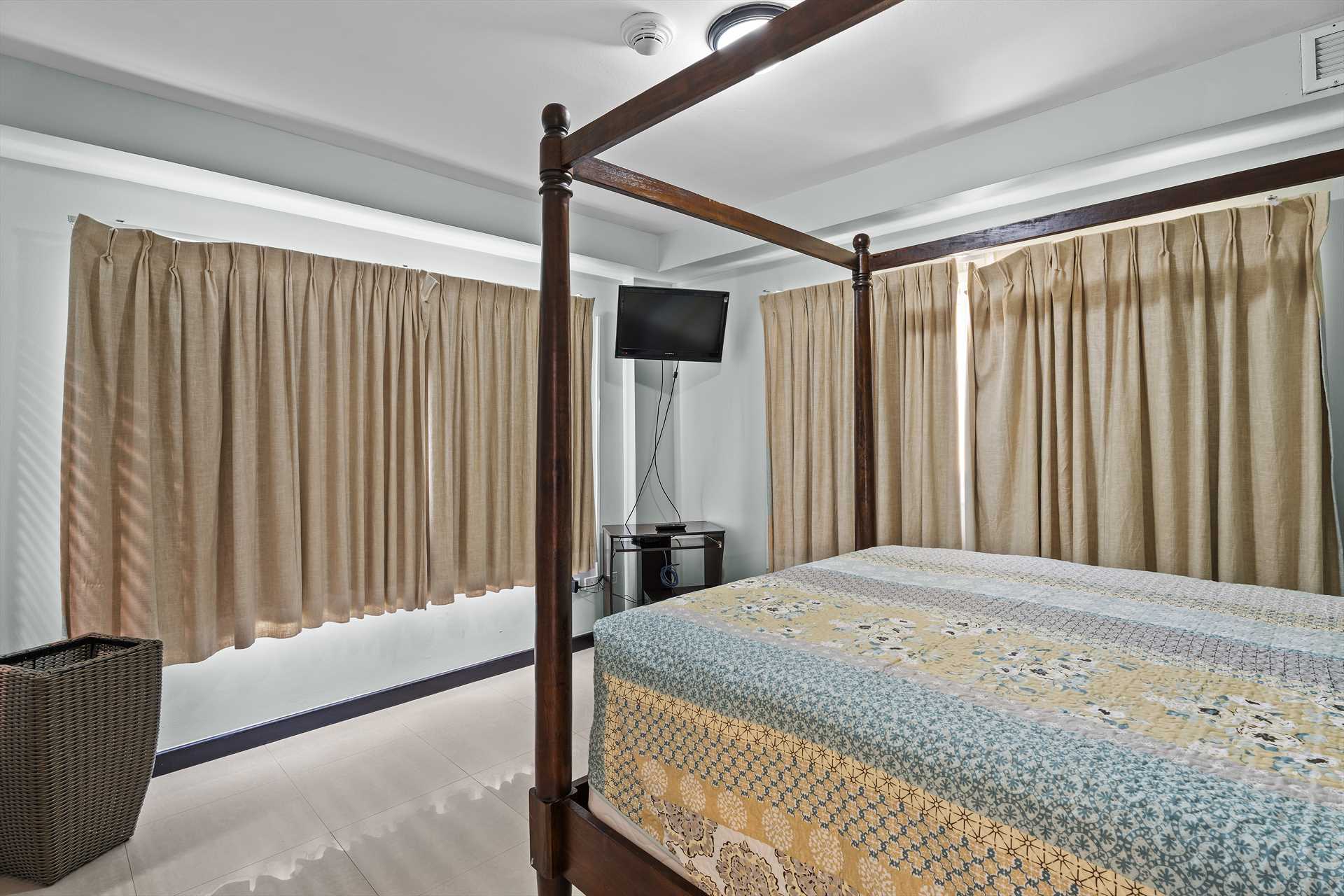 The primary bedroom with views of the ocean and the resort pool and is equipped with a king-size canopy bed, TV, walk-in closet, and en-suite bathroom with shower. The second bedroom with oecan view and has a queen-size canopy bed, TV, built-in closets. A second full bathroom with shower is also available.