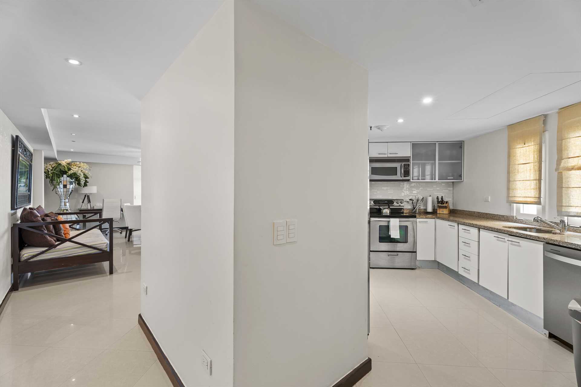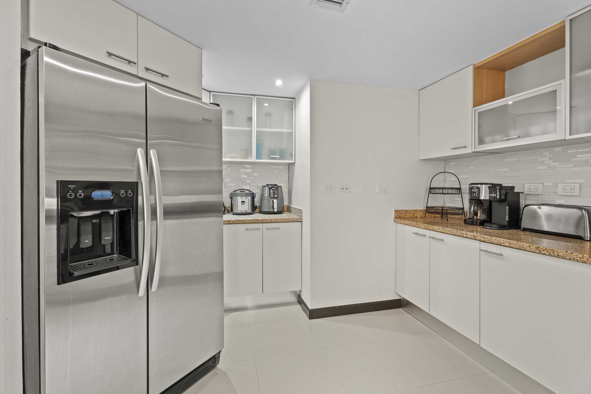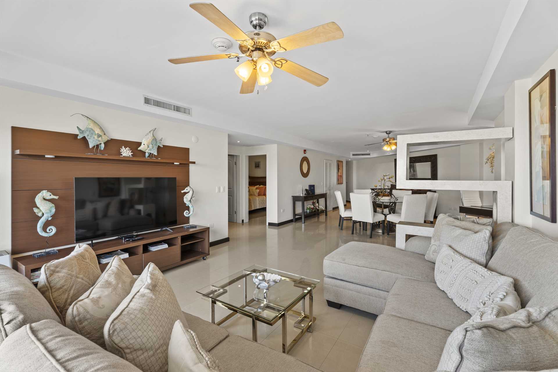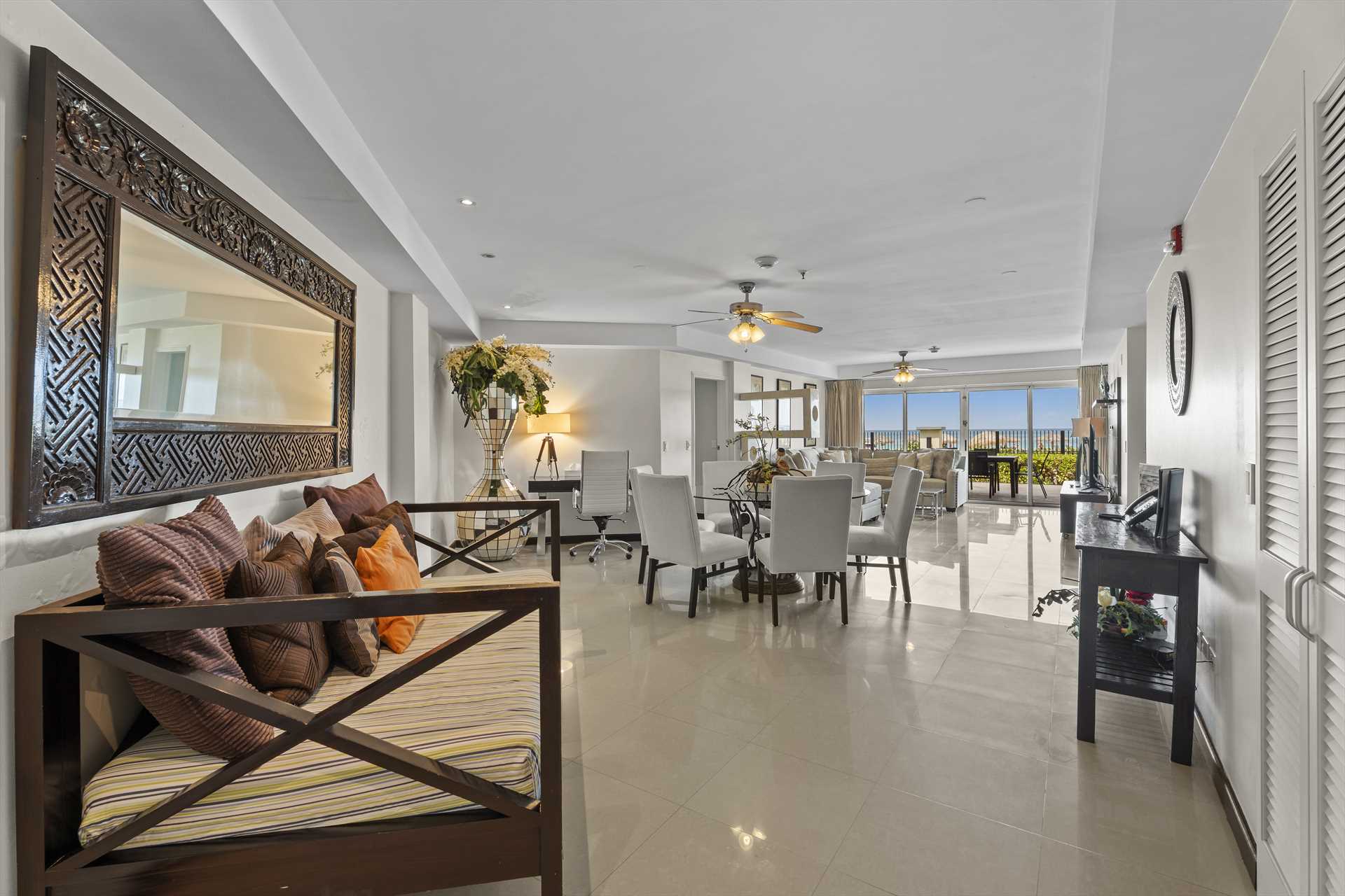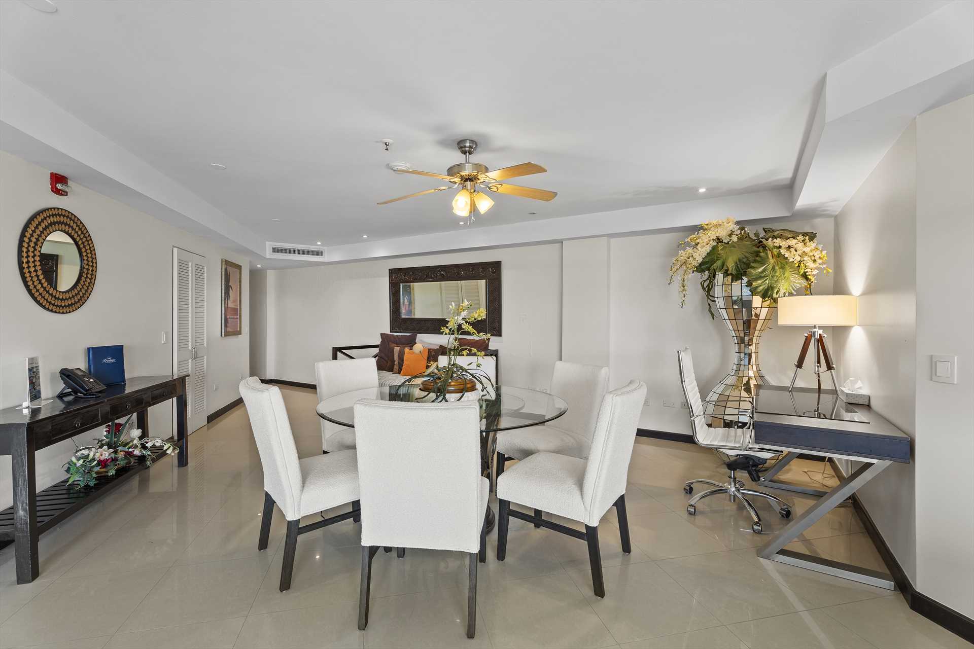 The primary bedroom with views of the ocean and the resort pool and is equipped with a king-size canopy bed, TV, walk-in closet, and en-suite bathroom with shower. The second bedroom with oecan view and has a queen-size canopy bed, TV, built-in closets. A second full bathroom with shower is also available.