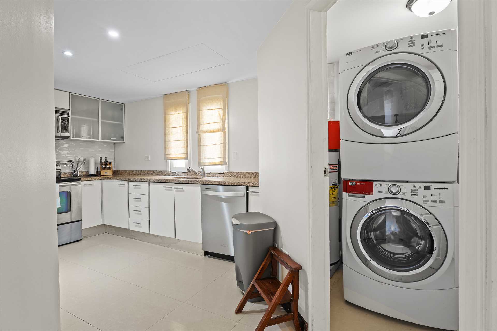 Inside, the main living area includes a U-shaped sectional sofa with chaise, a round 6-person dining table, a daybed with a single-size mattress, and a desk with chair. The enclosed kitchen is fully equipped, and there is a laundry room with a washer and dryer.