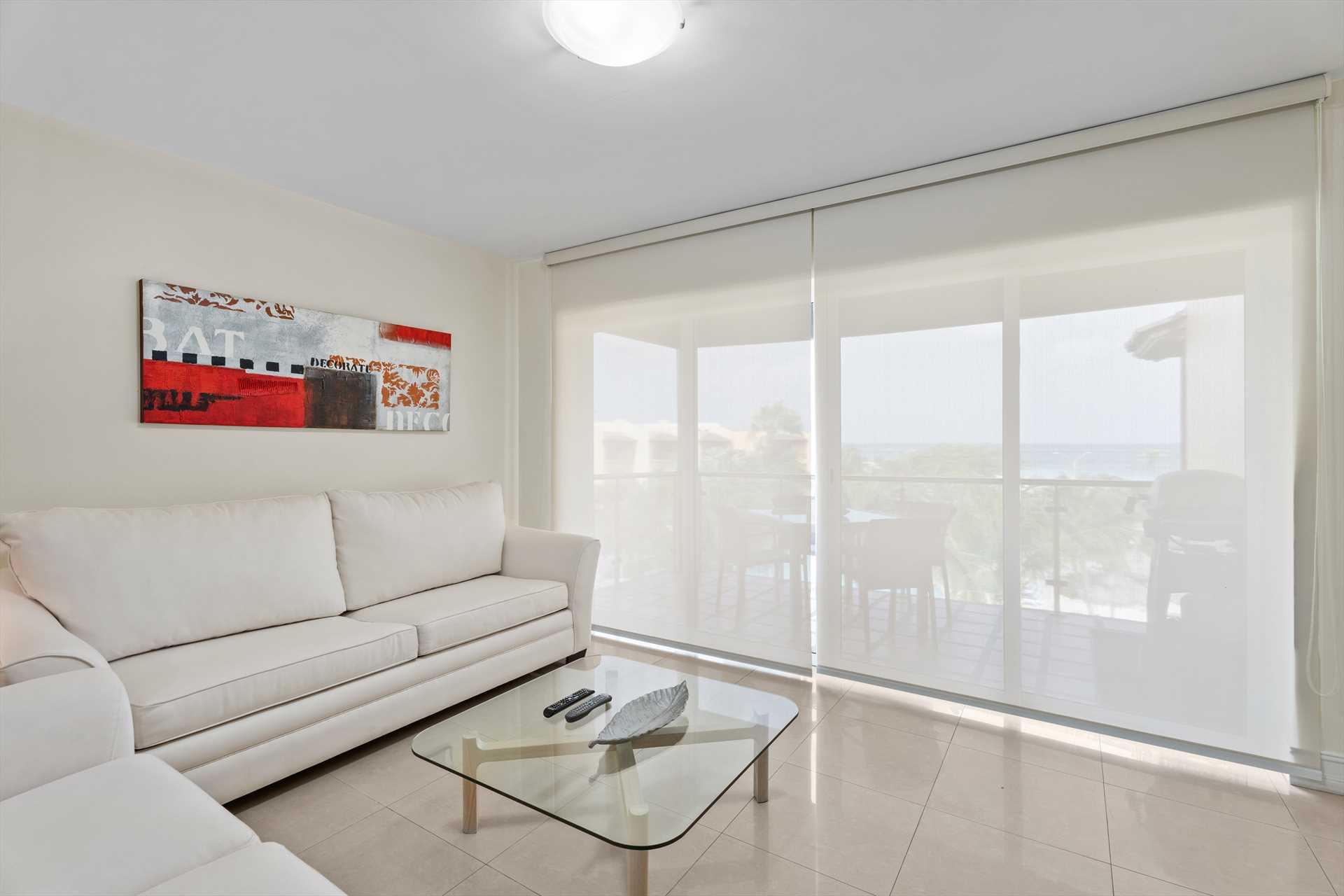 The living room balcony offers a 4-seat dining table and BBQ grill with ocean and resort views, perfect for enjoying the Aruba weather or outdoor dining. The living room has a queen-size sofa-bed with an extra 2-seat sofa, a TV, and sliding doors leading to a balcony with an ocean view. There is also a fully equipped kitchen and a 6-seat glass dining table. The hallway leads to all bedrooms, bathrooms, a beach amenities closet, and a laundry closet with a washer and dryer.