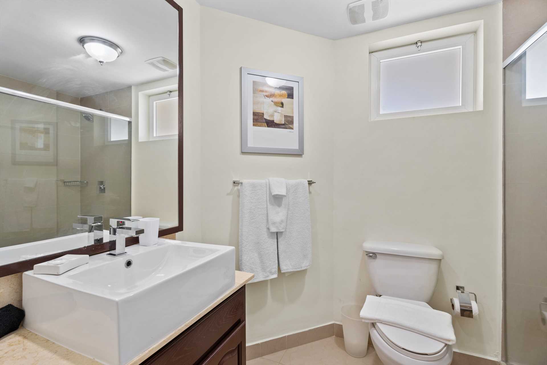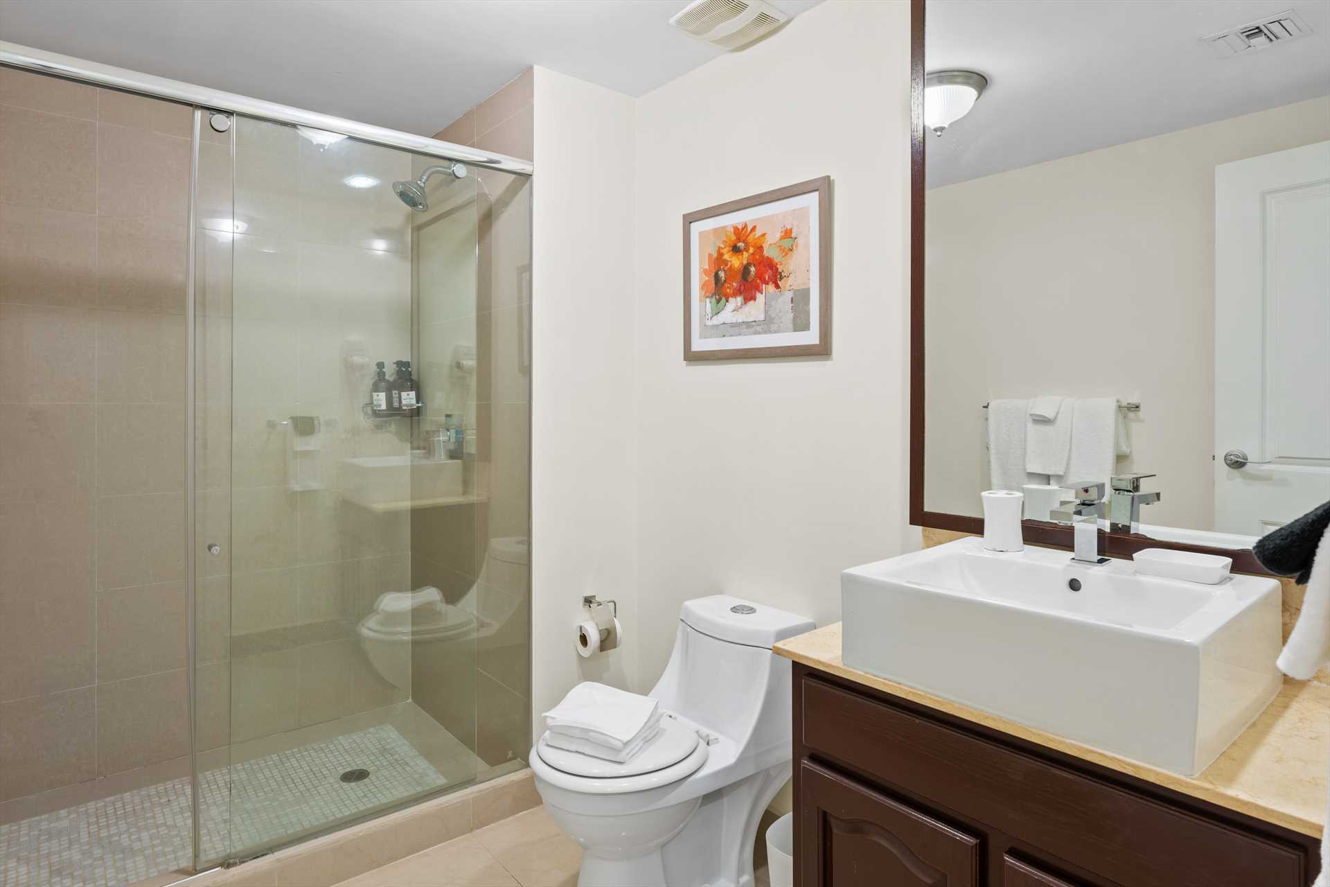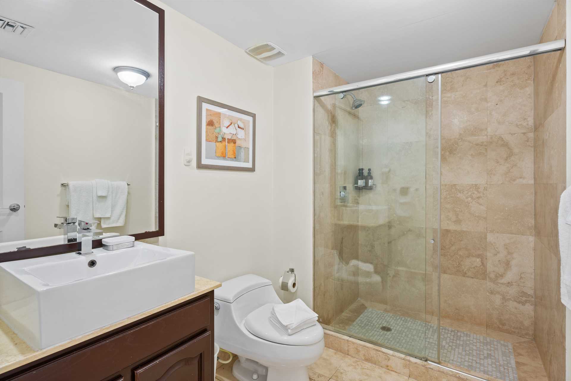 The primary bedroom has a king-size bed, a TV, 2 chairs, built-in closets, and a balcony with an ocean view. The primary bedroom has an en-suite bathroom with a shower. The second bedroom has a king-size bed, a TV, a built-in closet, and a full-size folding sleeper sofa. The second bedroom also has an en-suite bathroom with a shower. The third bathroom with a shower is situated in the hallway.