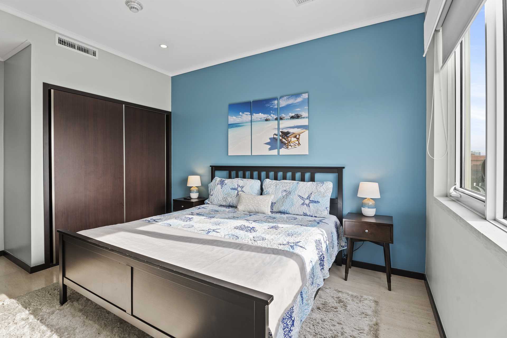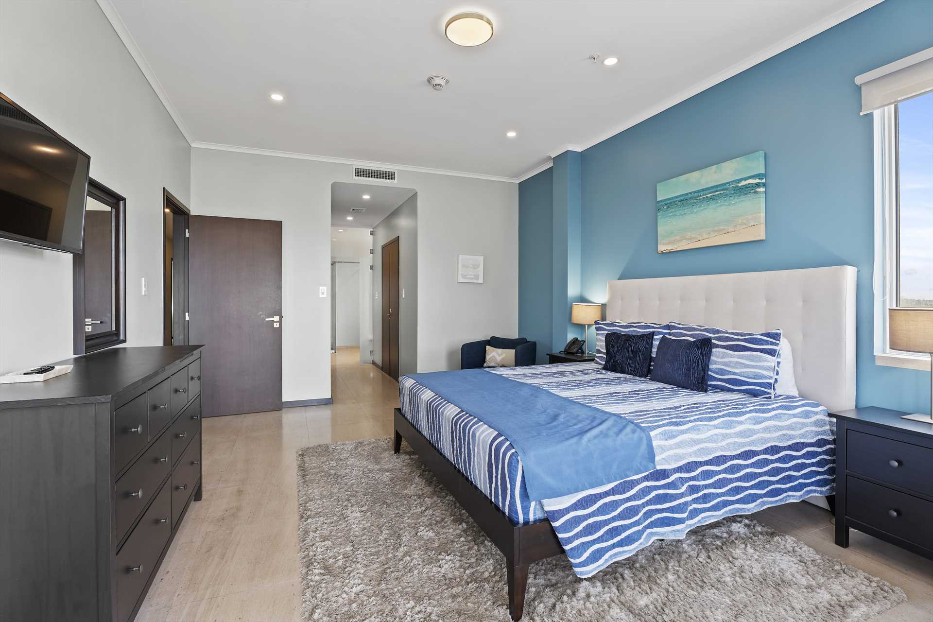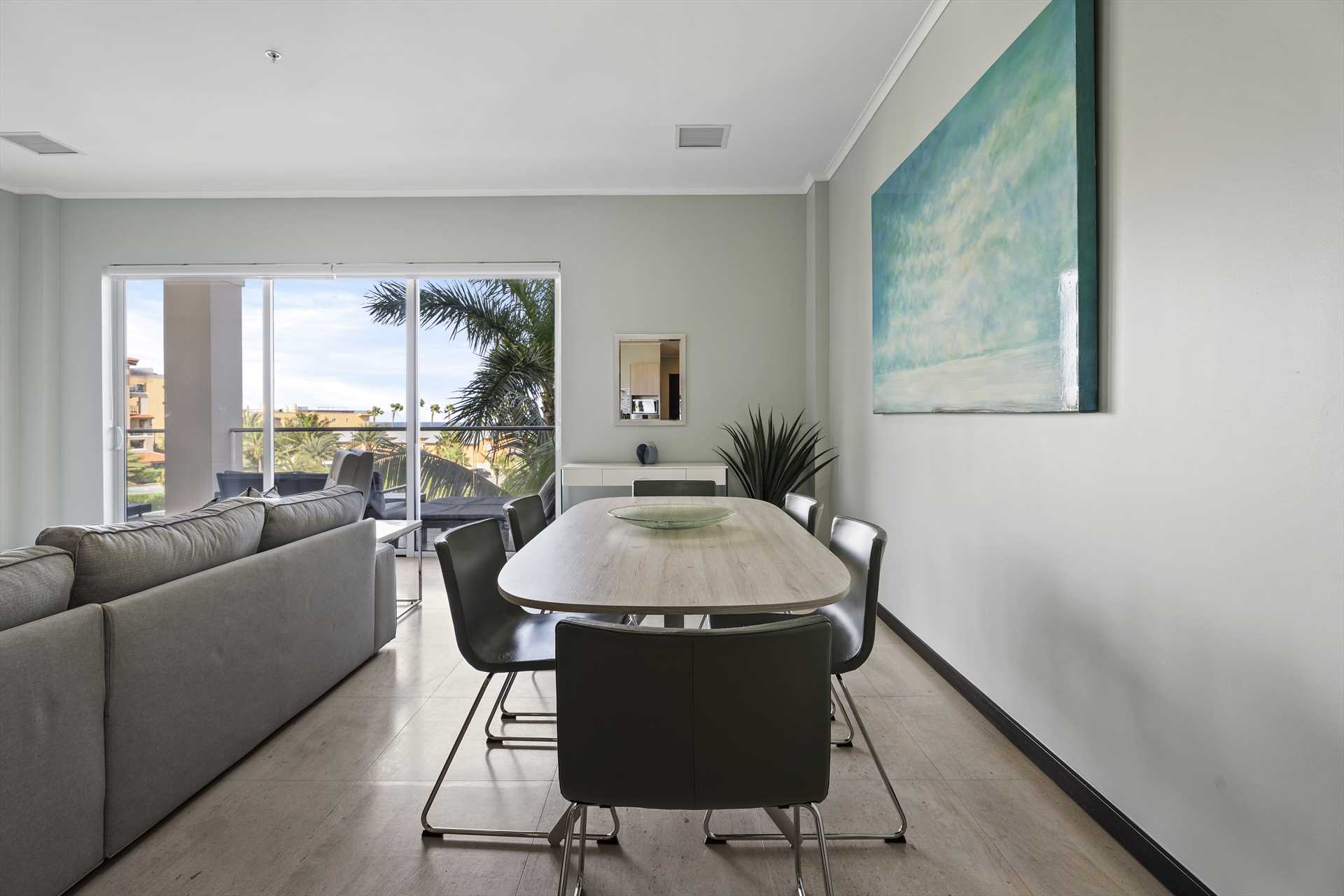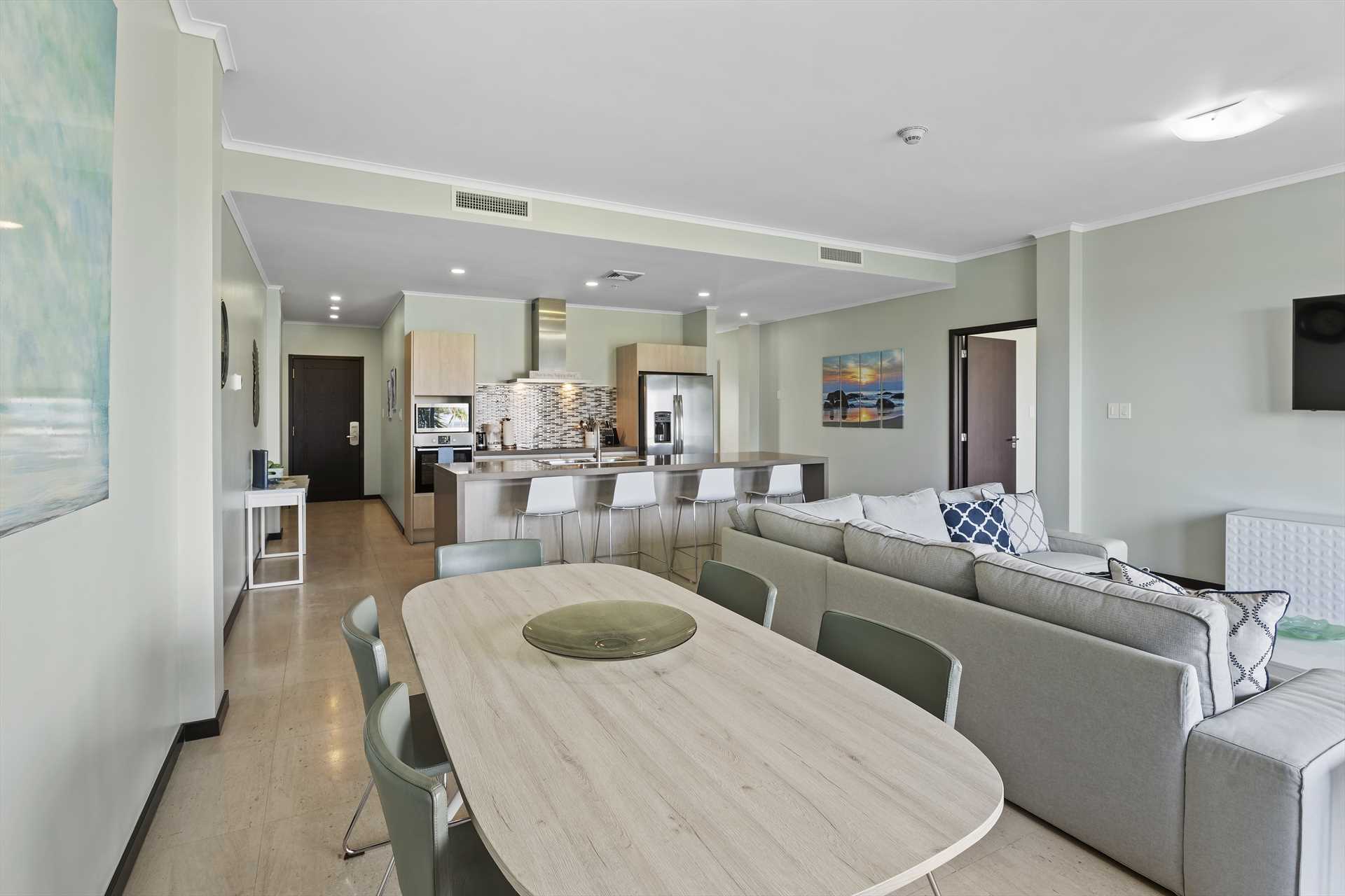 The spacious, open plan living area comes with a fully-equipped kitchen and a large center island with 4-barstools. The living area boasts a 5-seat corner sectional sofa, an armchair, a chair with an ottoman, a 55" Smart TV (Netflix enabled), a 6-seat dining table and access to the balcony with stunning views. The hallway lends access to a half-bathroom and laundry room with a washer and dryer. The blue and green decorations against the neutral modern furnishings in the living area are a seamless reflection of the sea and sands that await outside.