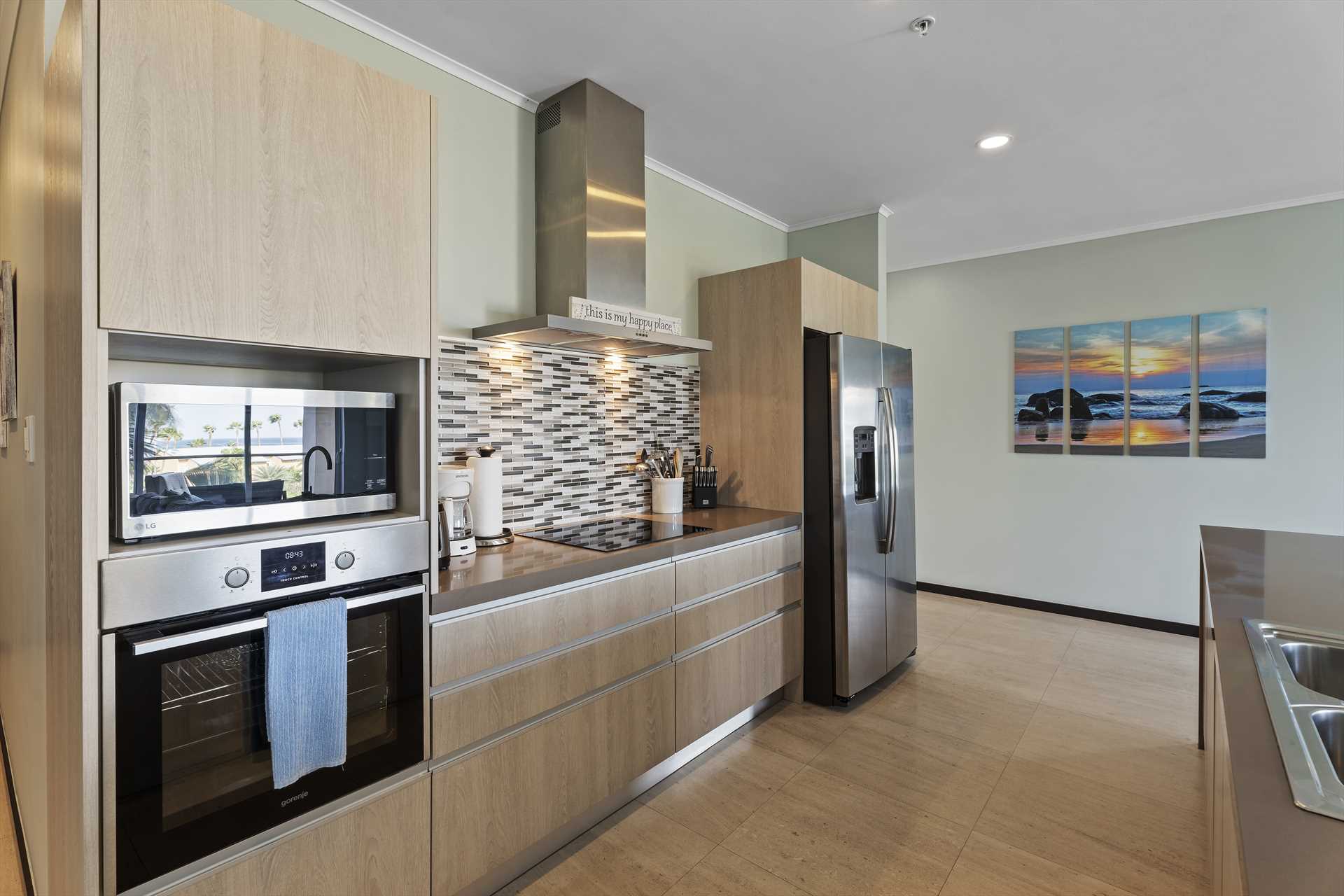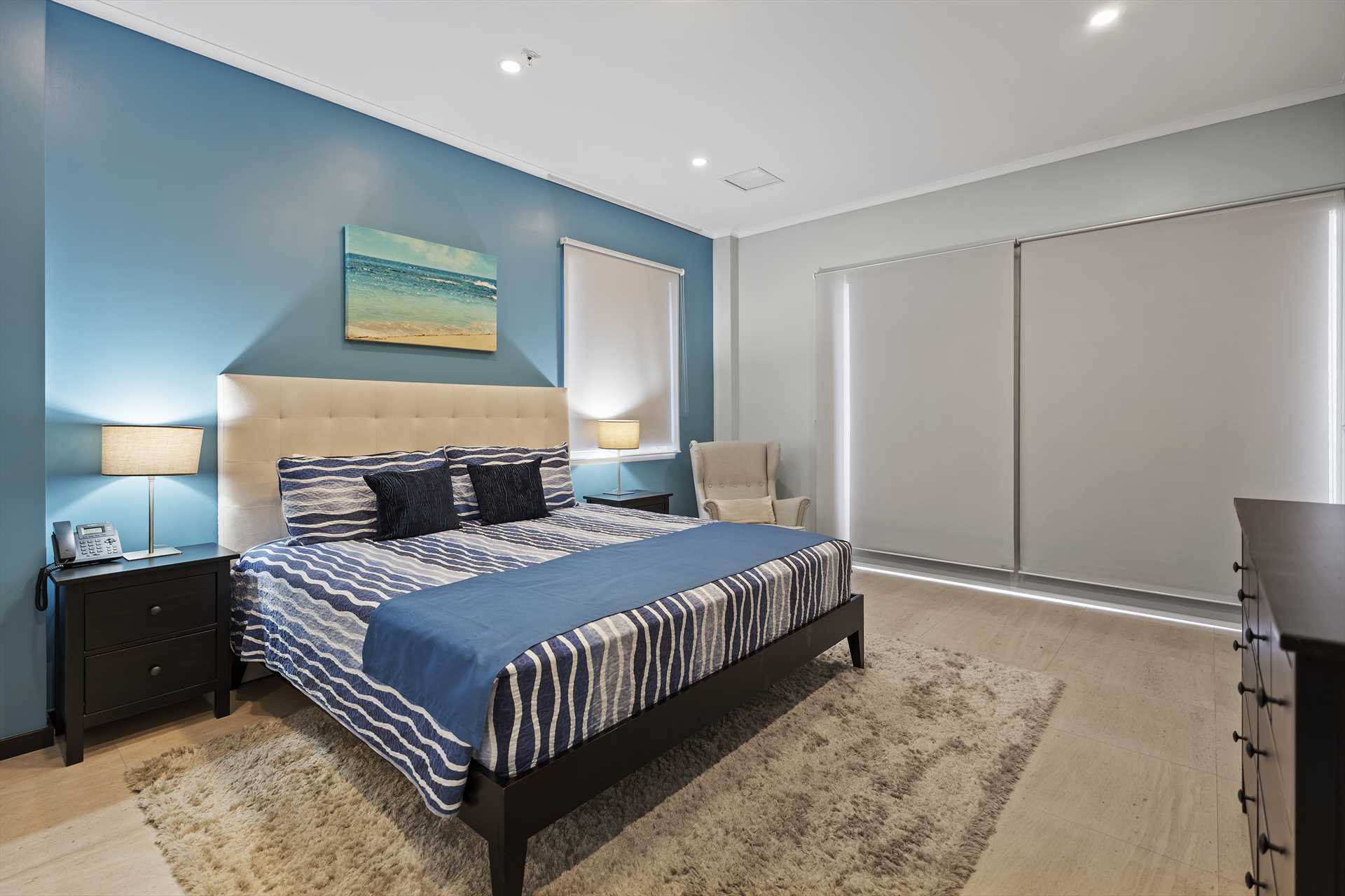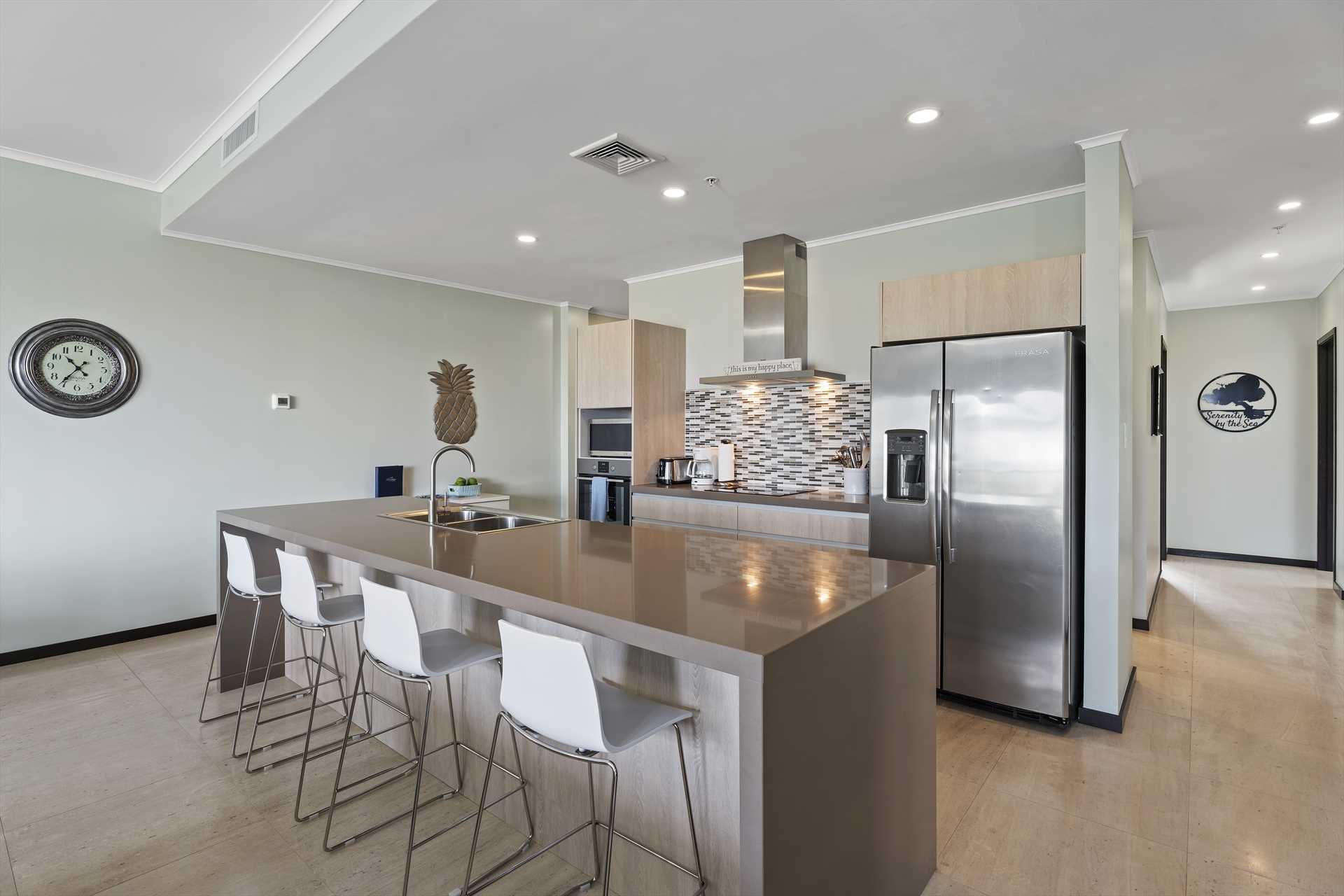 The spacious, open plan living area comes with a fully-equipped kitchen and a large center island with 4-barstools. The living area boasts a 5-seat corner sectional sofa, an armchair, a chair with an ottoman, a 55" Smart TV (Netflix enabled), a 6-seat dining table and access to the balcony with stunning views. The hallway lends access to a half-bathroom and laundry room with a washer and dryer. The blue and green decorations against the neutral modern furnishings in the living area are a seamless reflection of the sea and sands that await outside.