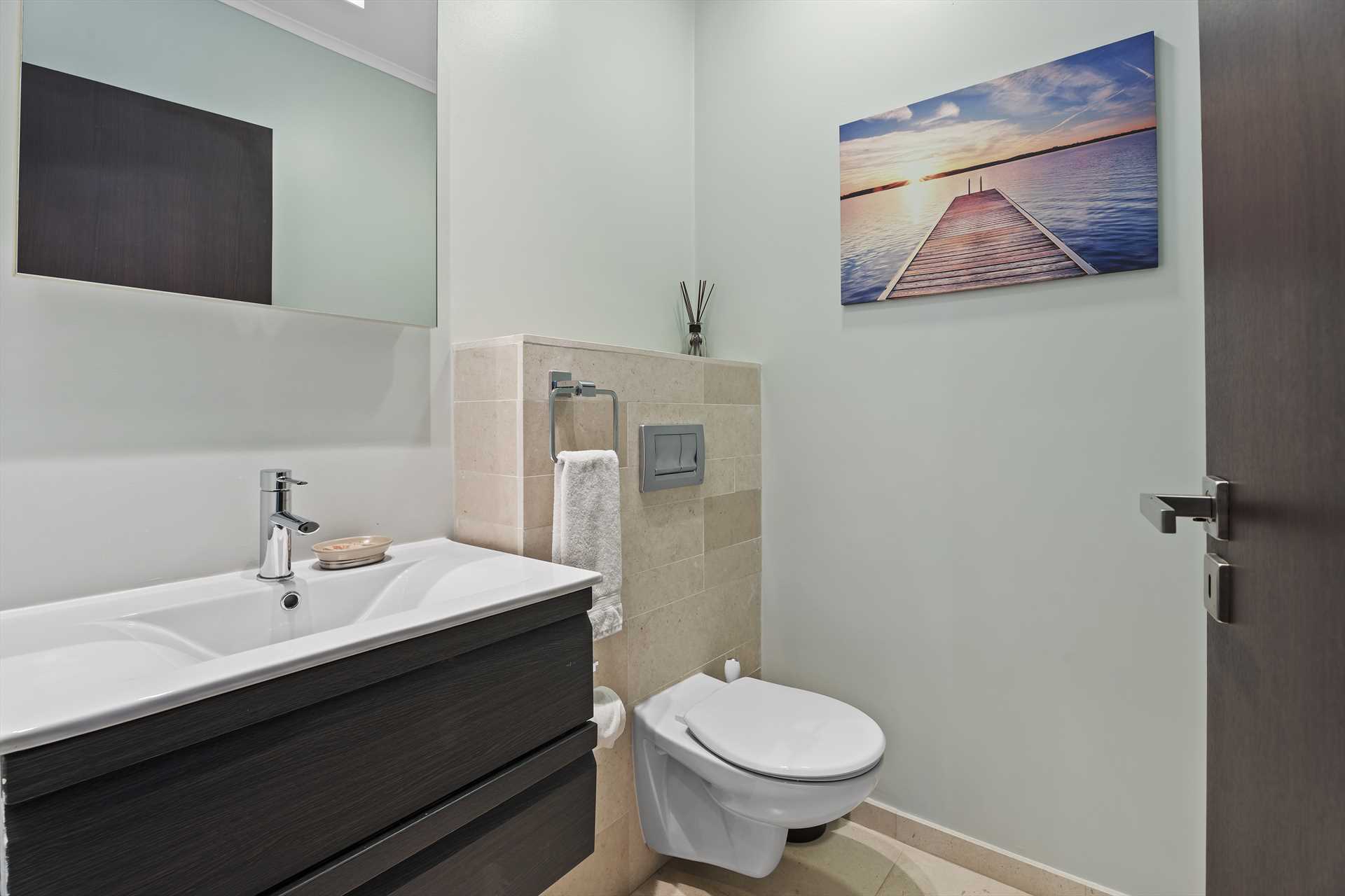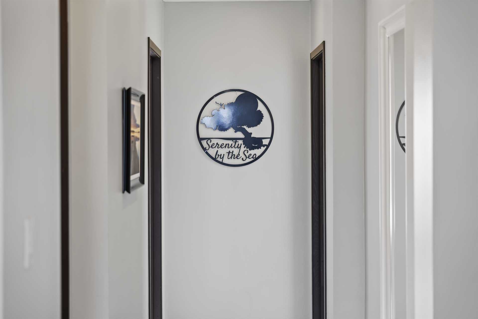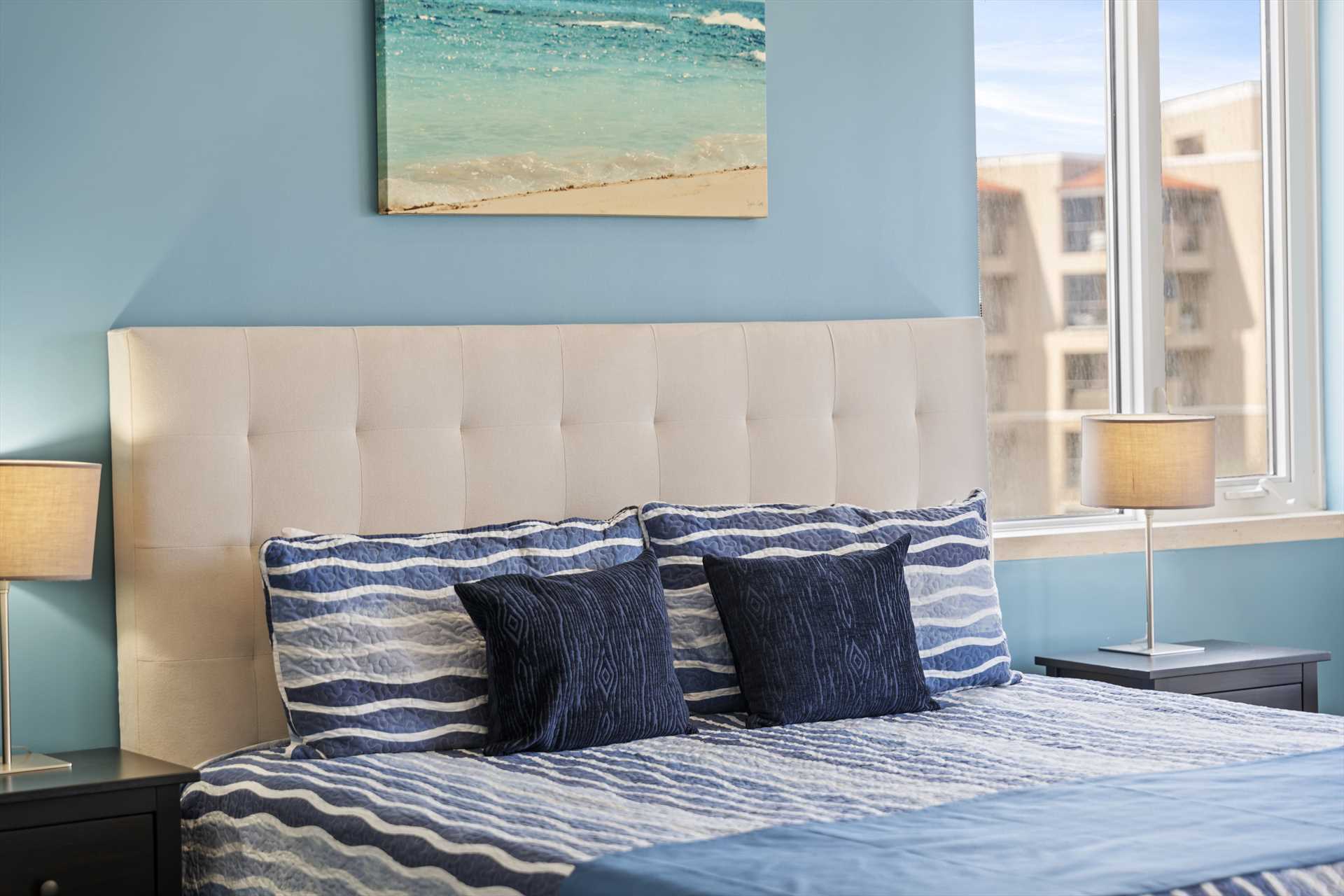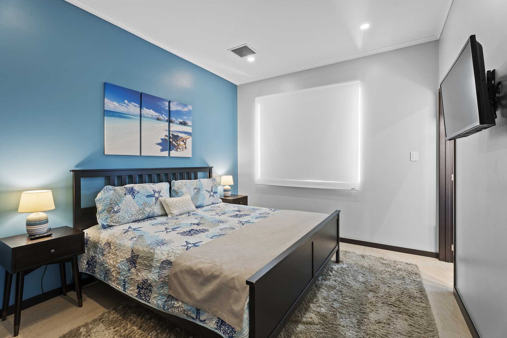 The spacious, open plan living area comes with a fully-equipped kitchen and a large center island with 4-barstools. The living area boasts a 5-seat corner sectional sofa, an armchair, a chair with an ottoman, a 55" Smart TV (Netflix enabled), a 6-seat dining table and access to the balcony with stunning views. The hallway lends access to a half-bathroom and laundry room with a washer and dryer. The blue and green decorations against the neutral modern furnishings in the living area are a seamless reflection of the sea and sands that await outside.
