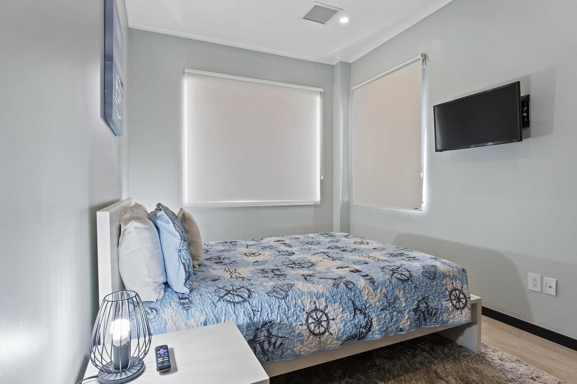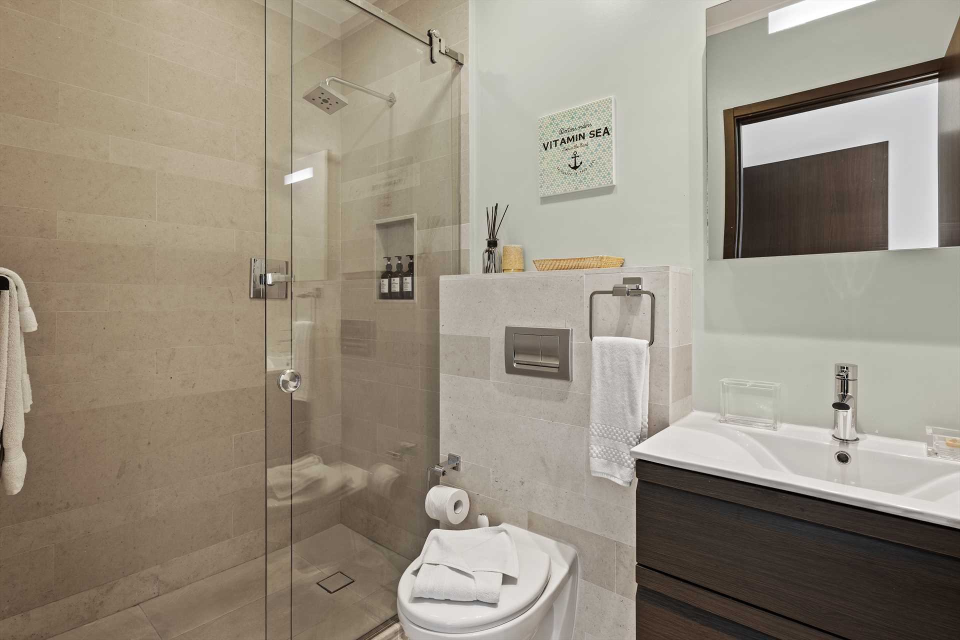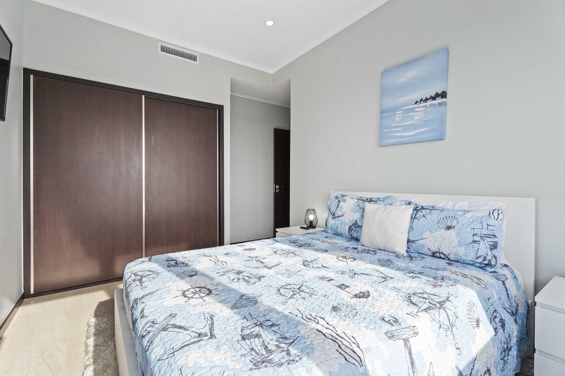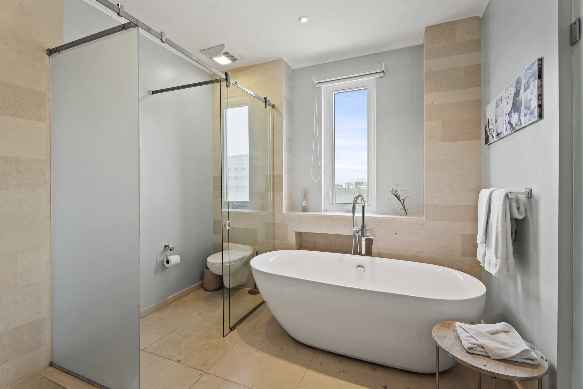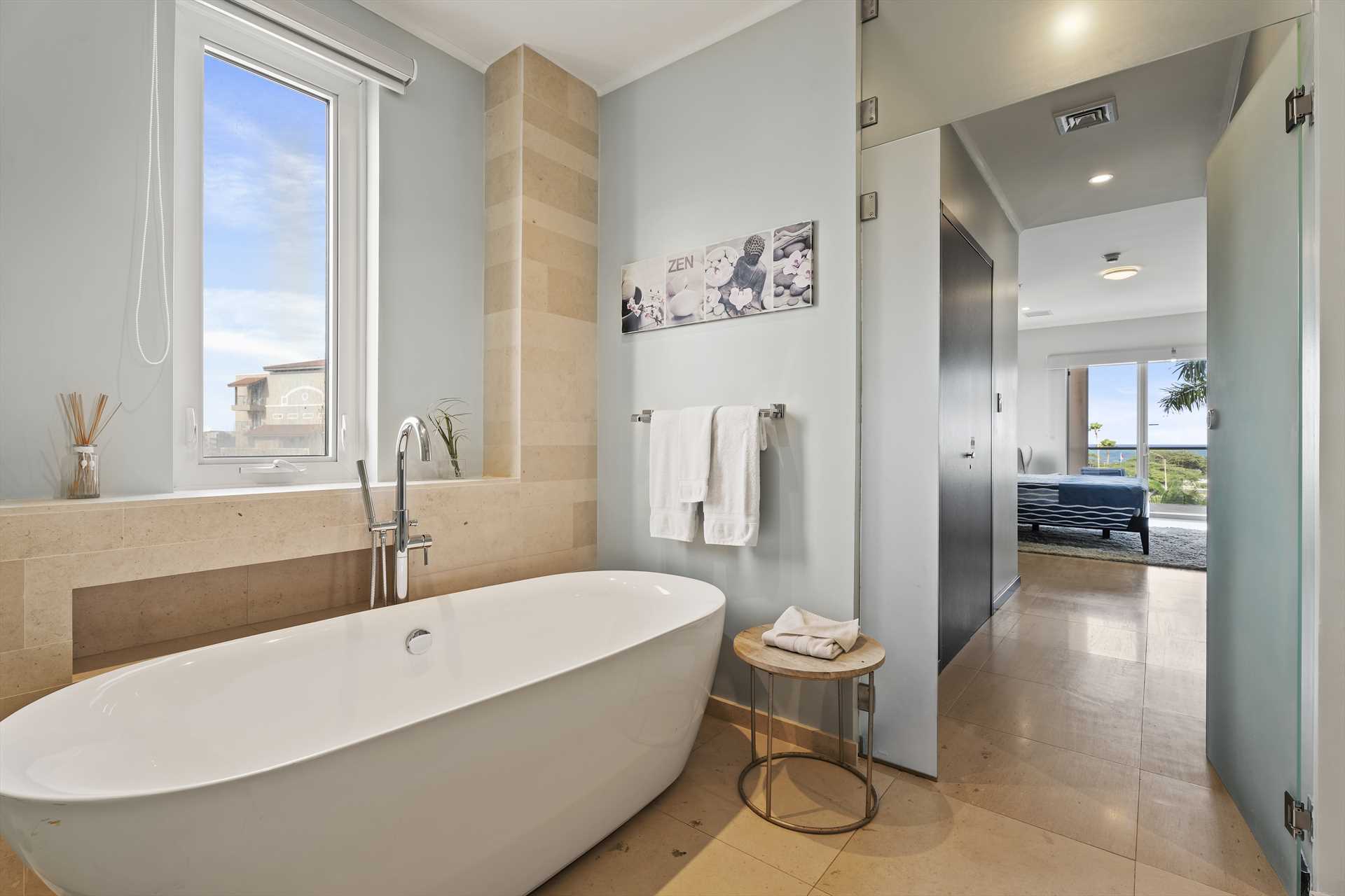 The primary bedroom has a king-size bed, a 32" TV, a walk-in closet, an armchair and access to the balcony with stunning views. The primary bedroom has a modern en-suite bathroom with a 2-sink vanity, a glass-enclosed shower and toilet, and a free-standing bathtub to soak and unwind during your stay. The second bedroom has a king-size bed, a TV, a built-in closet and a full modern en-suite bathroom. And the third bedroom has a queen-size bed, a TV, a built-in closet and a full modern en-suite bathroom.