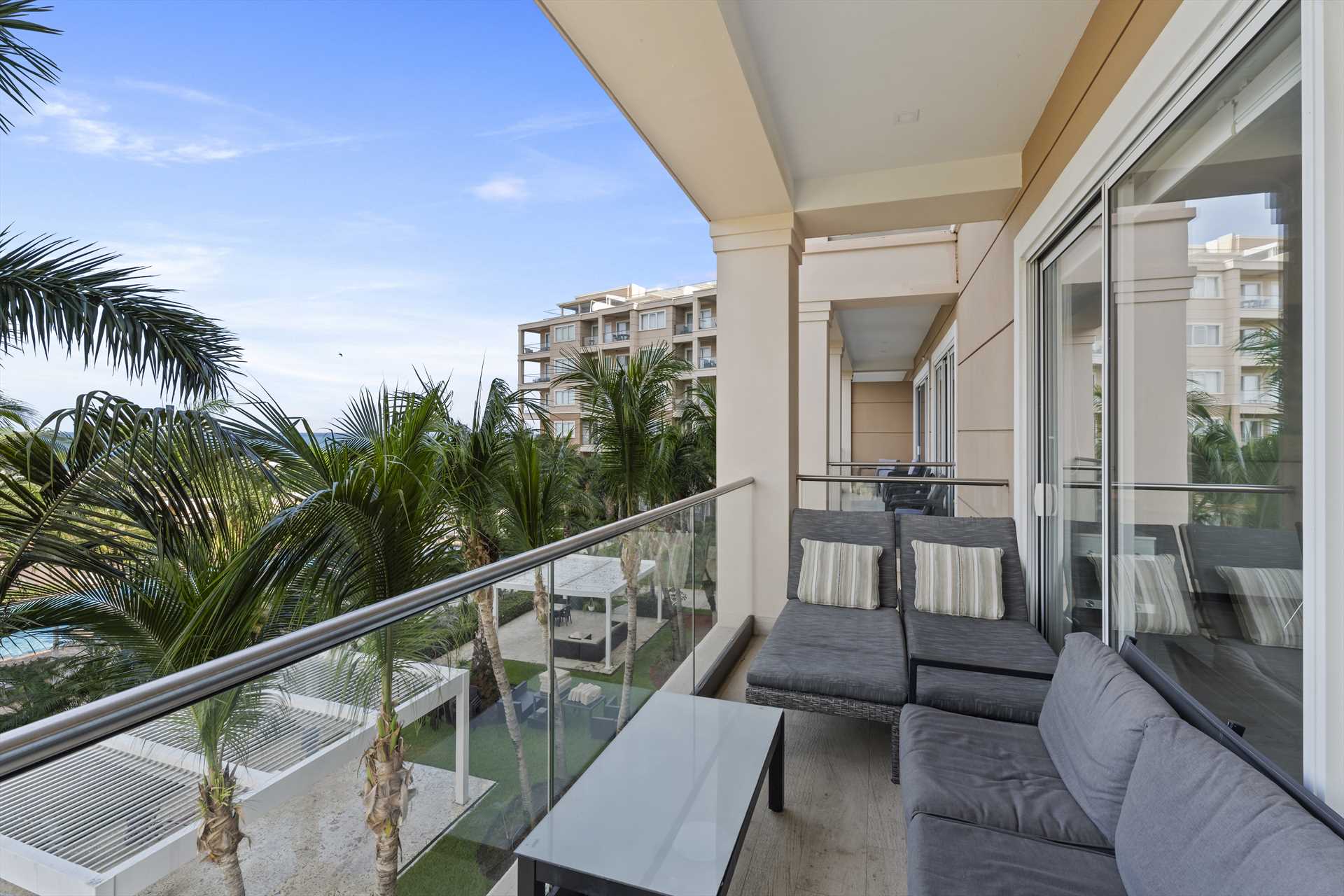Wake up to spectacular views of Eagle Beach in the Serenity by the Sea Three-bedroom condo; a luxurious vacation rental accommodation located at the LeVent Beach Resort Aruba, the newest vacation rental resort on the island of Aruba! Featuring a balcony stretching across the living room and primary bedroom with tropical views of the resort's luscious landscaping and the award-winning Eagle Beach, just a few steps away. The balcony is complete with comfortable furniture to enjoy the Aruban weather any time of day and spectacular sunsets.