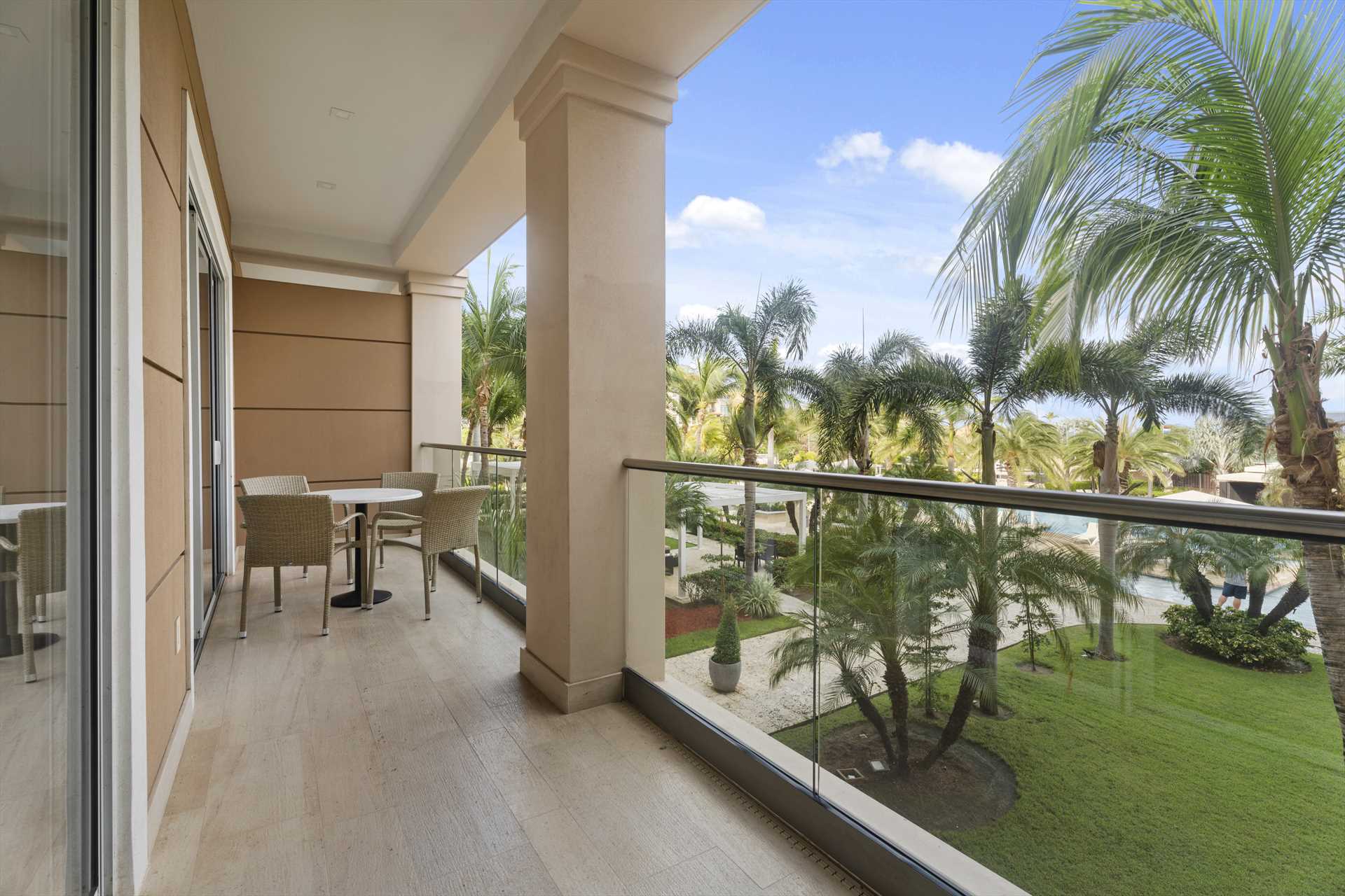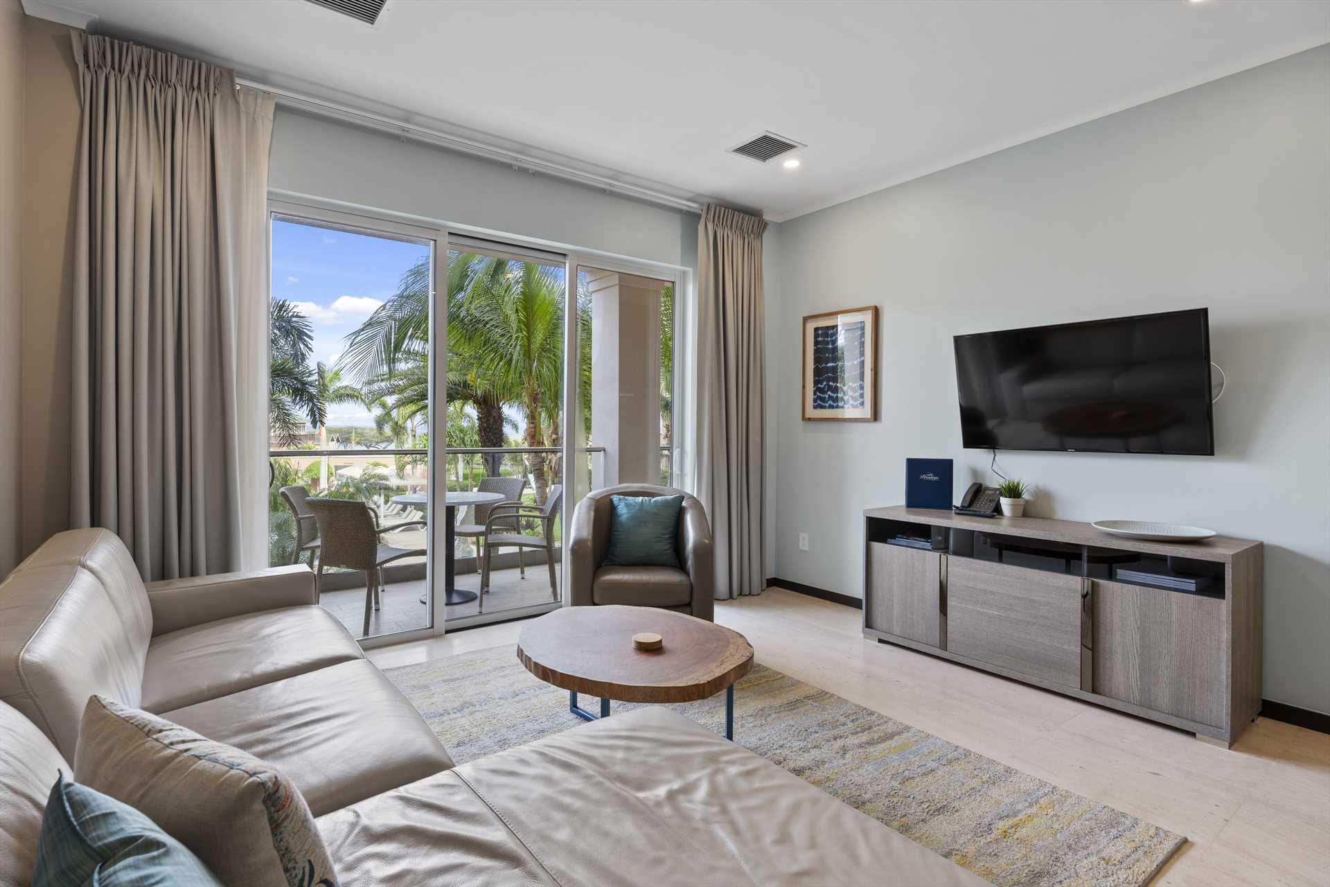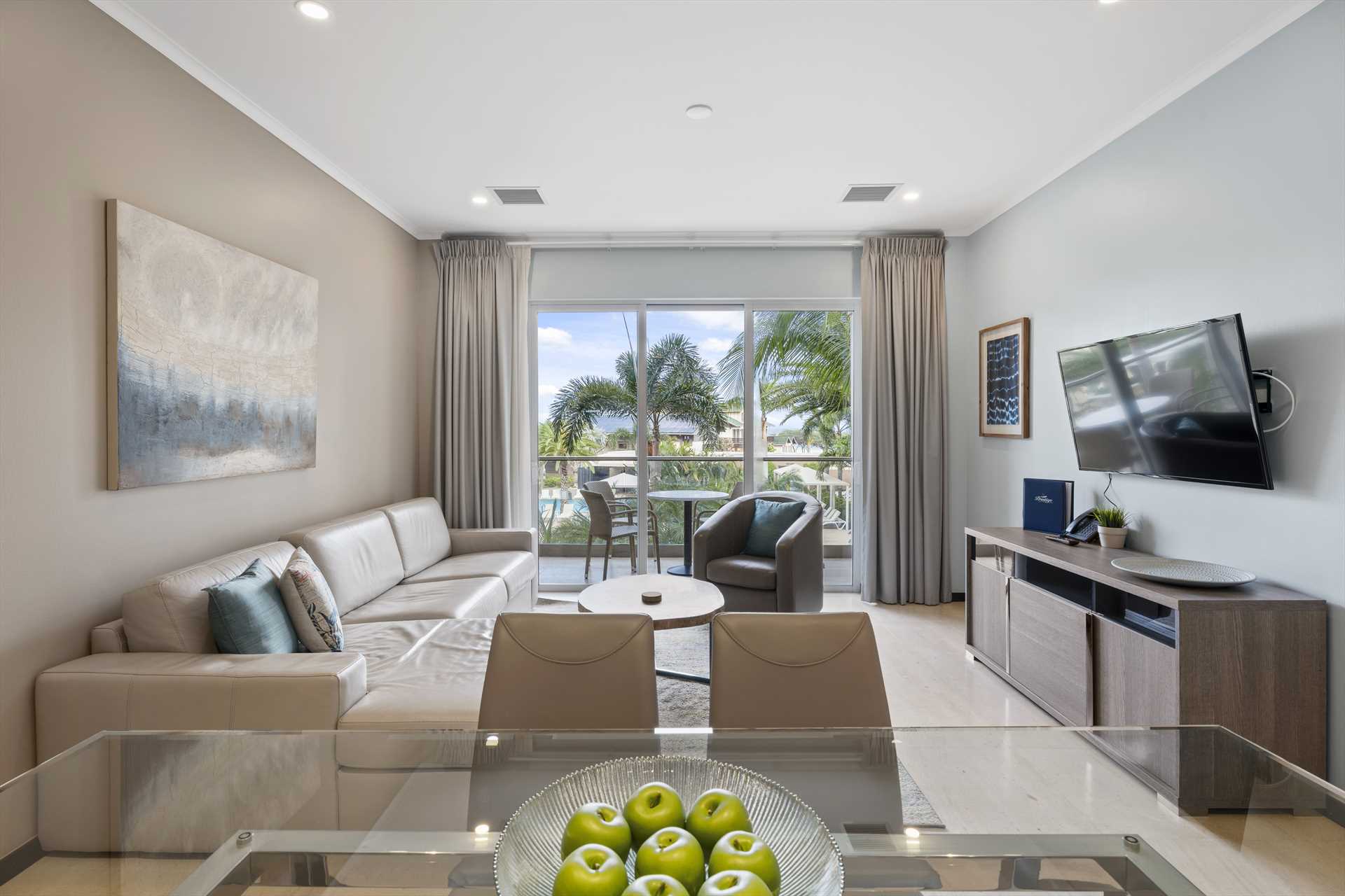 The Imperial Blossom Two-bedroom condo is a luxury vacation rental accommodation with stunning views located at the Le Vent Beach Resort Aruba. There is a balcony stretching across the living room and primary bedroom with luscious tropical views of the resort. The balcony is completed with a 4-seat dining table to enjoy your culinary delights or just to relax and savor the Caribbean breeze.