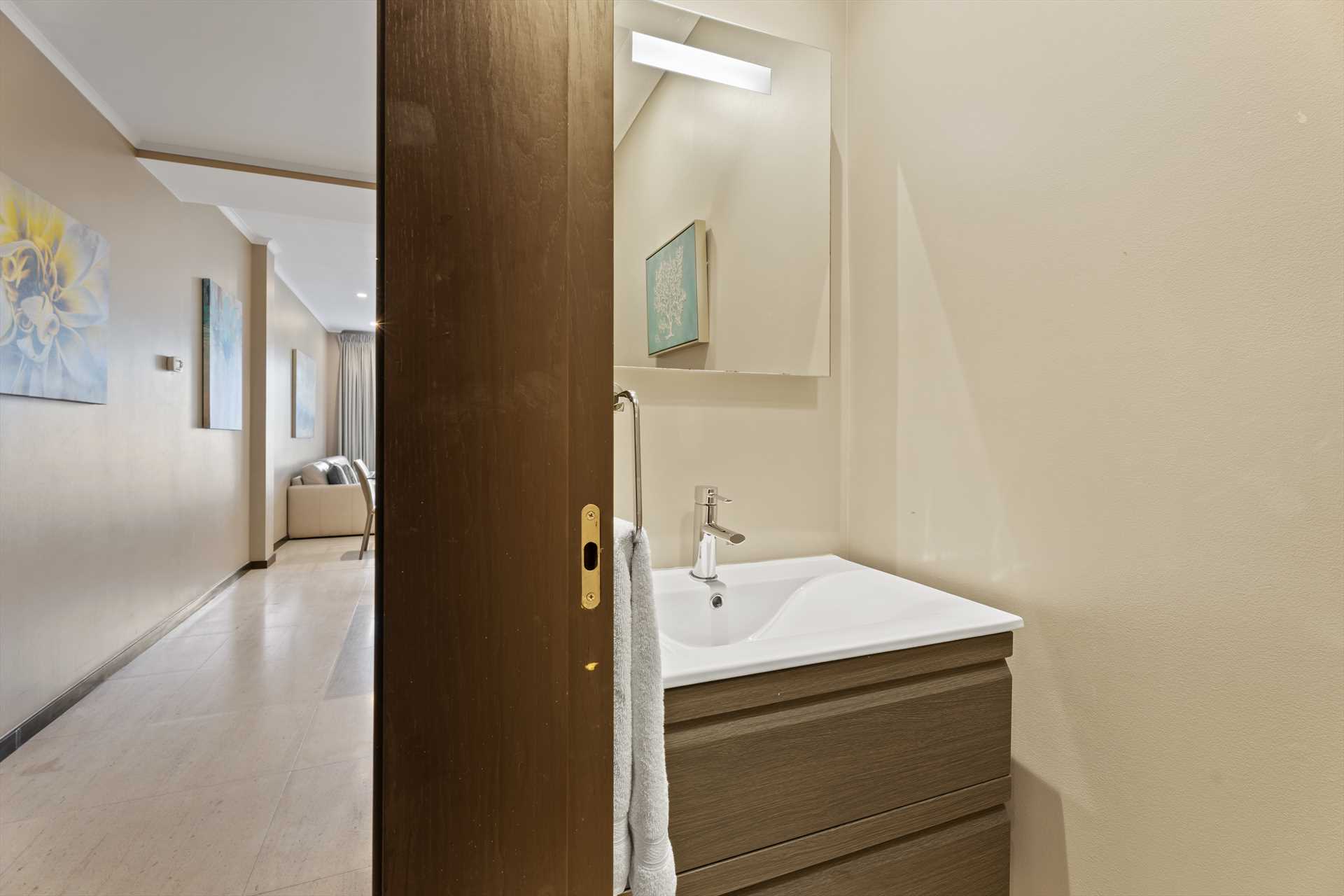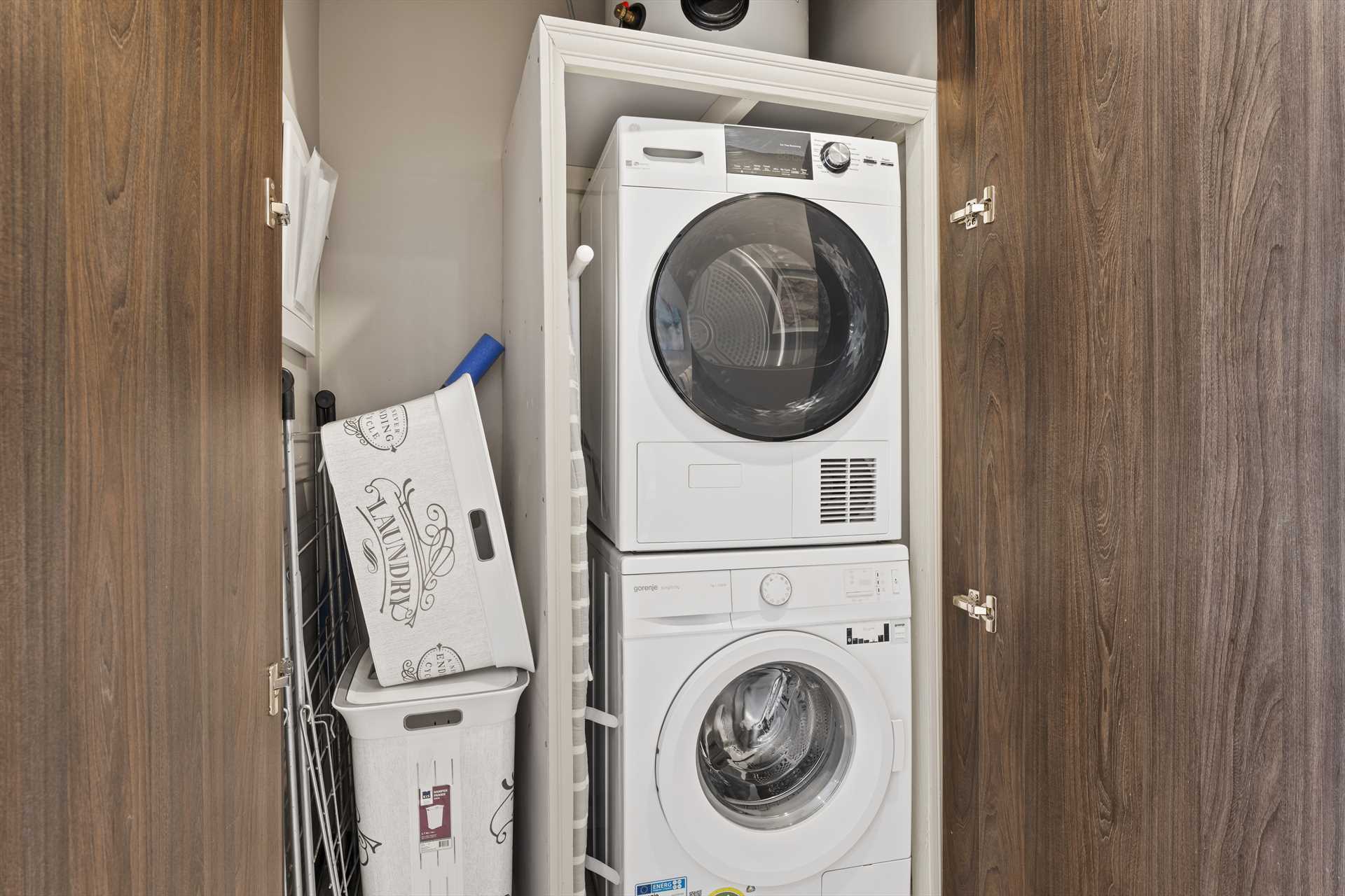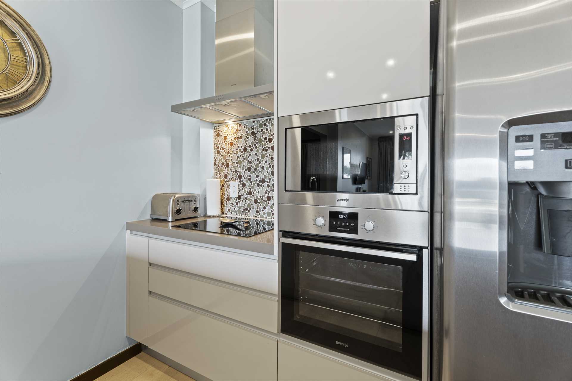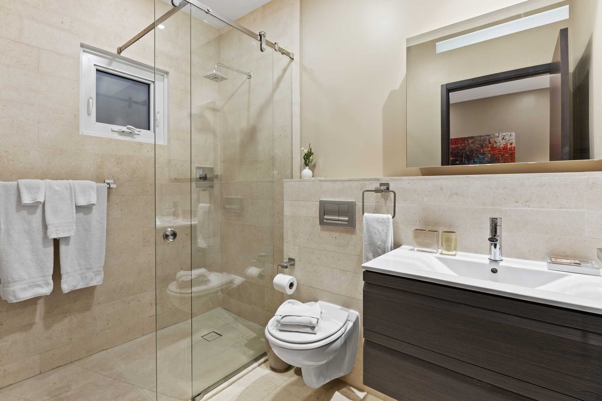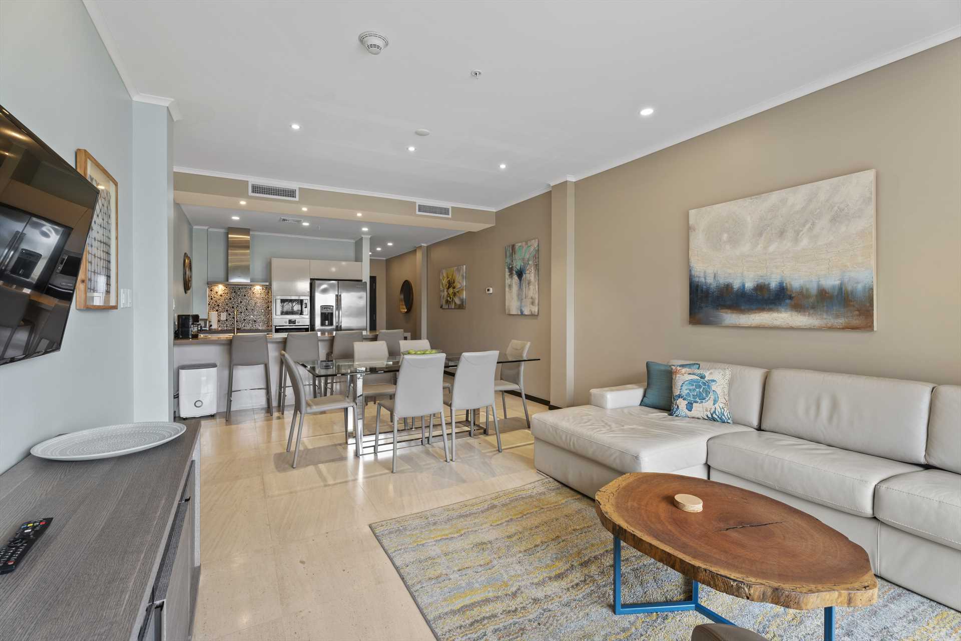 The open plan living area is provided with a large TV, a leather sofa-bed (with a double-size mattress), a 6-seat dining table and a full-sized fully equipped modern kitchen with 4-barstools. The entrance hallway lends access to a half bathroom. There is also a washer and dryer available.