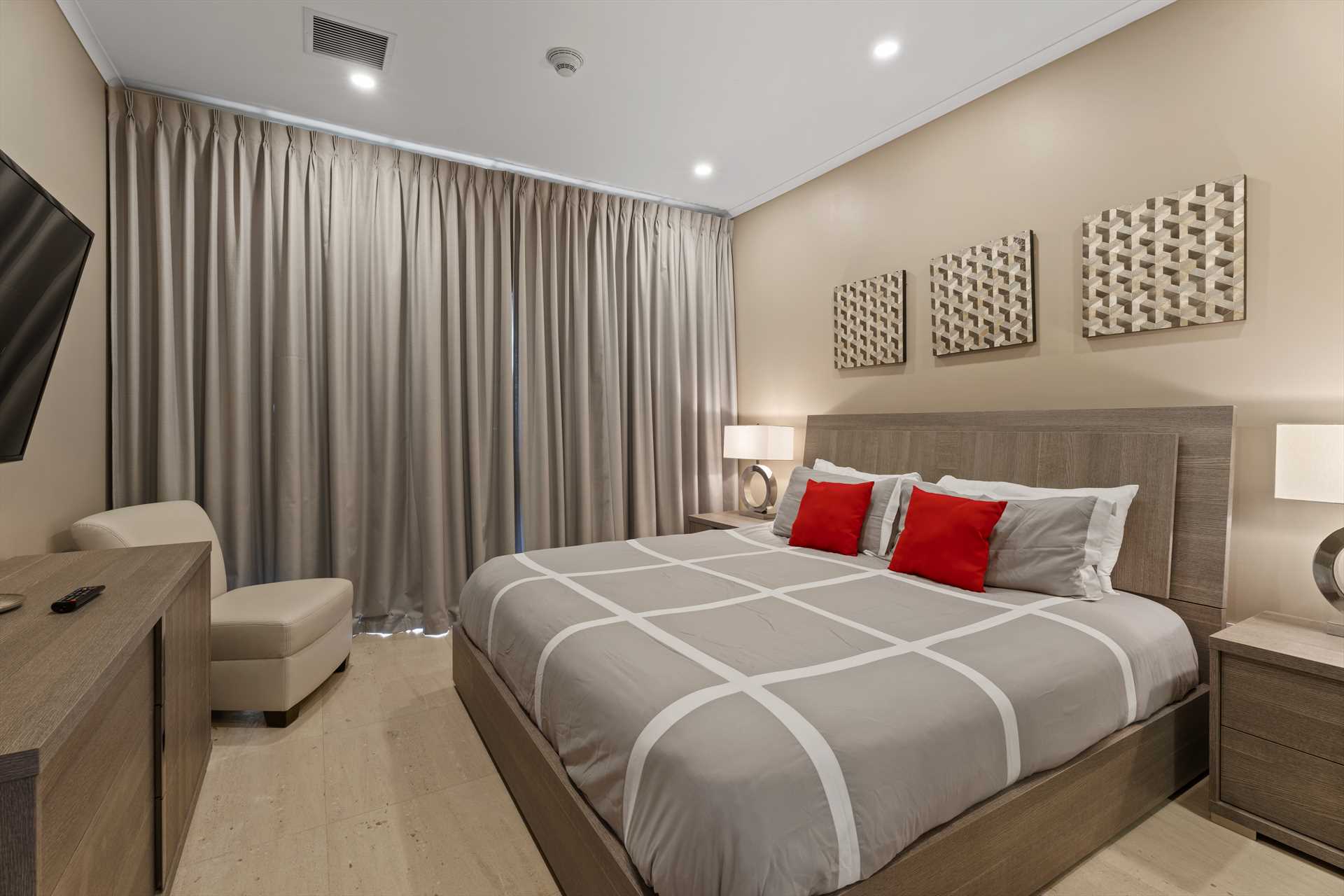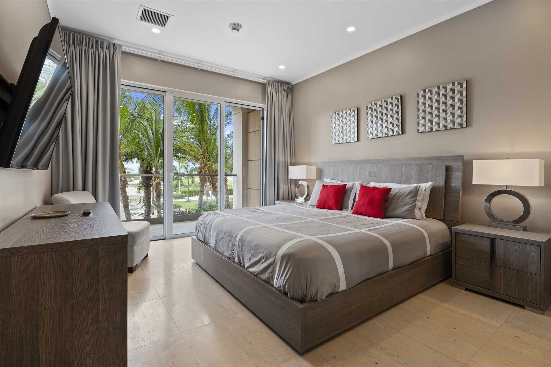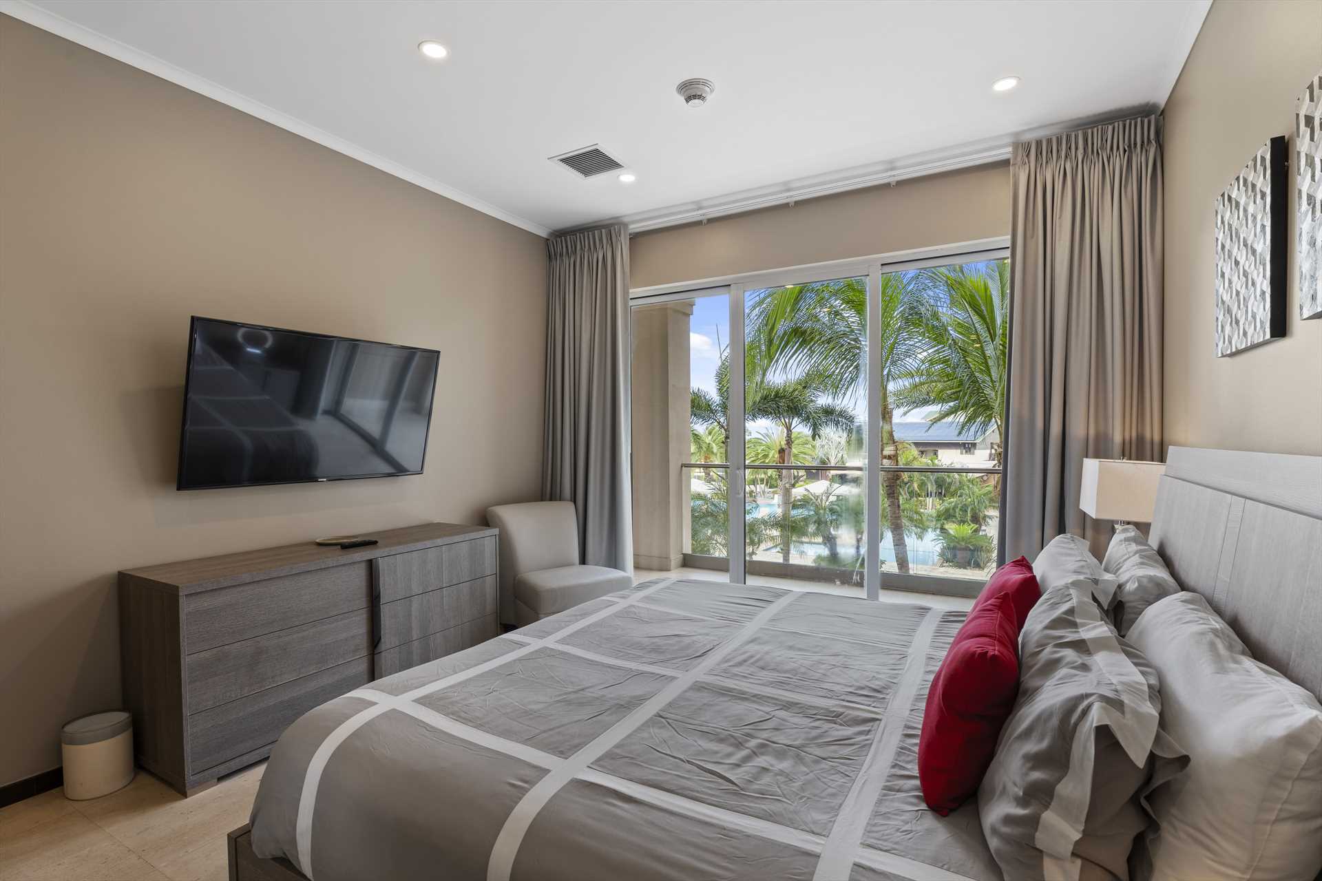 The primary bedroom has a king-size bed, a TV, built-in closets, a chair and access to the balcony with tropical views. The primary bedroom has a full modern en-suite bathroom. The second bedroom has a queen-size bed, a TV, and built-in closets. The second bedroom also offers a full modern en-suite bathroom.