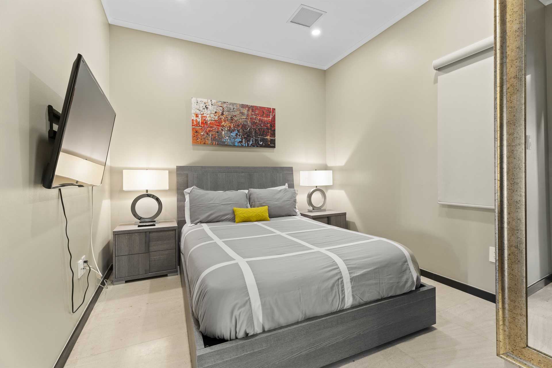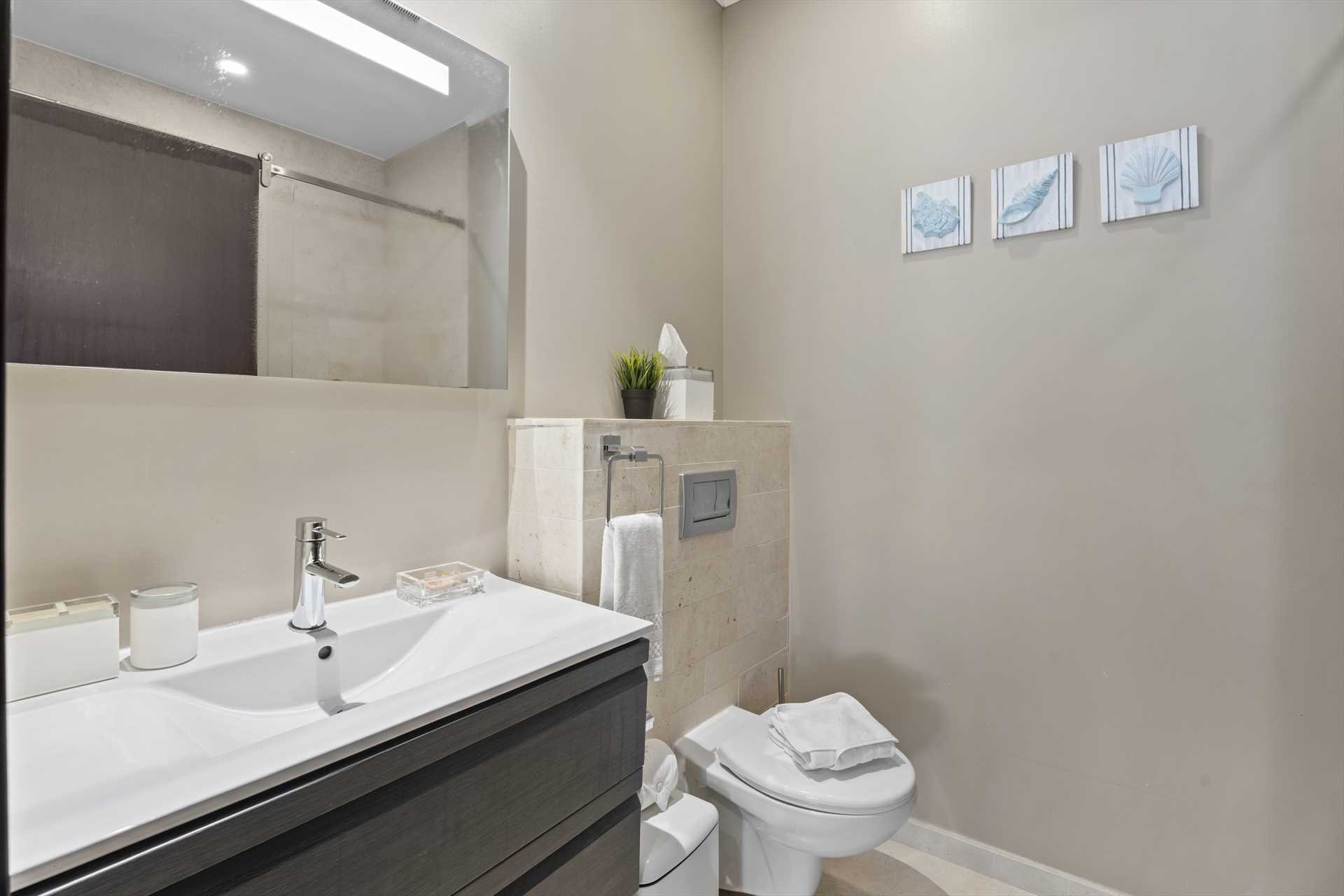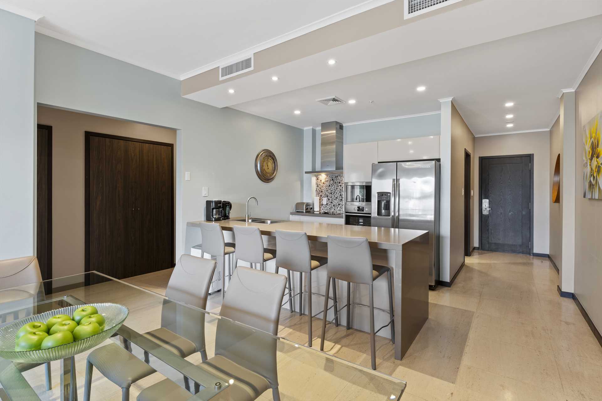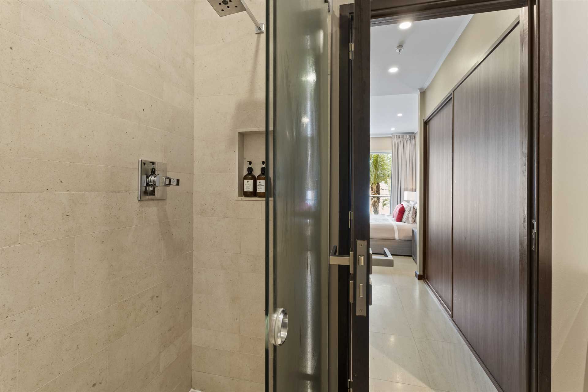 The primary bedroom has a king-size bed, a TV, built-in closets, a chair and access to the balcony with tropical views. The primary bedroom has a full modern en-suite bathroom. The second bedroom has a queen-size bed, a TV, and built-in closets. The second bedroom also offers a full modern en-suite bathroom.