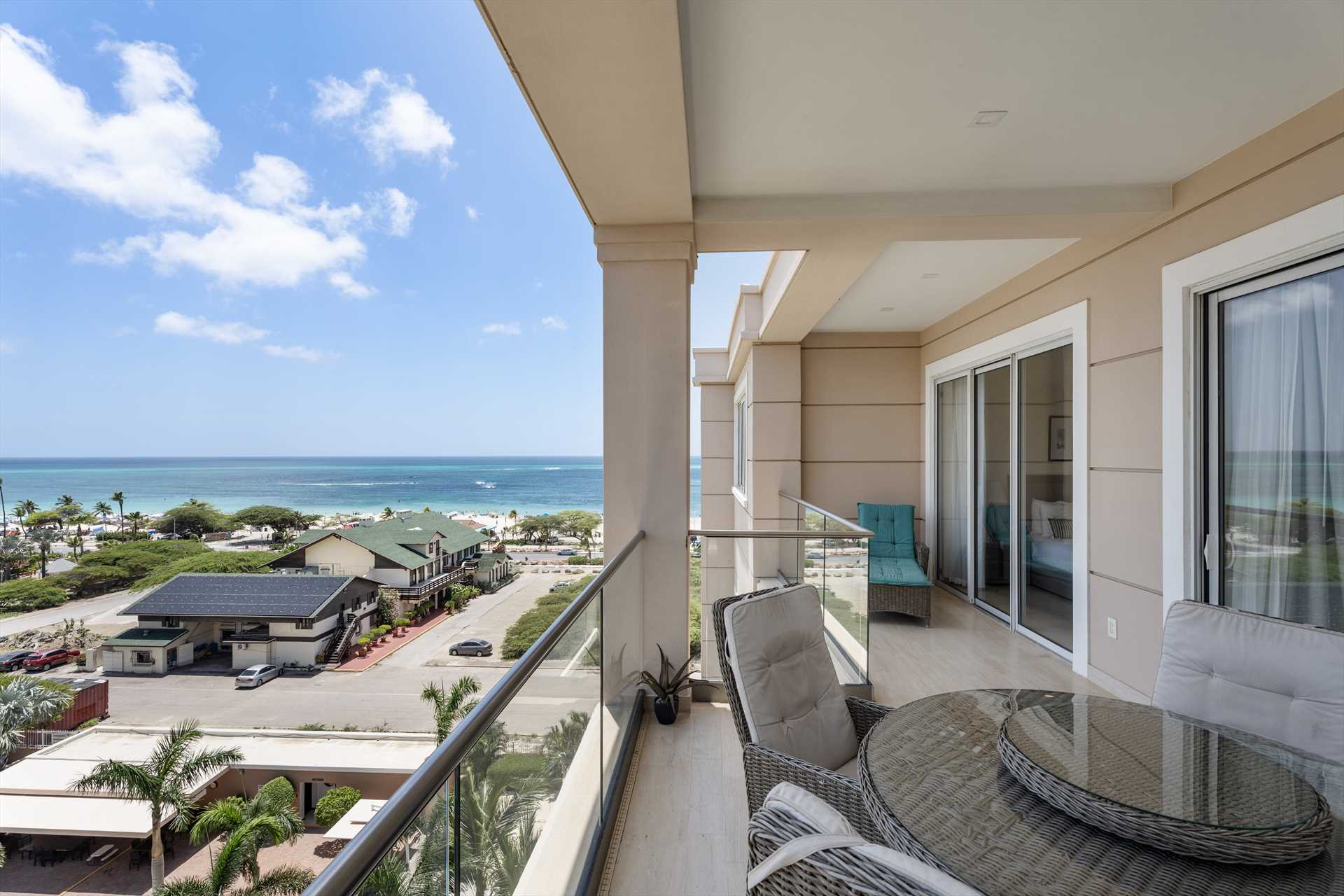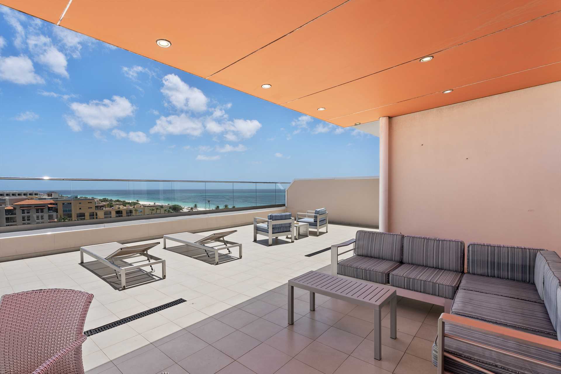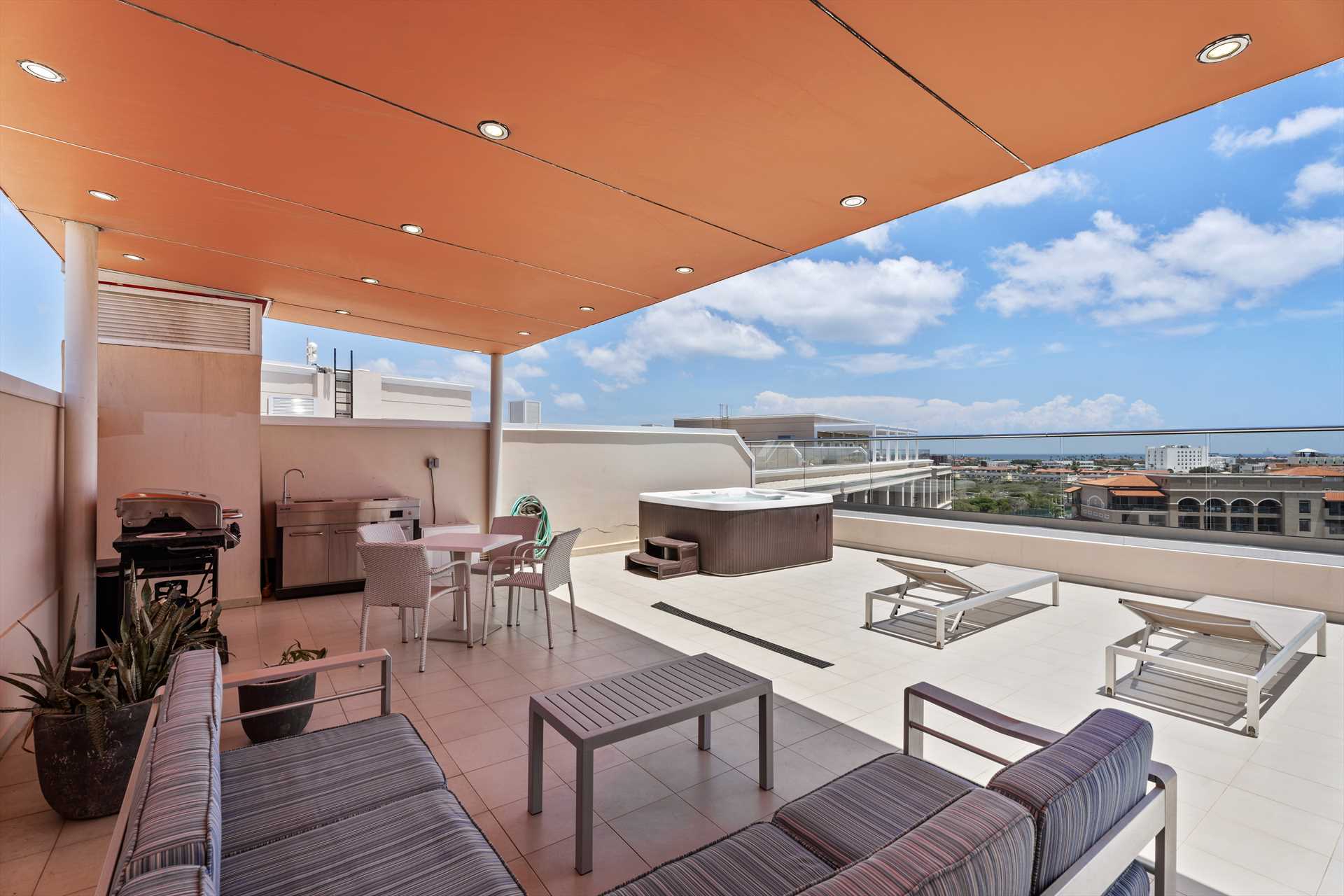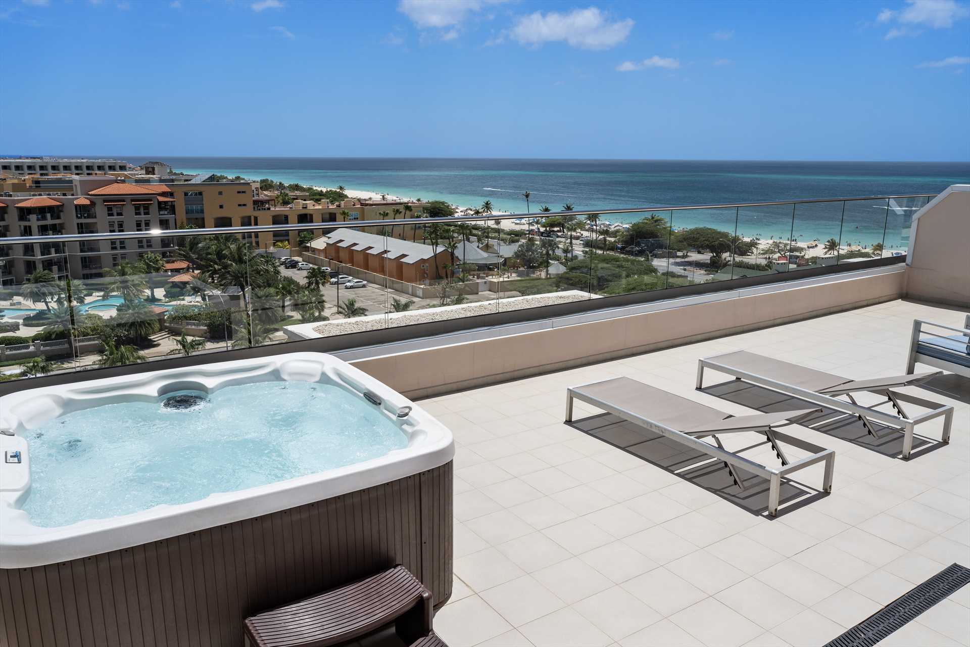 Sun-seekers will appreciate the Scenic View Penthouse Two-bedroom condo with direct access to its private rooftop with Hot Tub, loungers in the sun, a shaded living and dining area, and an outdoor prepping area with a sink and large BBQ-grill. With dreamy panoramic views of the Caribbean Sea, its two outdoor living areas blend seamlessly with its elegant interior, providing an exquisite setting for relaxation and entertainment with family and friends. The stunning views continue on the balcony that stretches across the living room and both bedrooms with a wall of sliding glass doors. The Scenic View Penthouse Two-bedroom condo is a sophisticated vacation rental penthouse located at the LeVent Beach Resort Aruba, the newest vacation rental resort on our 'One Happy Island' of Aruba.