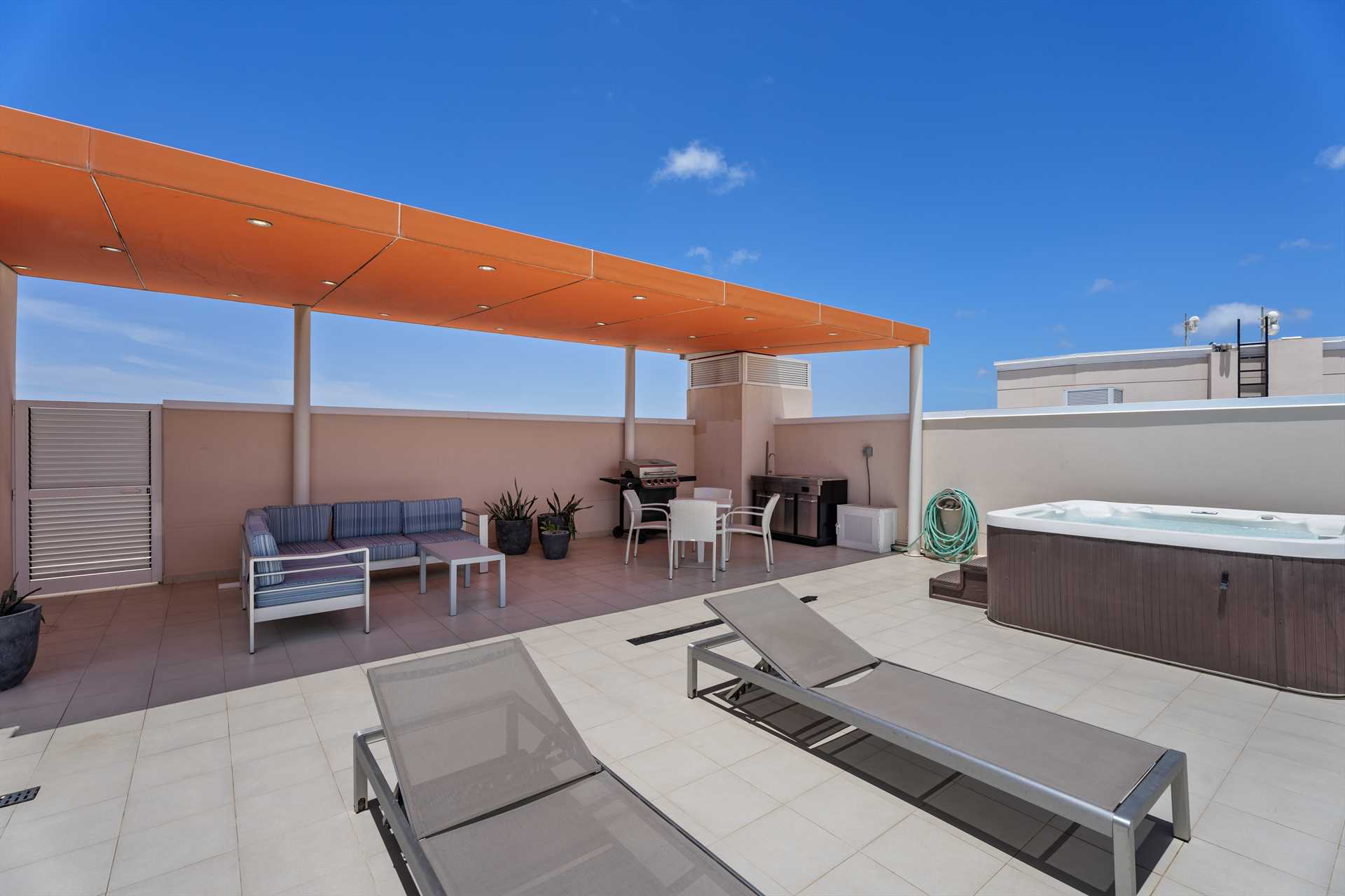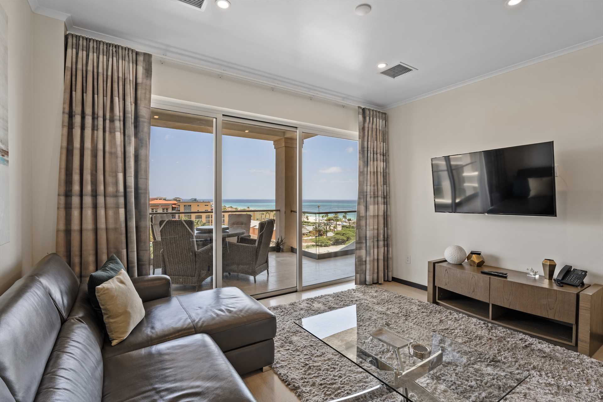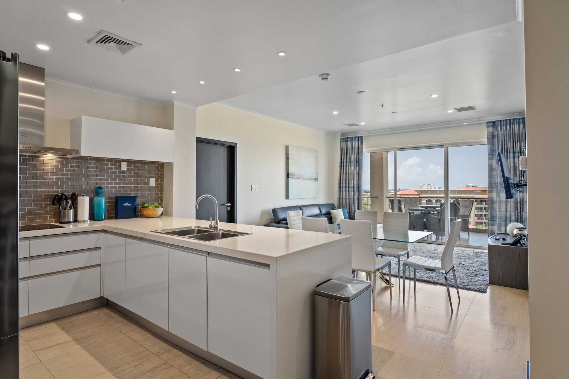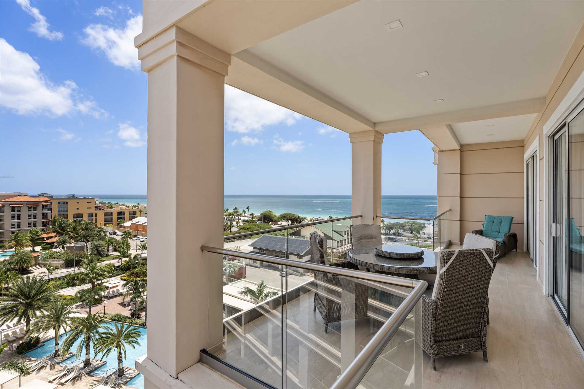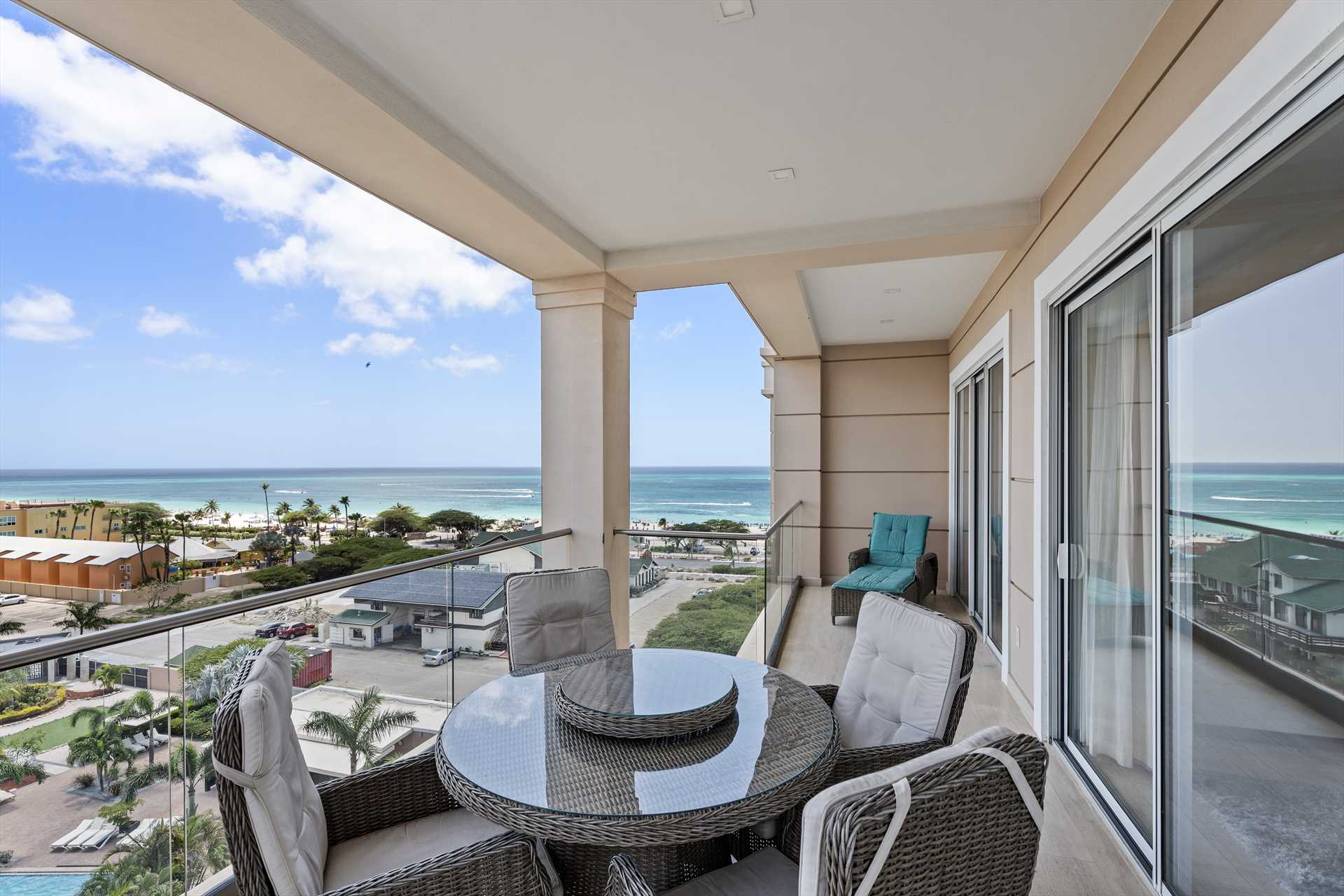 Sun-seekers will appreciate the Scenic View Penthouse Two-bedroom condo with direct access to its private rooftop with Hot Tub, loungers in the sun, a shaded living and dining area, and an outdoor prepping area with a sink and large BBQ-grill. With dreamy panoramic views of the Caribbean Sea, its two outdoor living areas blend seamlessly with its elegant interior, providing an exquisite setting for relaxation and entertainment with family and friends. The stunning views continue on the balcony that stretches across the living room and both bedrooms with a wall of sliding glass doors. The Scenic View Penthouse Two-bedroom condo is a sophisticated vacation rental penthouse located at the LeVent Beach Resort Aruba, the newest vacation rental resort on our 'One Happy Island' of Aruba.