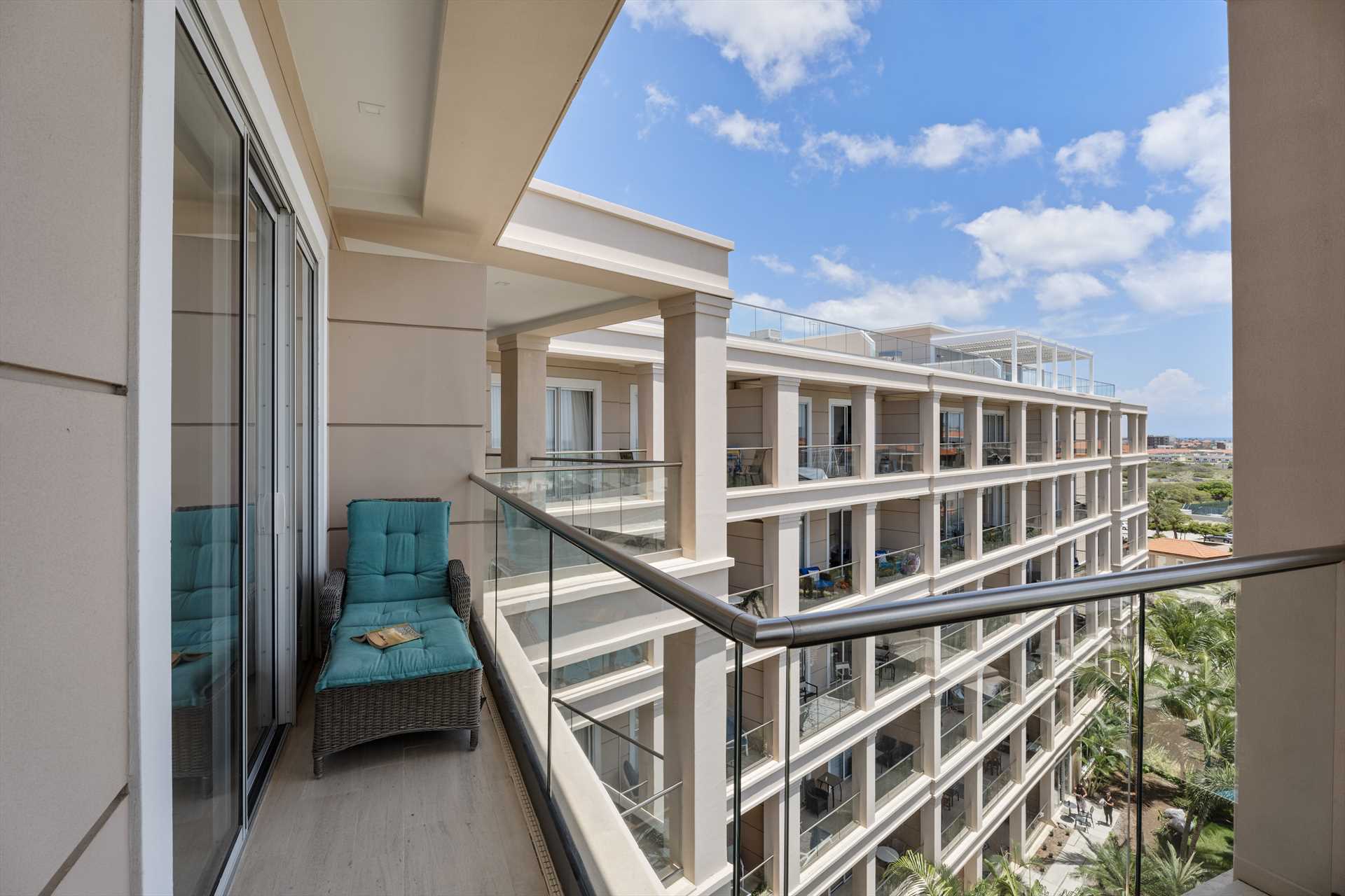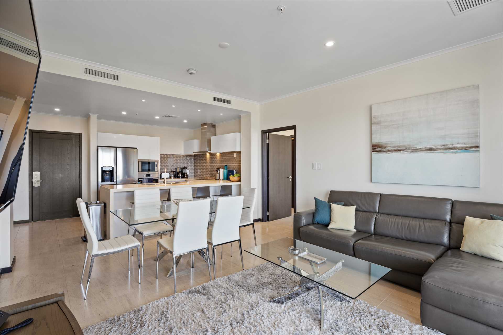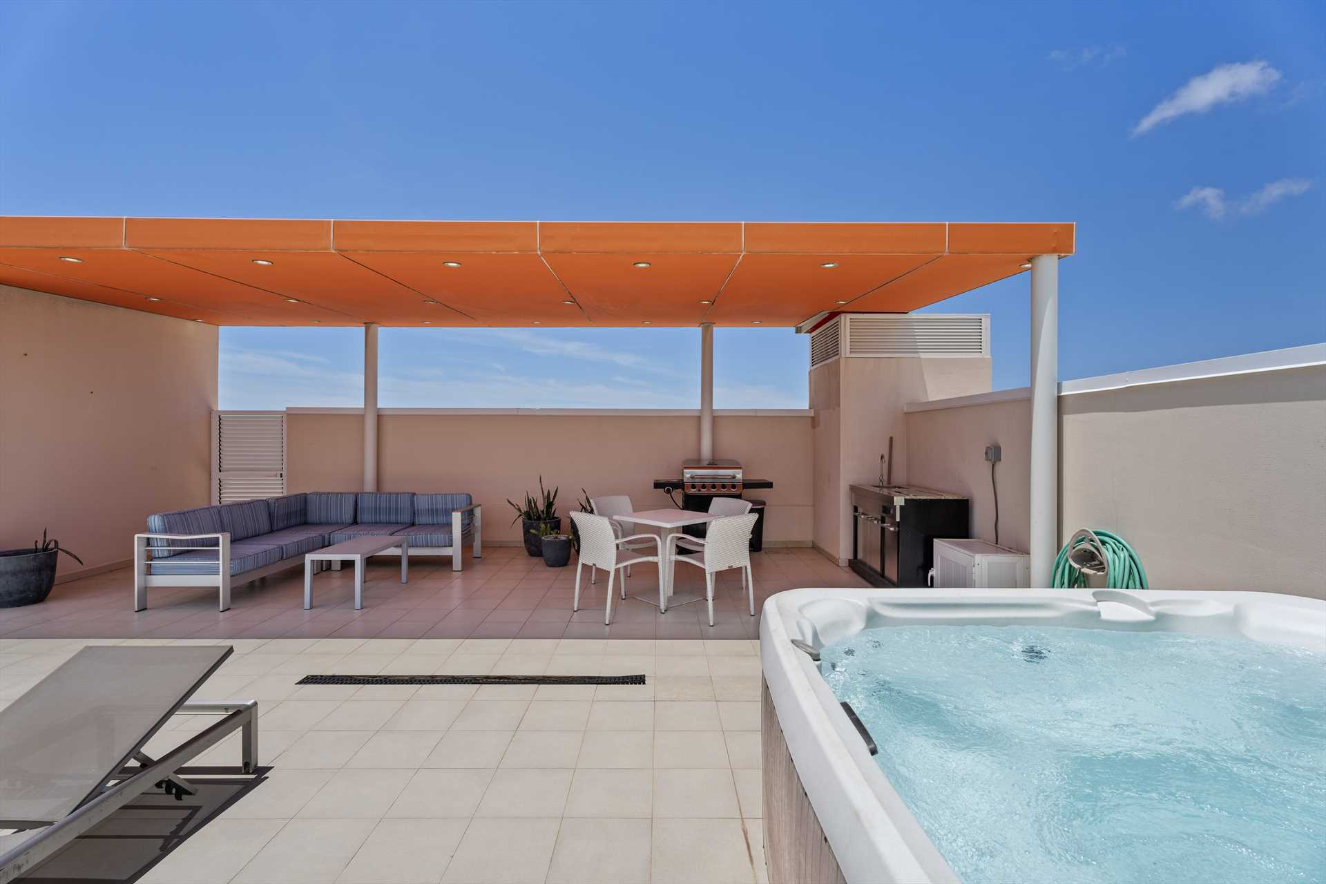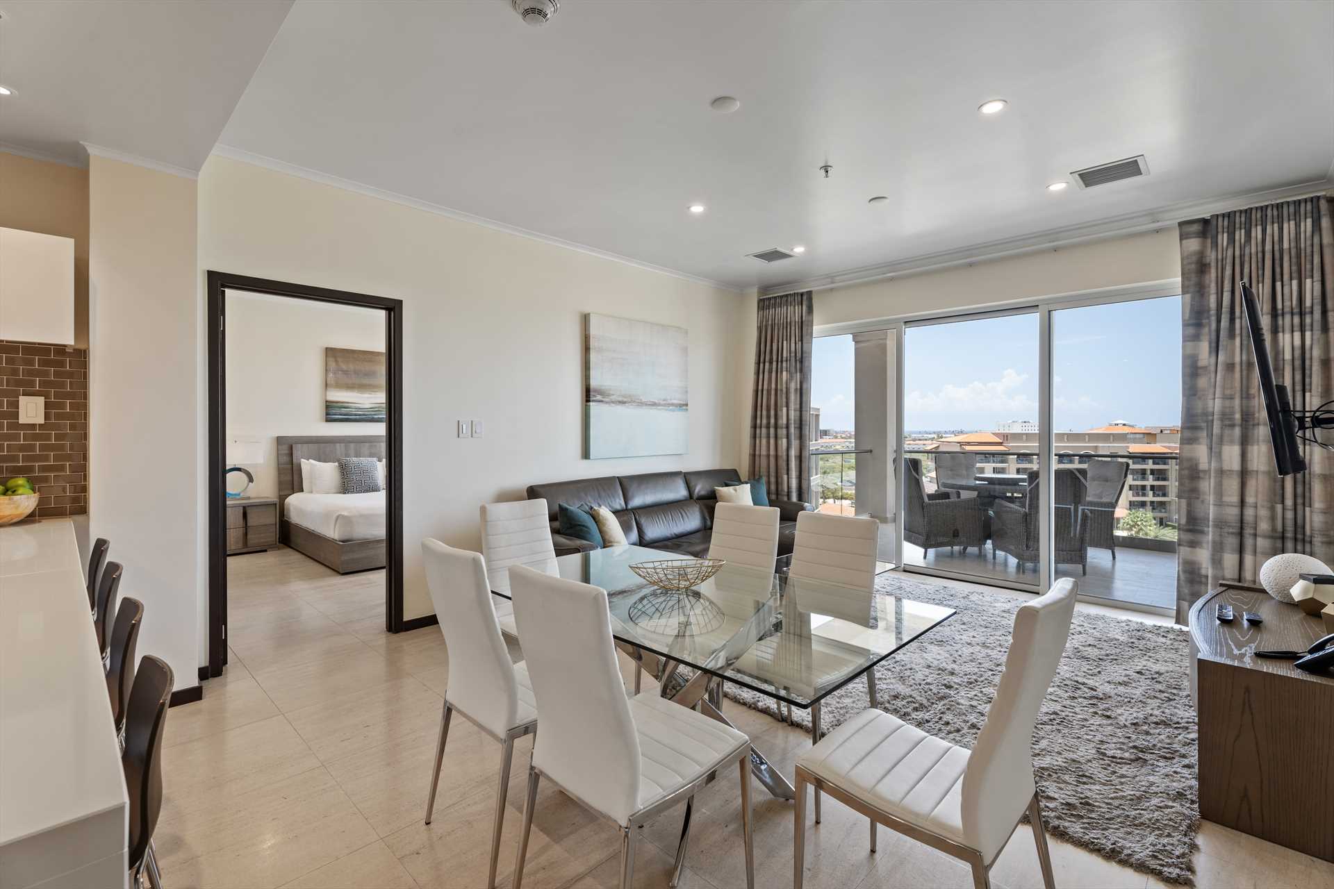 Sun-seekers will appreciate the Scenic View Penthouse Two-bedroom condo with direct access to its private rooftop with Hot Tub, loungers in the sun, a shaded living and dining area, and an outdoor prepping area with a sink and large BBQ-grill. With dreamy panoramic views of the Caribbean Sea, its two outdoor living areas blend seamlessly with its elegant interior, providing an exquisite setting for relaxation and entertainment with family and friends. The stunning views continue on the balcony that stretches across the living room and both bedrooms with a wall of sliding glass doors. The Scenic View Penthouse Two-bedroom condo is a sophisticated vacation rental penthouse located at the LeVent Beach Resort Aruba, the newest vacation rental resort on our 'One Happy Island' of Aruba.
