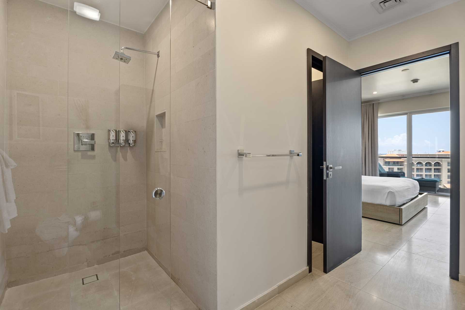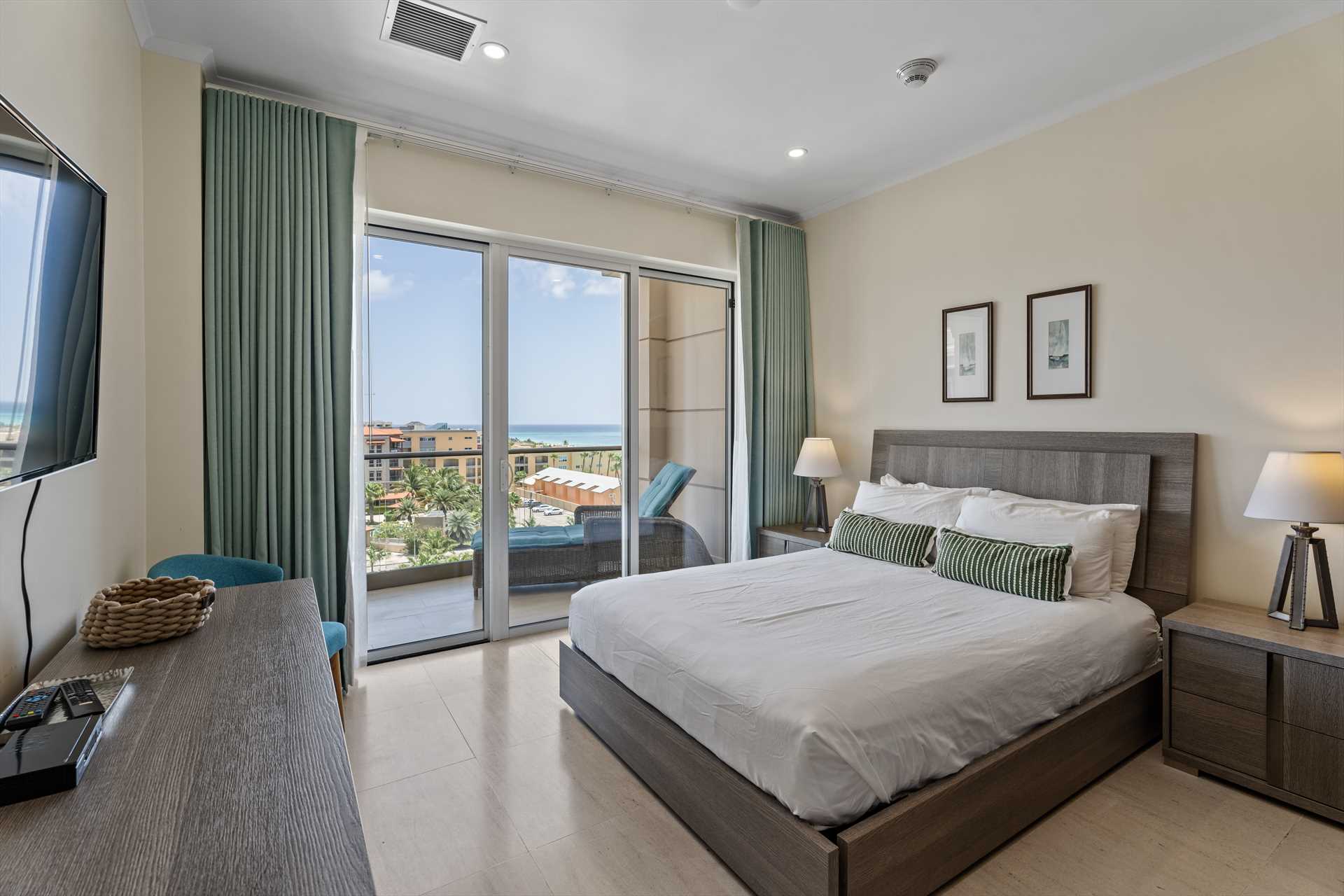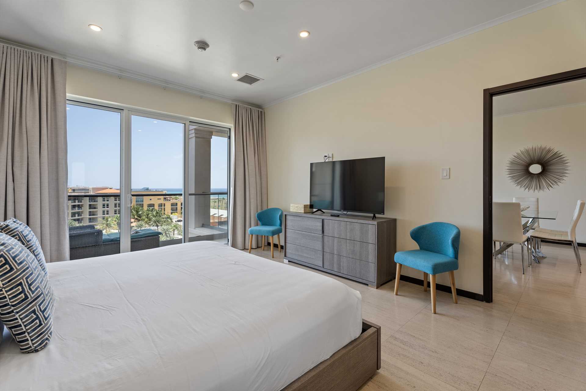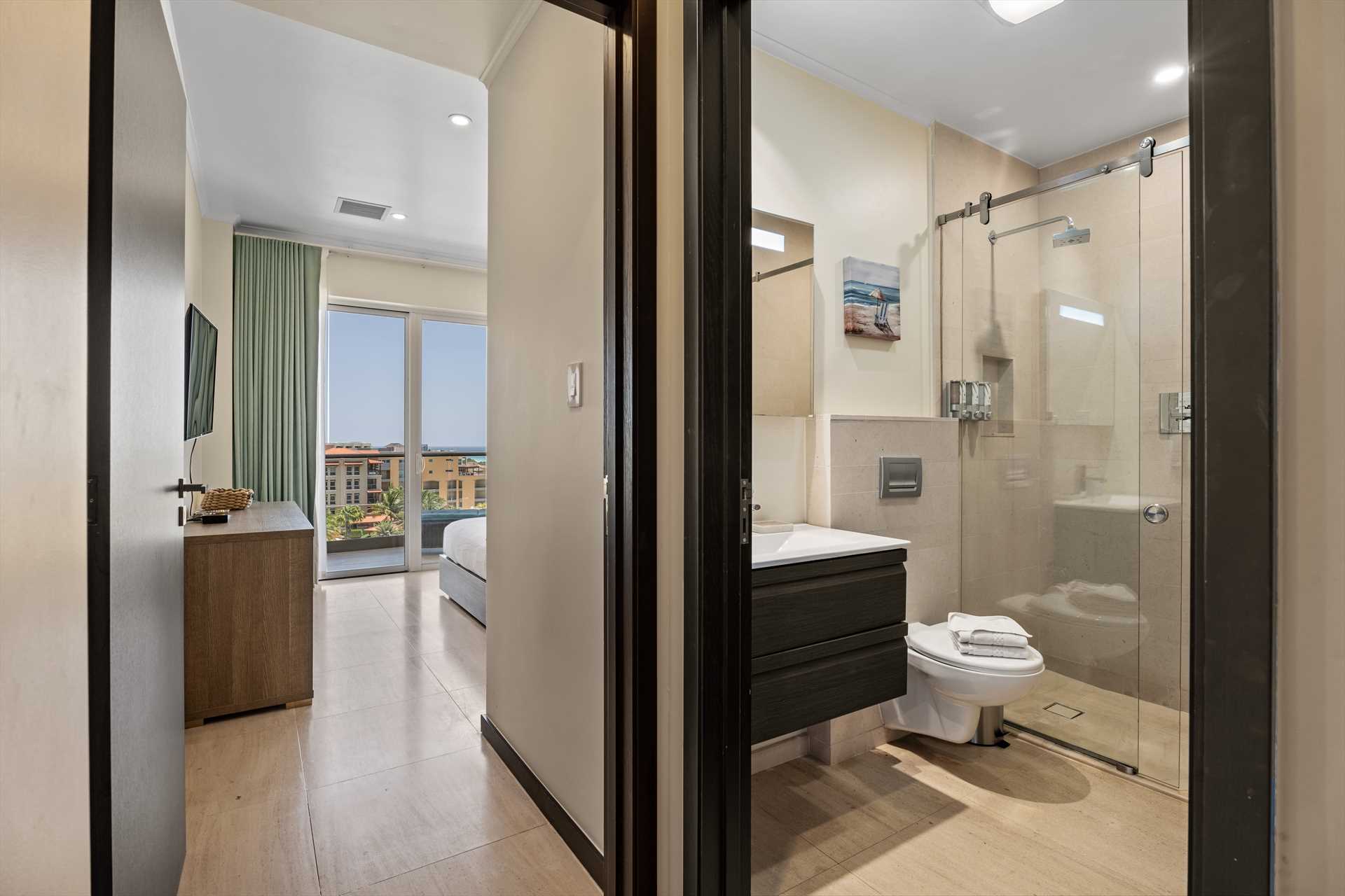 The primary bedroom has a king-size bed, a TV, and access to the balcony with stunning views. The primary bedroom offers a full modern en-suite bathroom with a shower and walk-in closet. The second bedroom has a queen-size bed, a TV, built-in closets, and access to the balcony with stunning views. The second modern bathroom is just off the second bedroom with a shower.