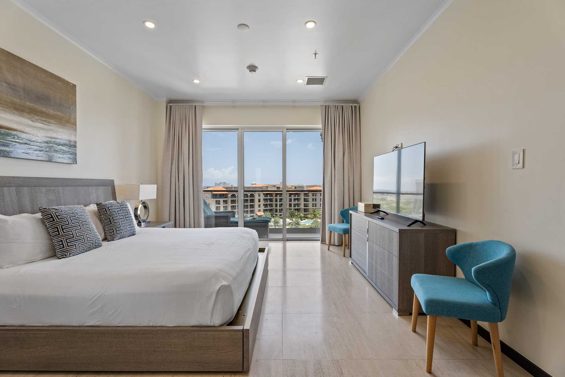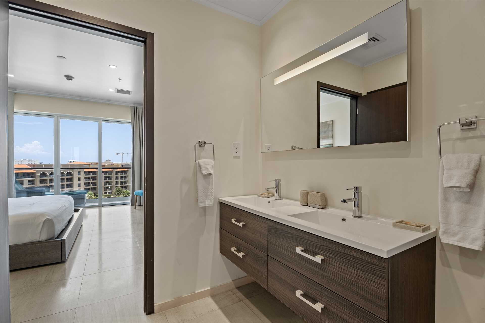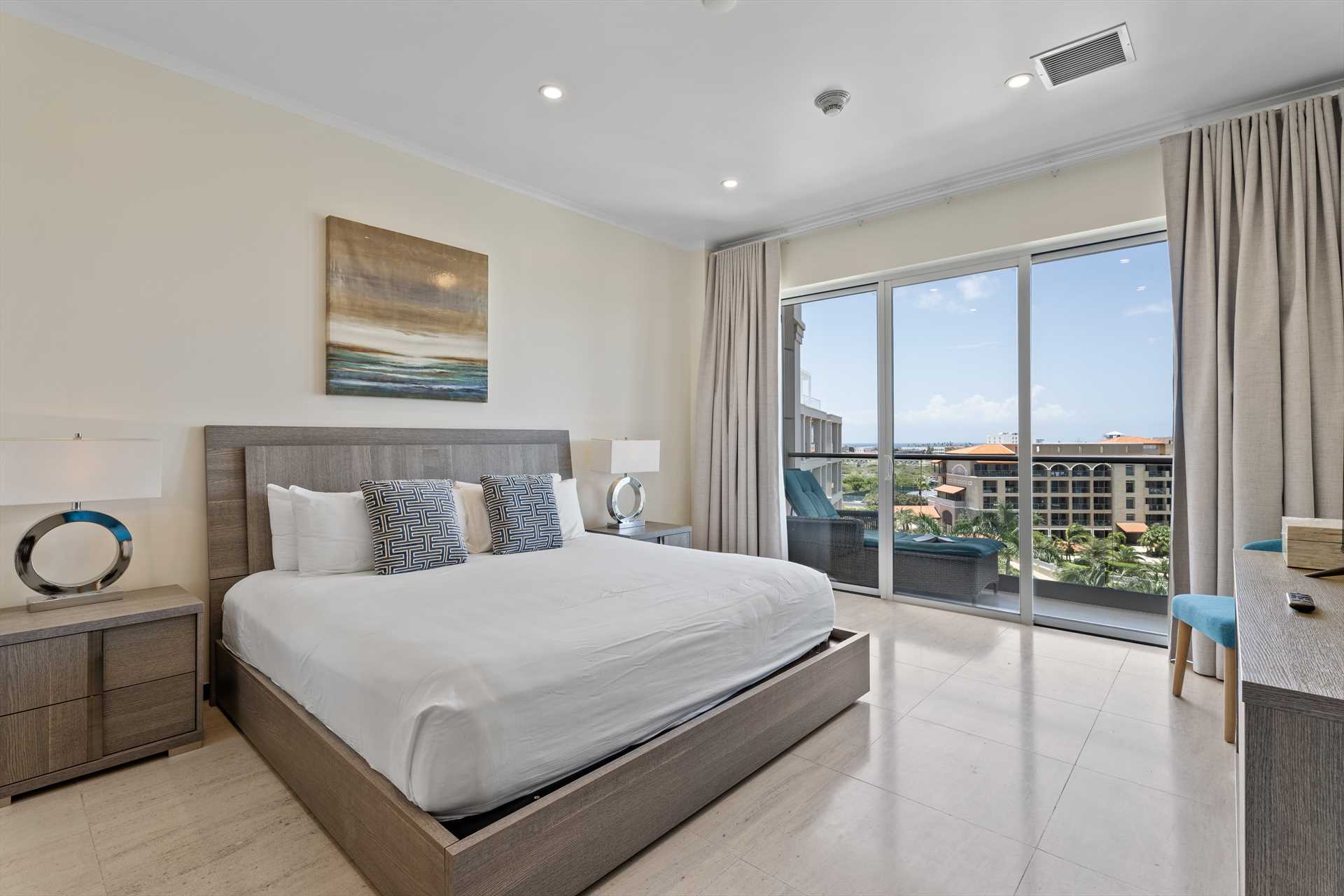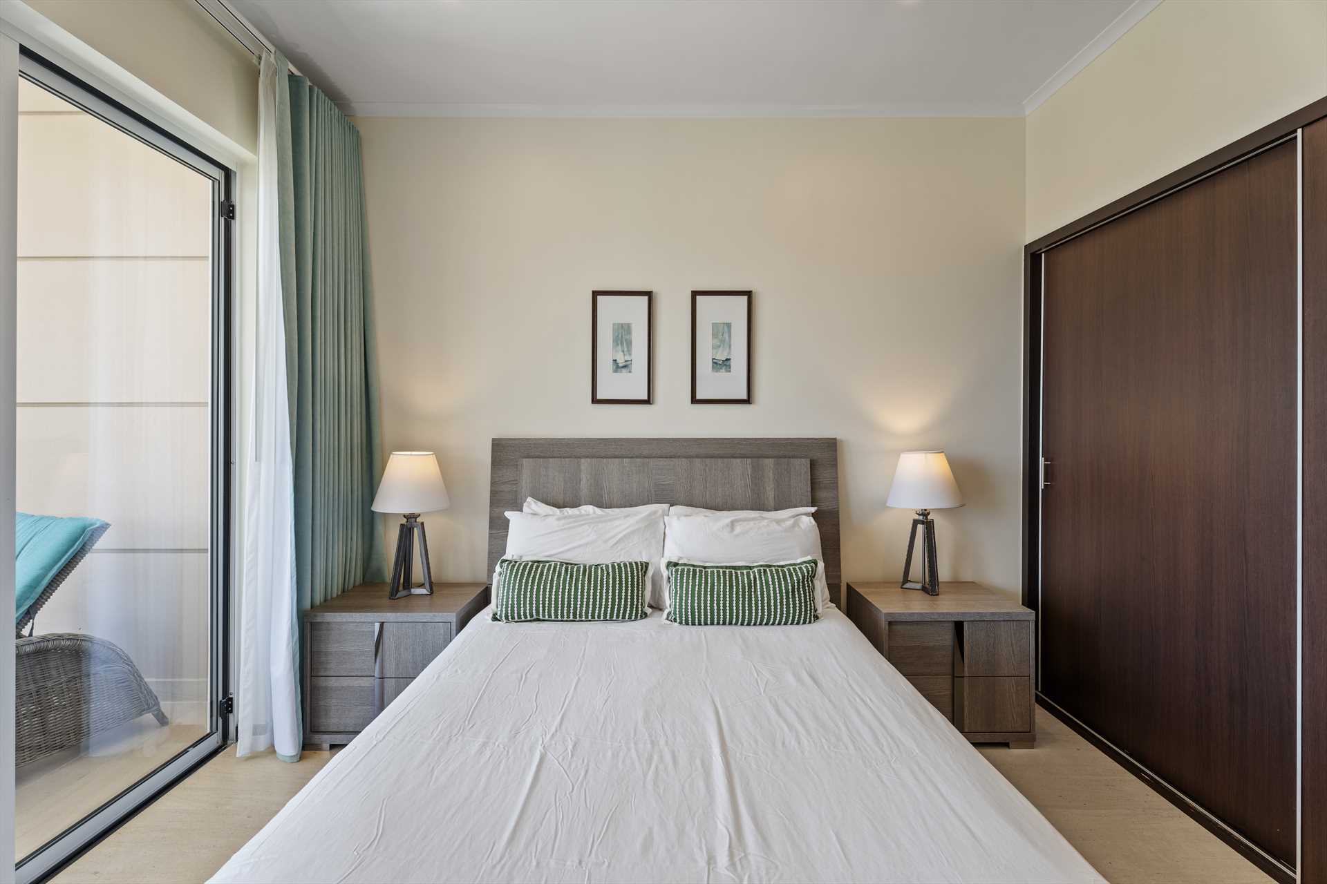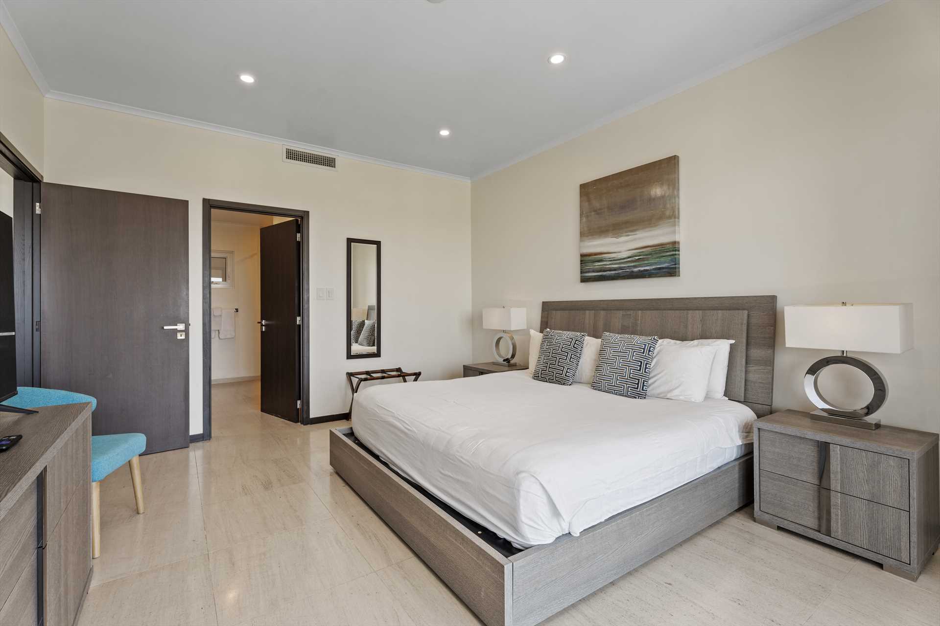 The primary bedroom has a king-size bed, a TV, and access to the balcony with stunning views. The primary bedroom offers a full modern en-suite bathroom with a shower and walk-in closet. The second bedroom has a queen-size bed, a TV, built-in closets, and access to the balcony with stunning views. The second modern bathroom is just off the second bedroom with a shower.