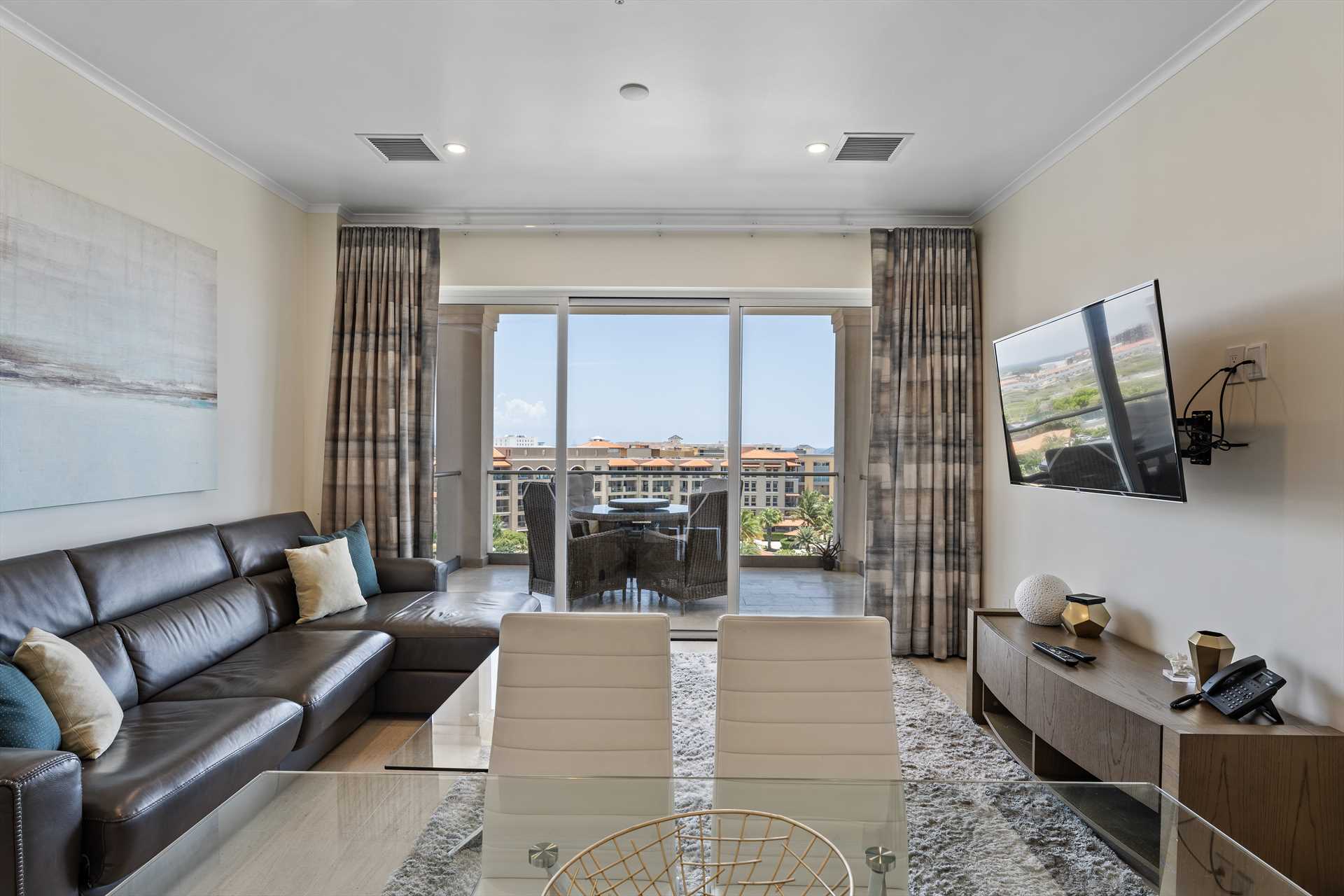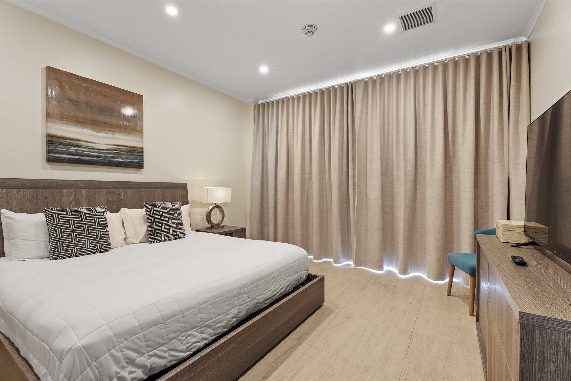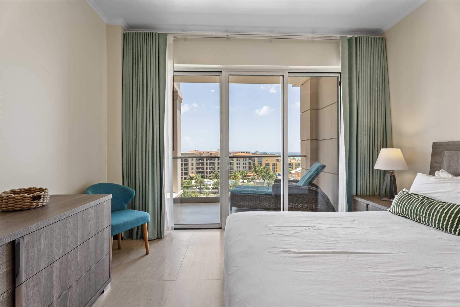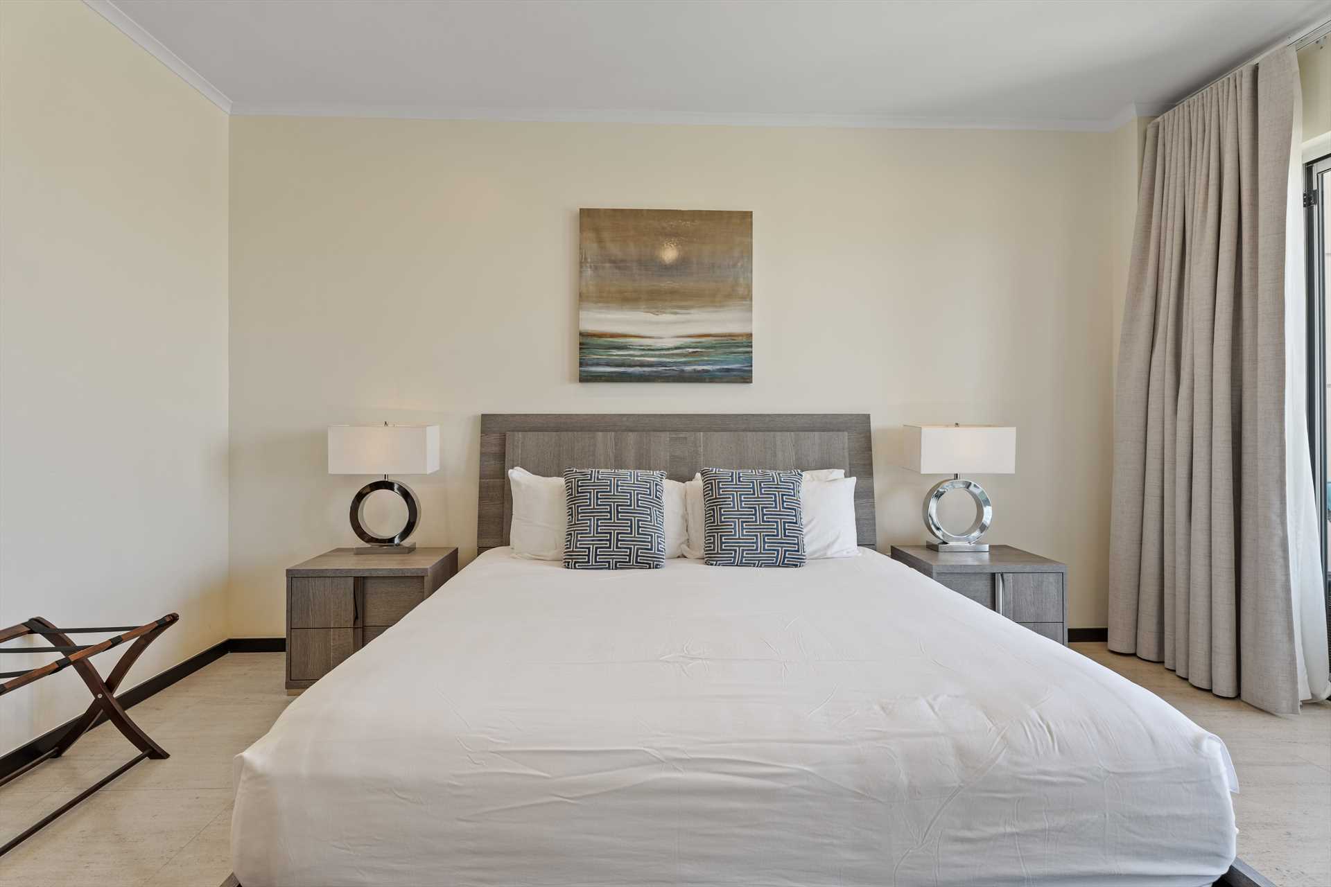 The primary bedroom has a king-size bed, a TV, and access to the balcony with stunning views. The primary bedroom offers a full modern en-suite bathroom with a shower and walk-in closet. The second bedroom has a queen-size bed, a TV, built-in closets, and access to the balcony with stunning views. The second modern bathroom is just off the second bedroom with a shower.