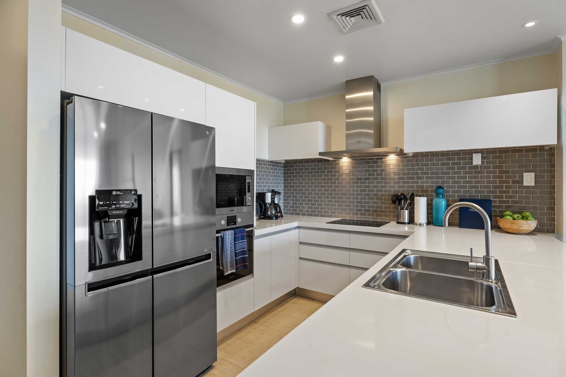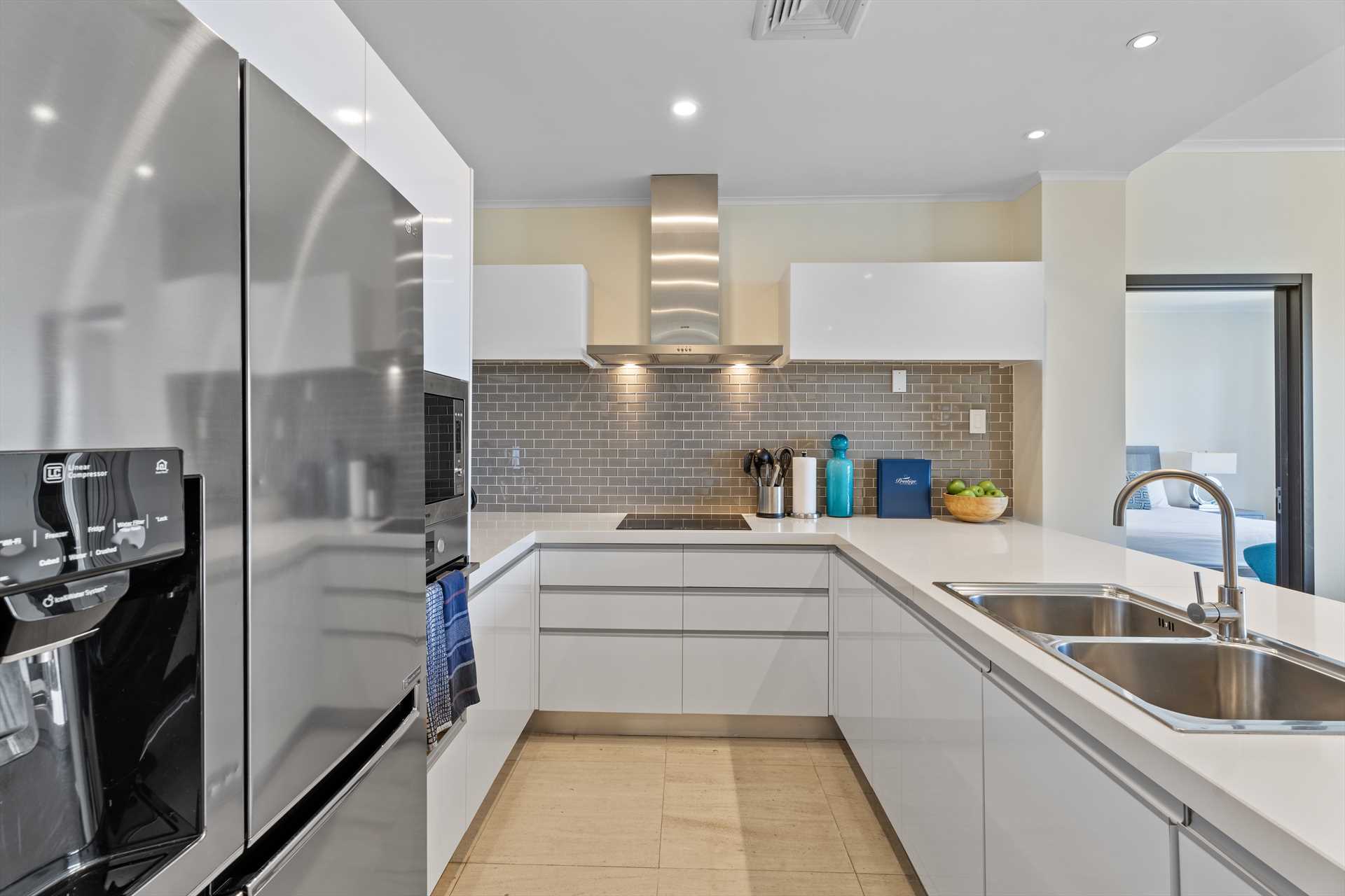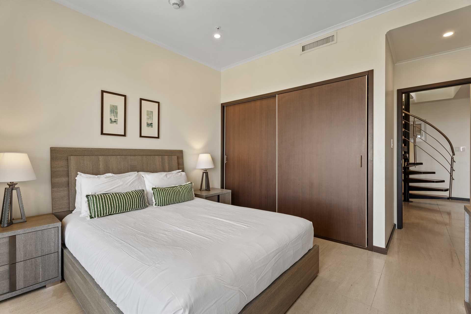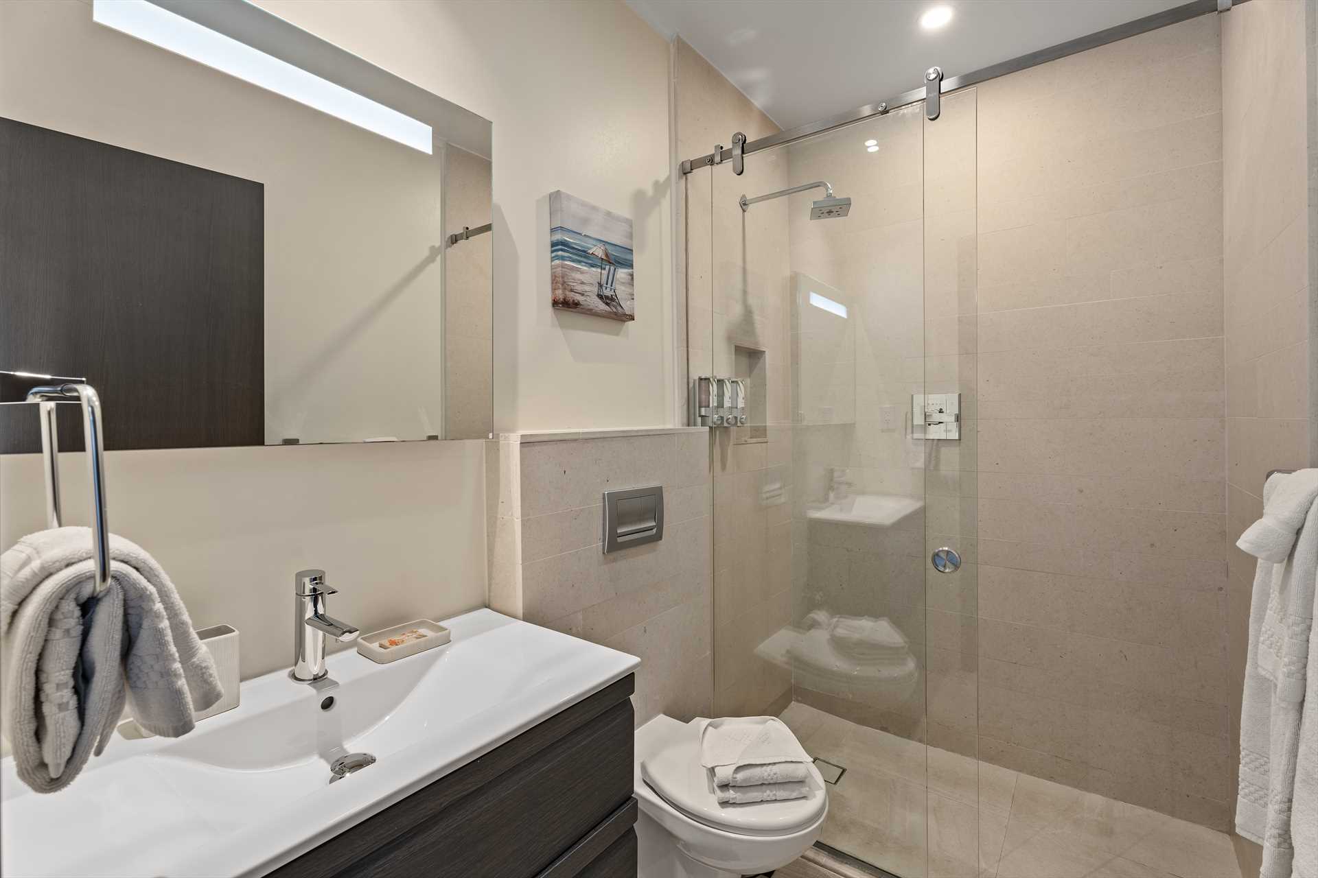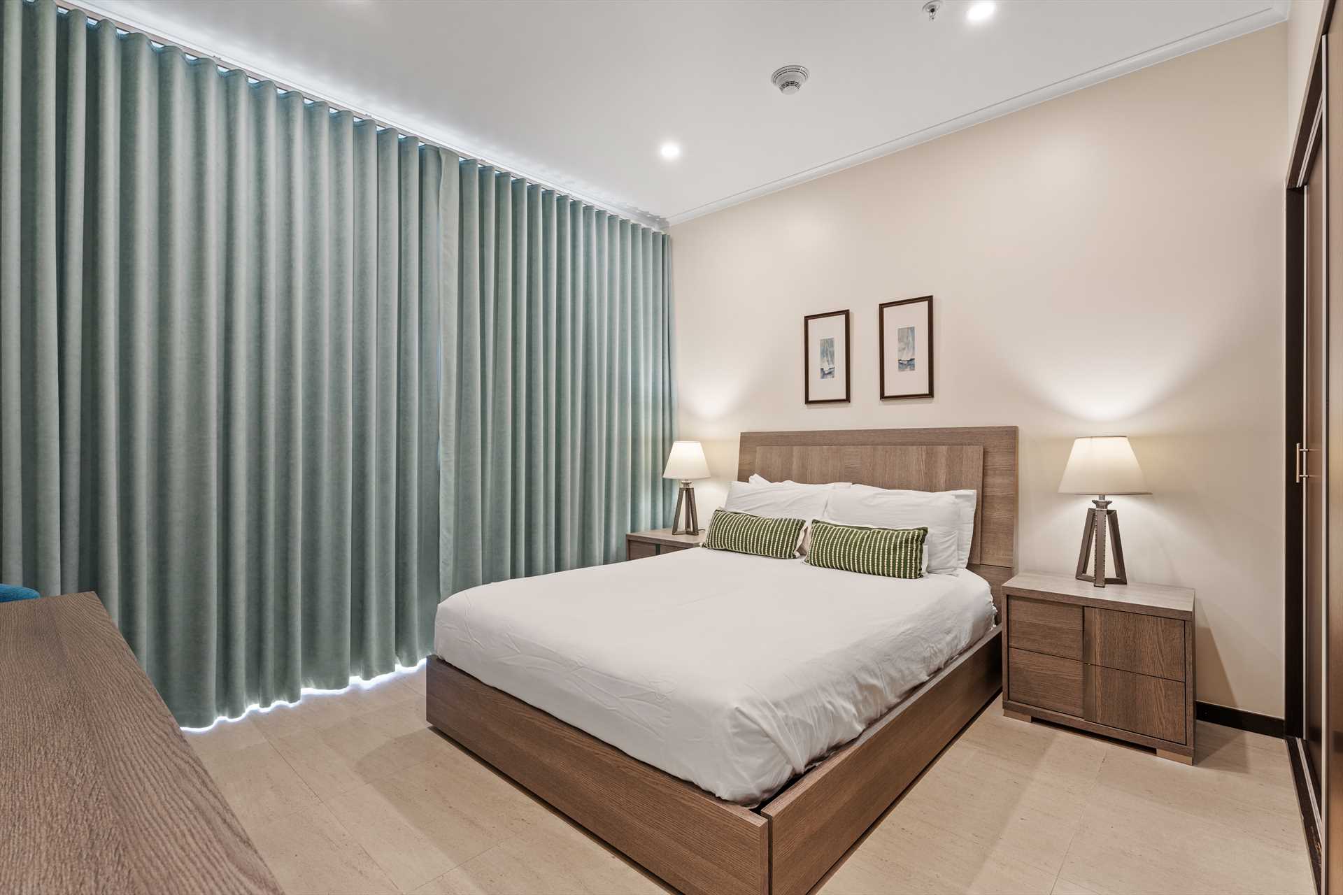 The primary bedroom has a king-size bed, a TV, and access to the balcony with stunning views. The primary bedroom offers a full modern en-suite bathroom with a shower and walk-in closet. The second bedroom has a queen-size bed, a TV, built-in closets, and access to the balcony with stunning views. The second modern bathroom is just off the second bedroom with a shower.