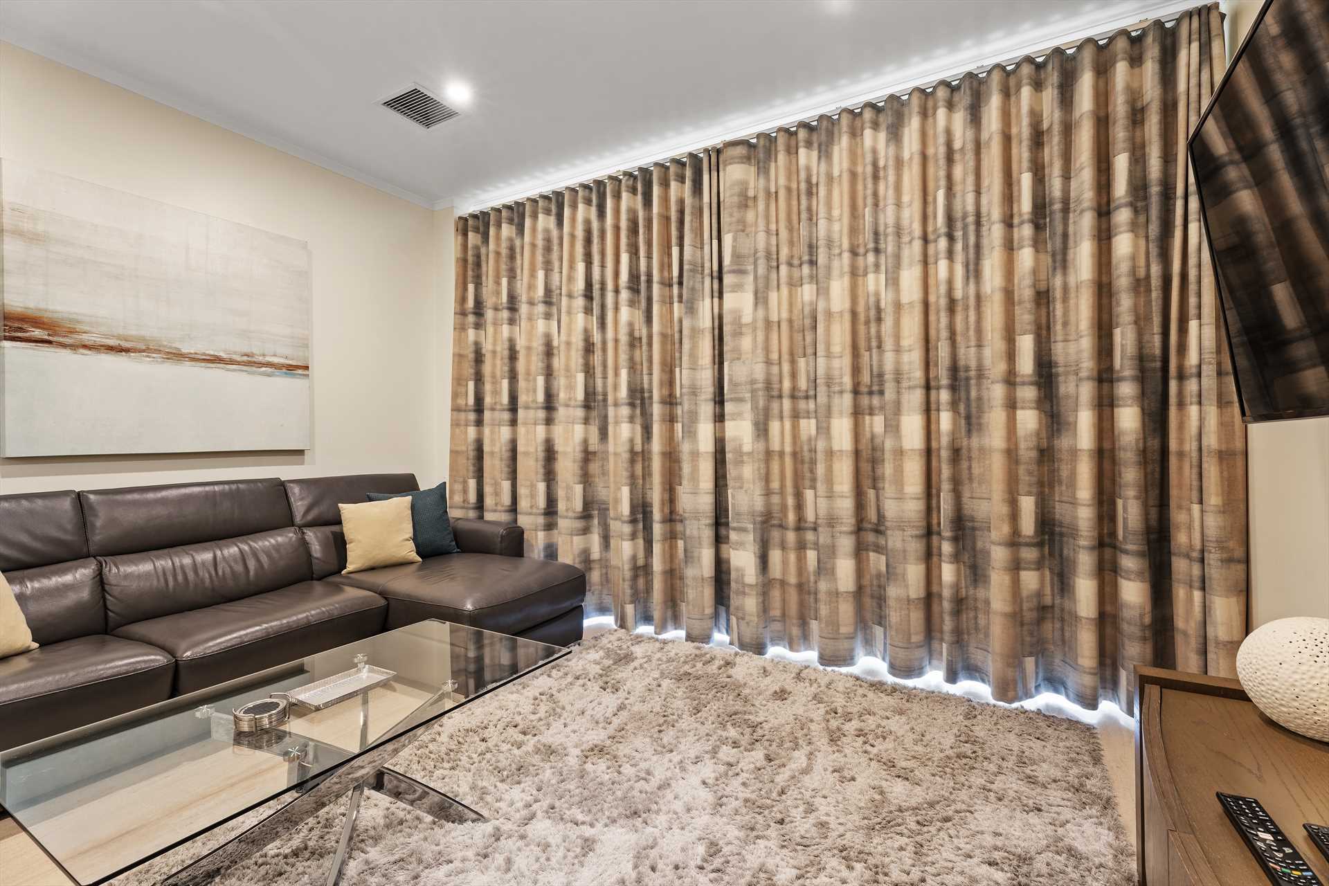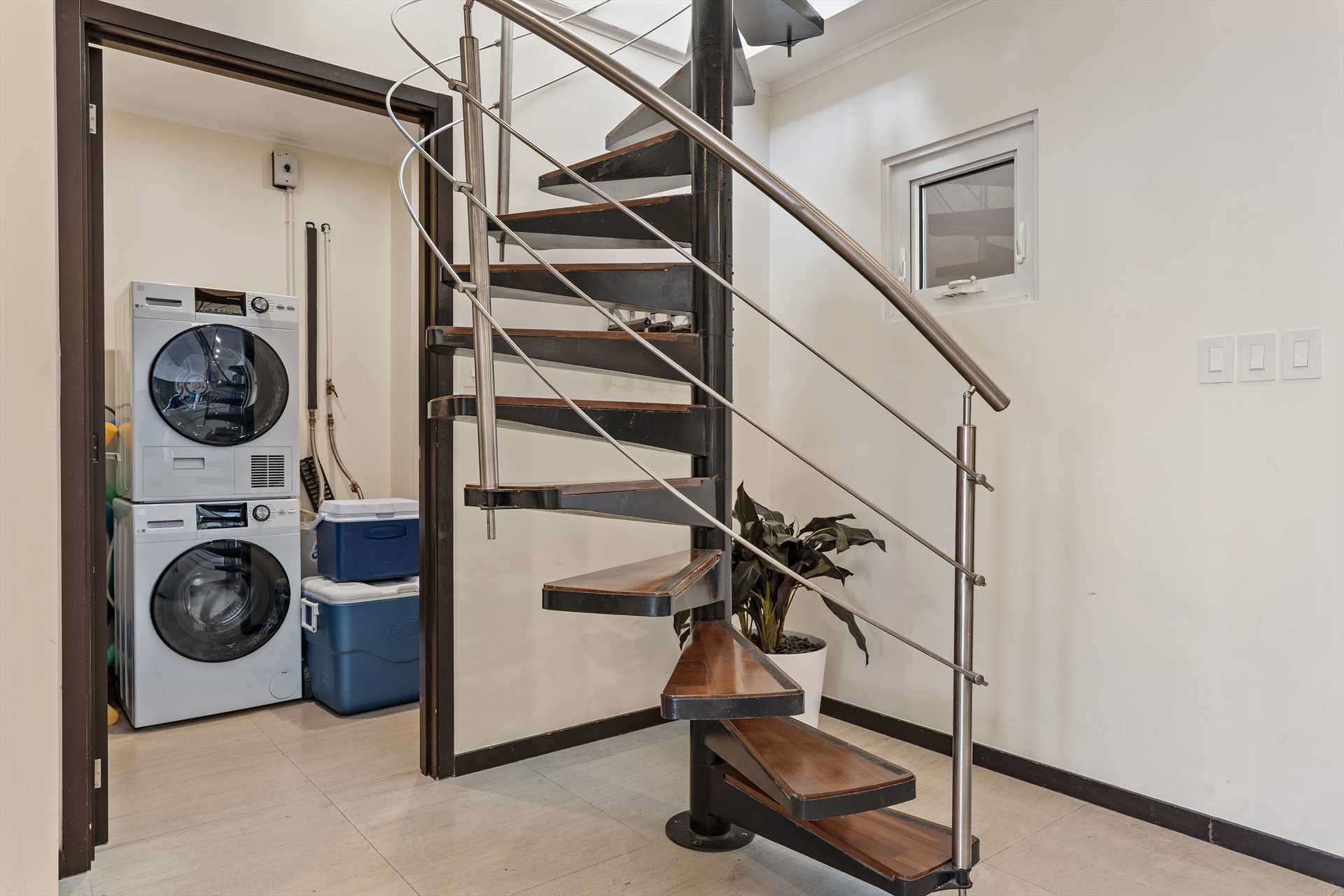 The open plan living area is provided with a large TV, an L-shaped leather sofa-bed (with a double-size mattress), a 6-seat glass dining table, and a full-sized fully equipped modern kitchen with 4-barstools. The entrance has a spiraling staircase to the rooftop and the laundry room with washer-dryer and storage facilities.