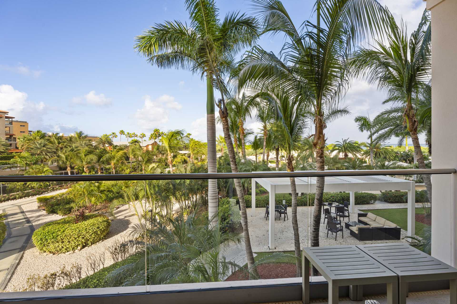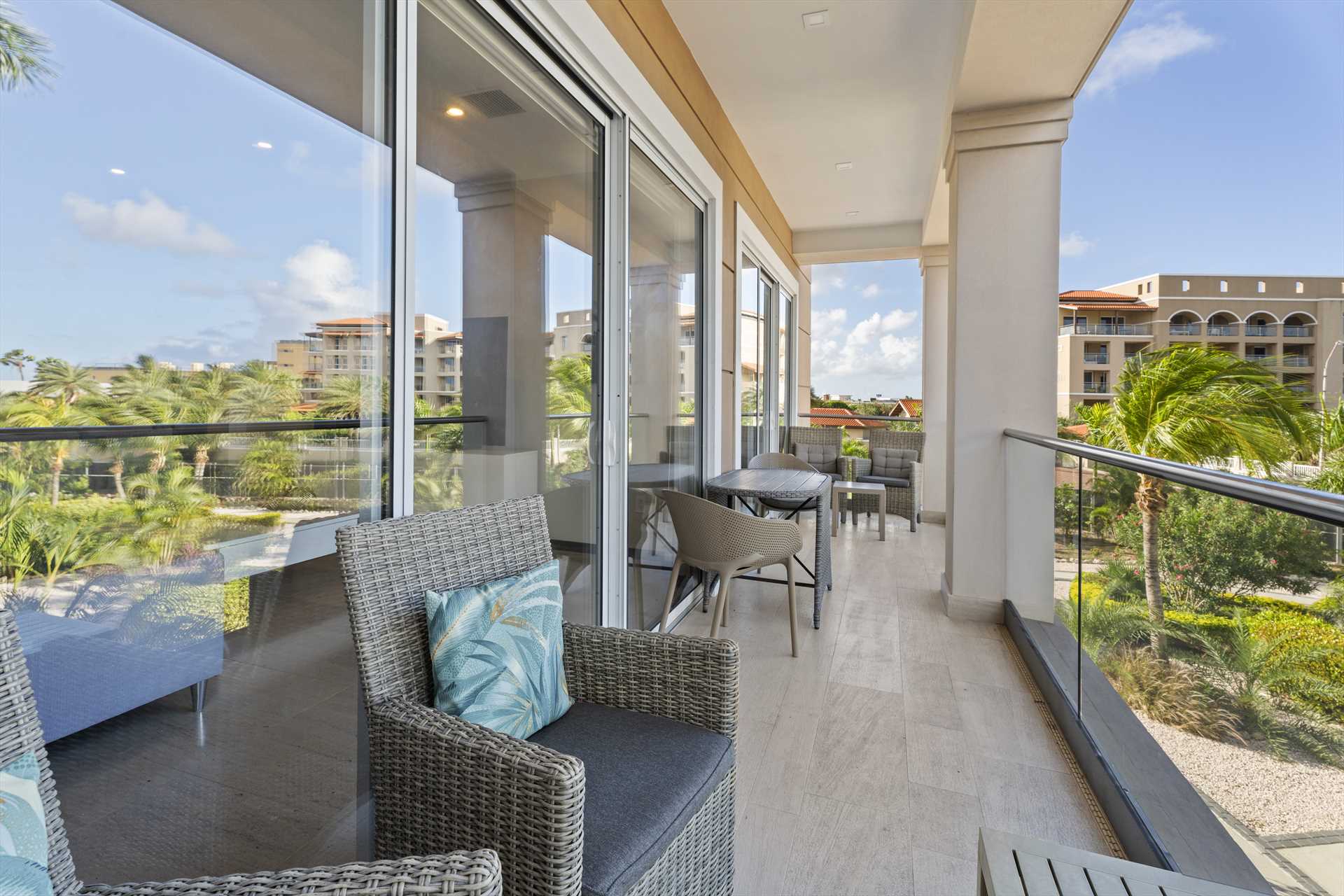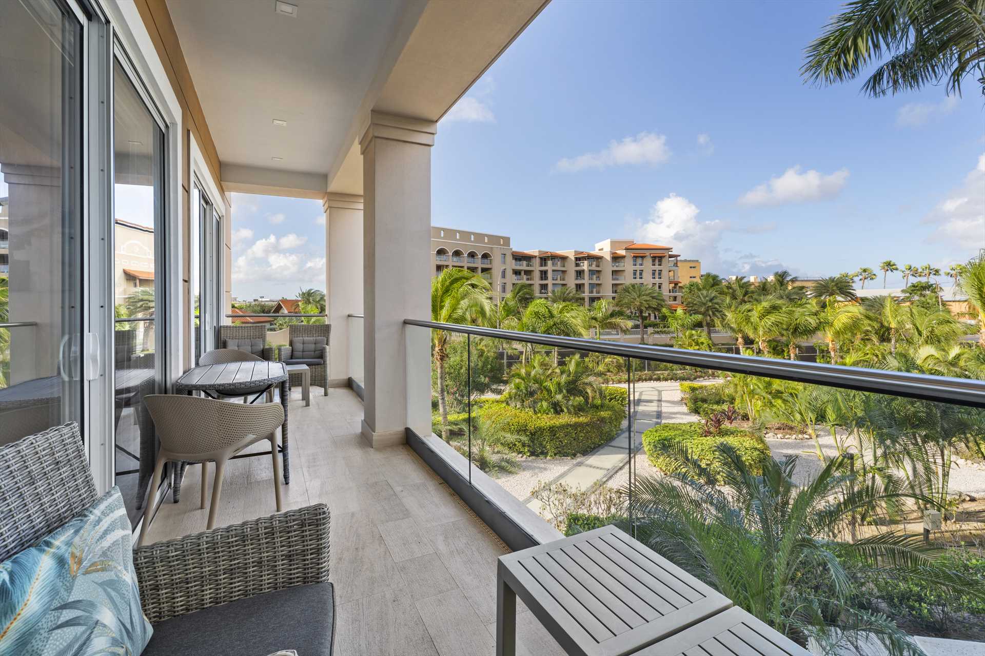 The Larimar Delights Three-bedroom condo is the perfect beach holiday retreat to spend a memorable holiday with up to eight families or friends. The white sand beach and turquoise water of the world-famous Eagle Beach are just a few steps away. This luxurious vacation rental accommodation is located at the LeVent Beach Resort Aruba, the newest vacation rental resort on the island. The balcony, stretching across the primary bedroom and living room, offers you outdoor seating to enjoy the serenity and the tropical landscaping of the resort. Come and enjoy the tranquil resort, the soothing ocean, and feel the sunlight dancing beneath Caribbean waters.