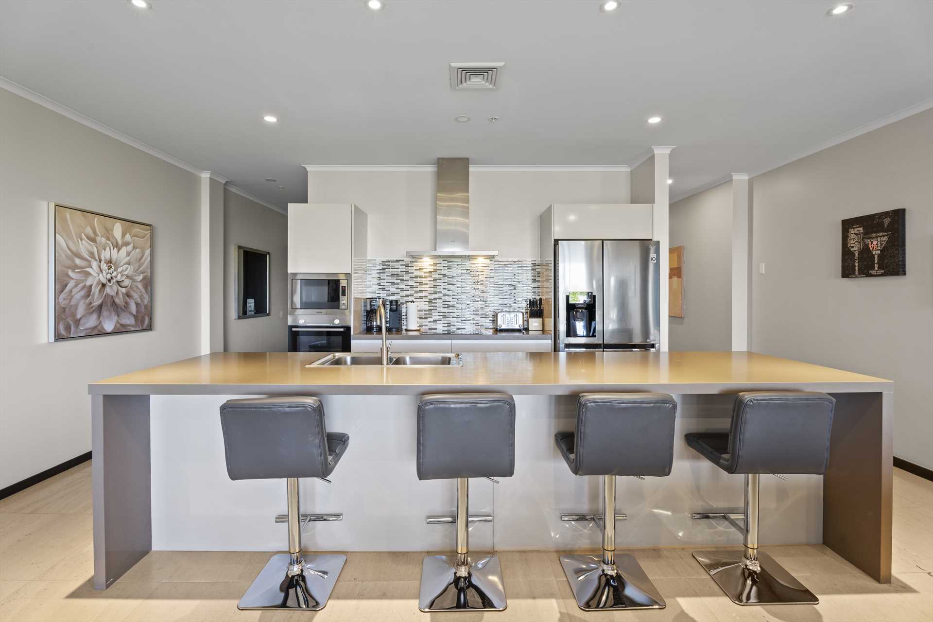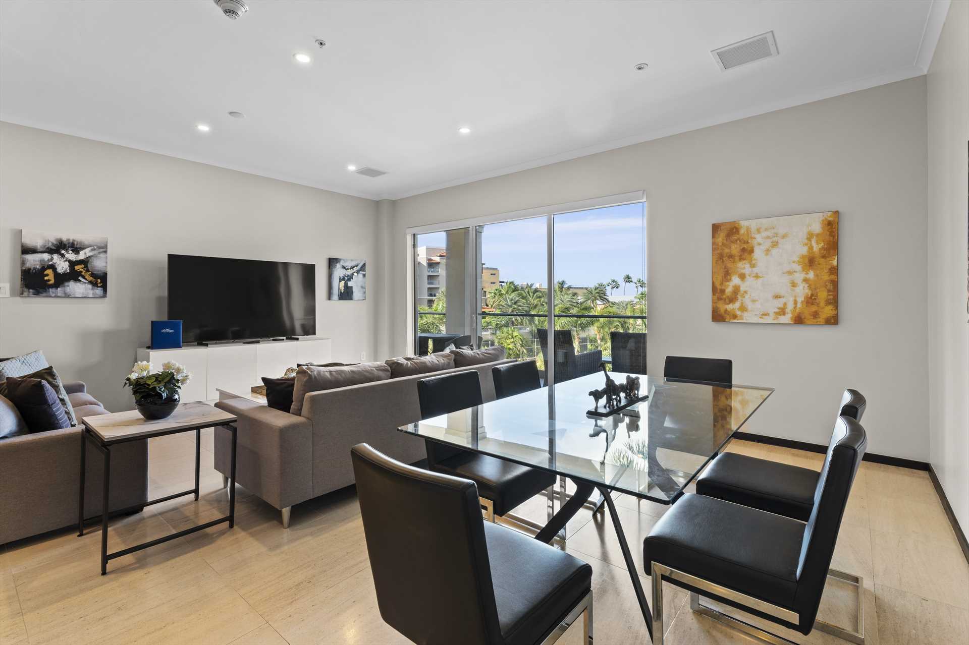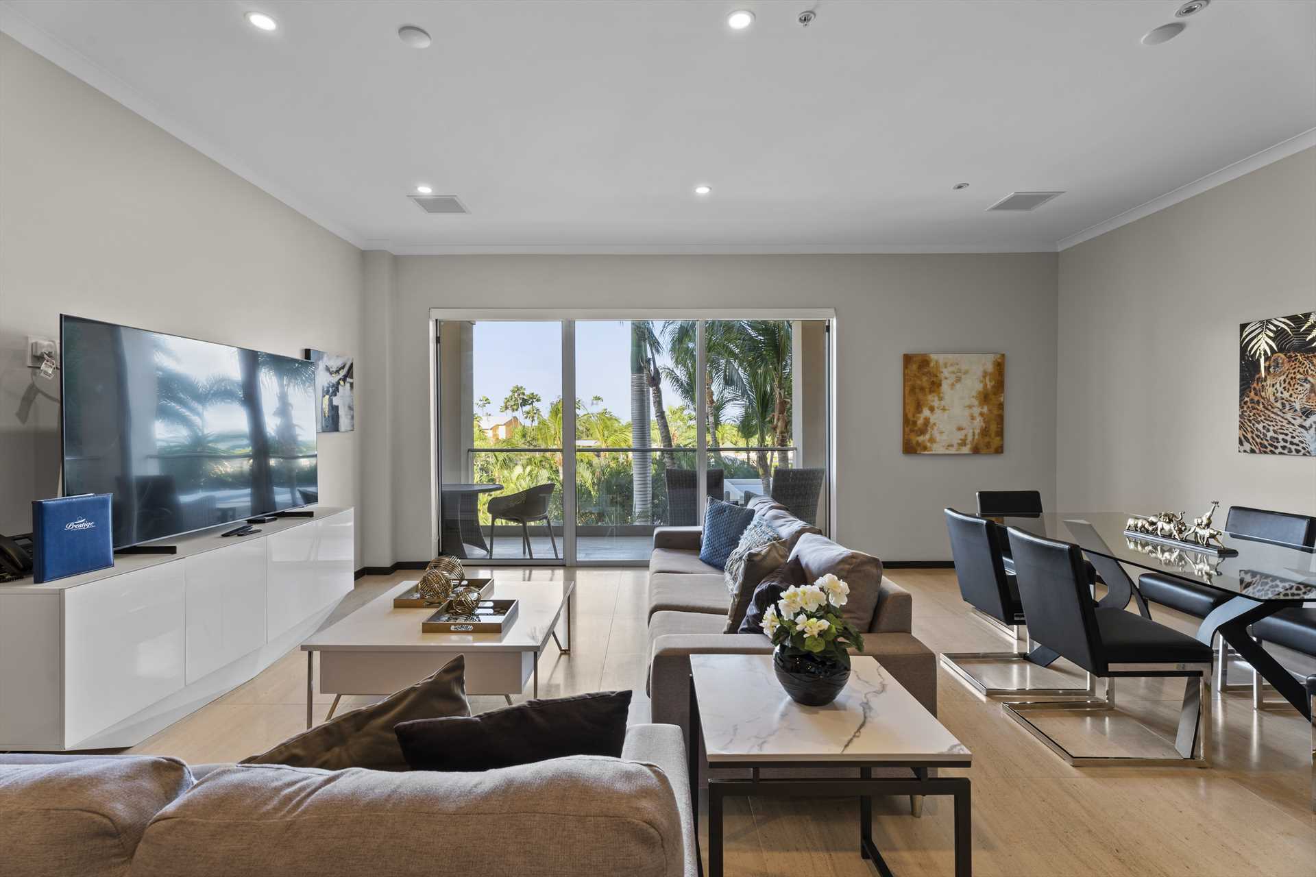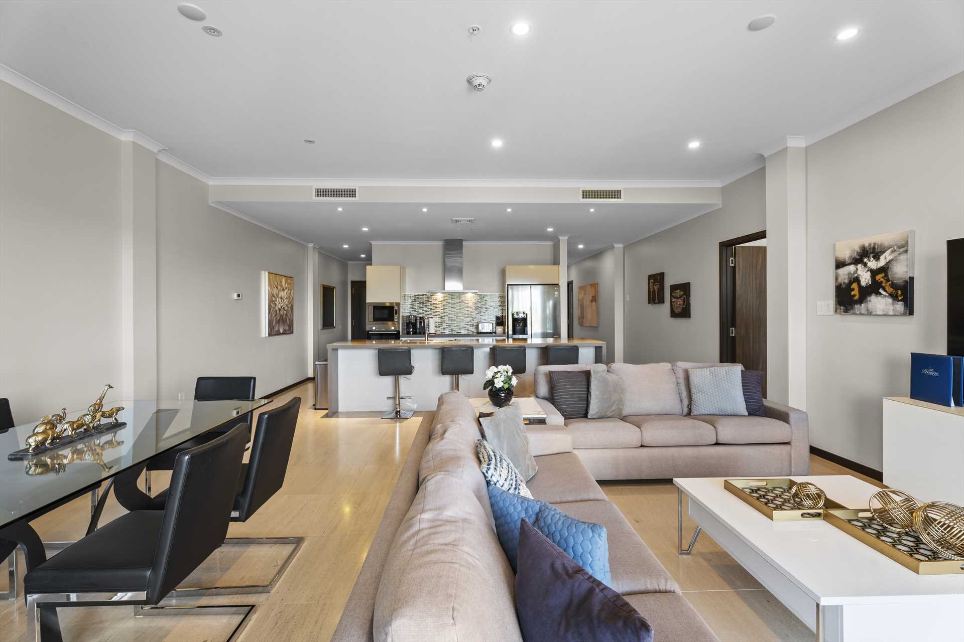 The open plan living area is provided with a large Smart TV, two 3-seat sofas (1 is a sofa-bed with a queen-size mattress), a 6-seat glass dining table, and a full-sized fully equipped modern kitchen with 4-barstools. A half-bathroom and a laundry room with washer-dryer and storage facilities are also available for your comfort.
