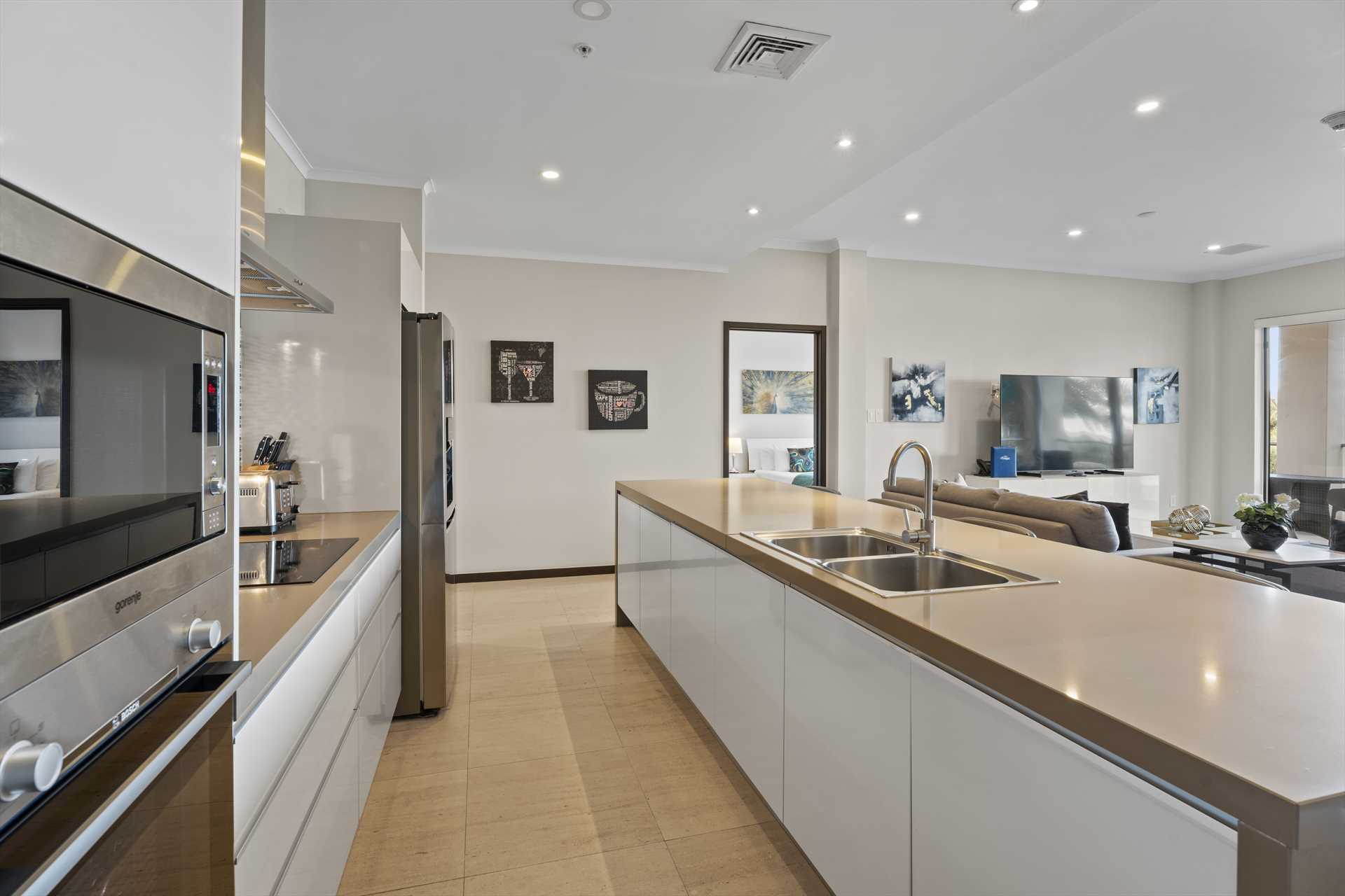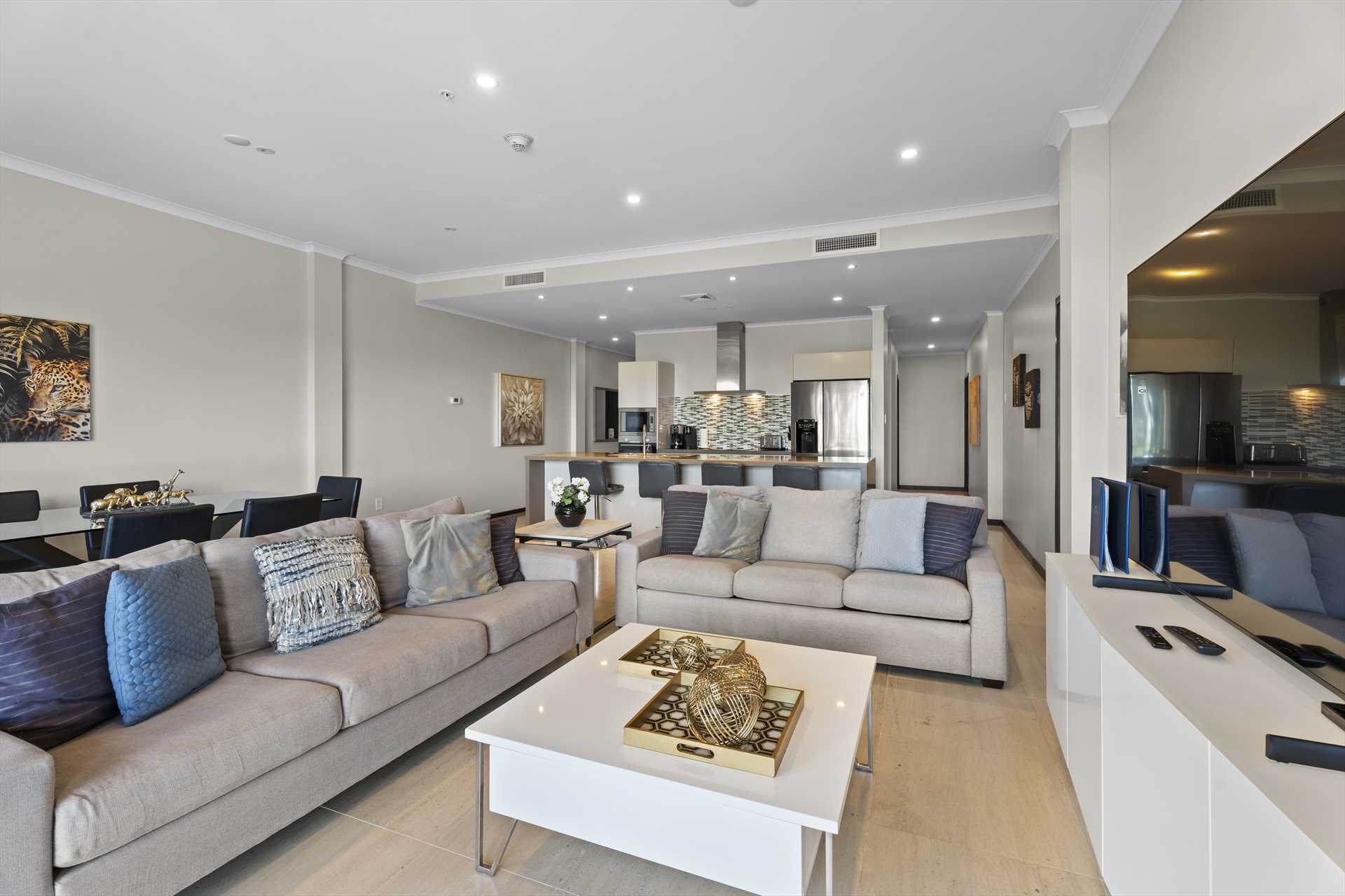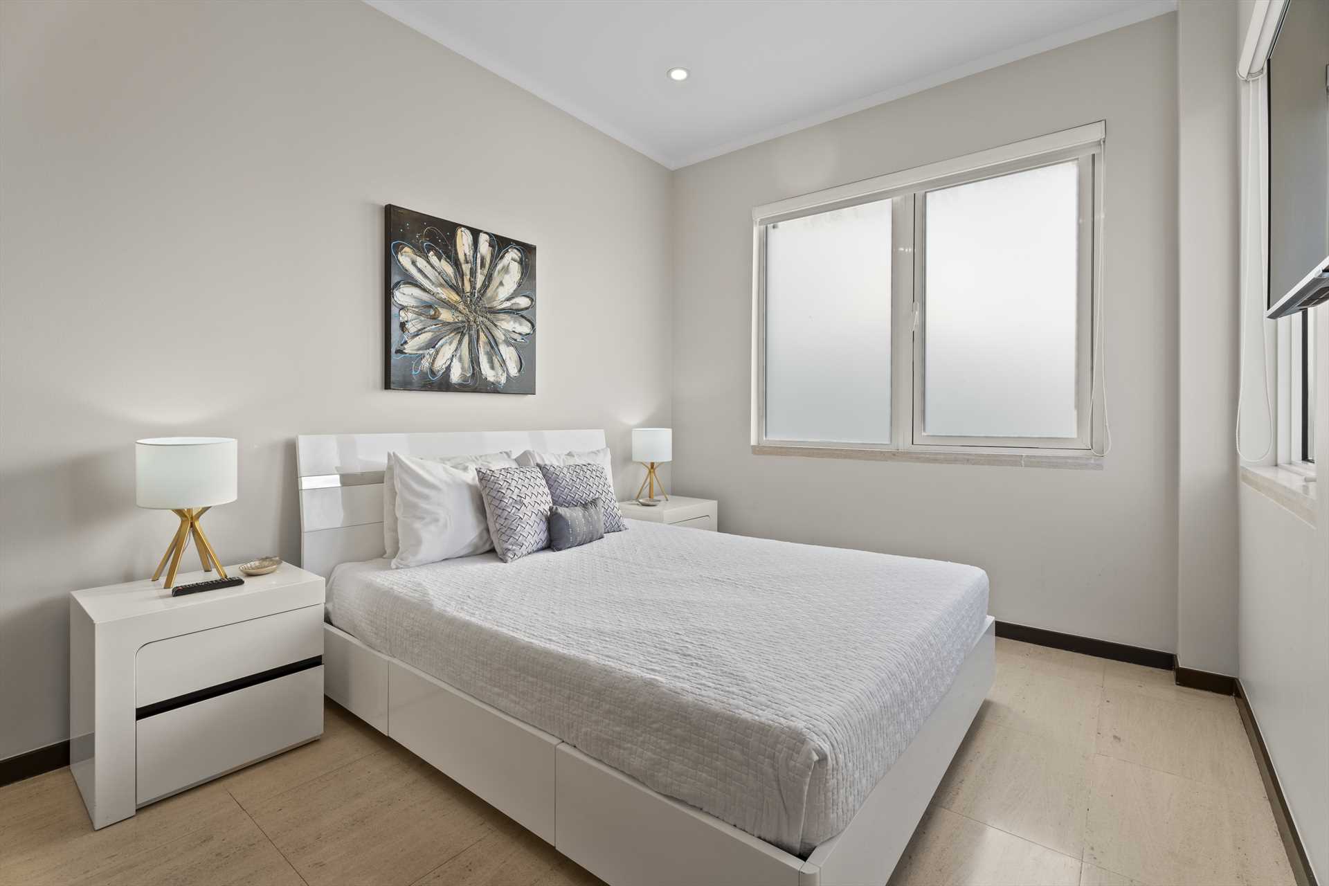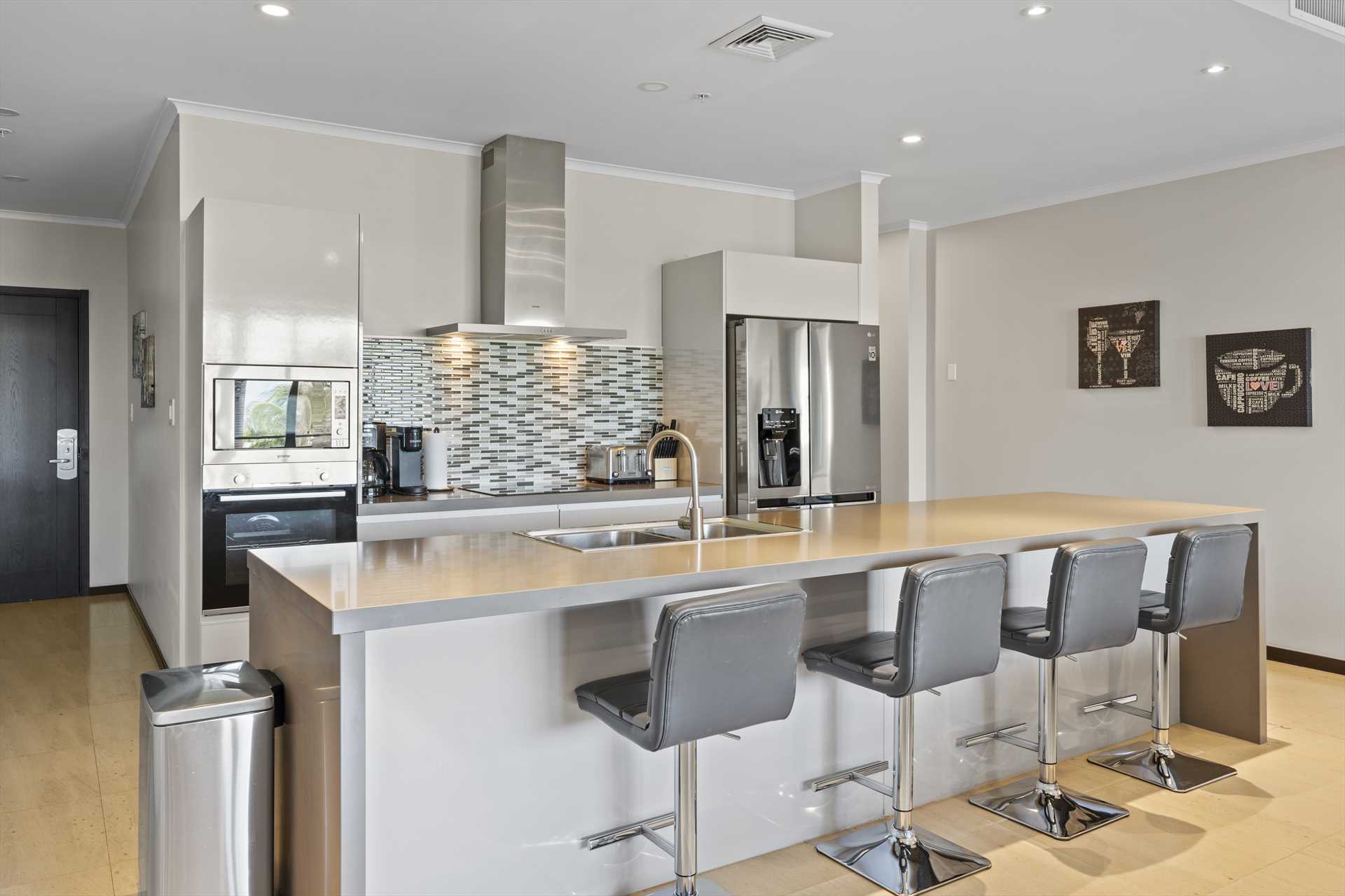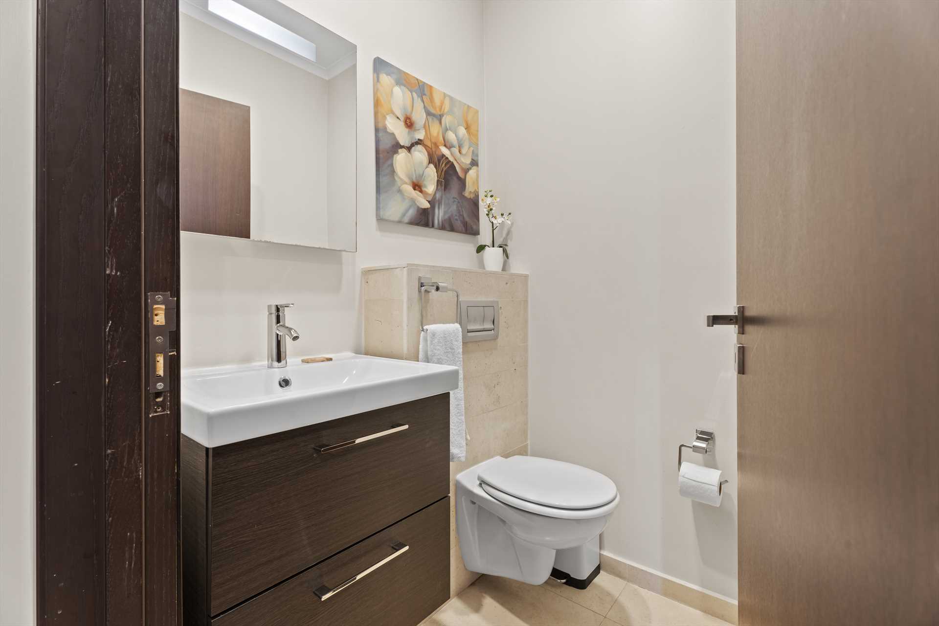 The open plan living area is provided with a large Smart TV, two 3-seat sofas (1 is a sofa-bed with a queen-size mattress), a 6-seat glass dining table, and a full-sized fully equipped modern kitchen with 4-barstools. A half-bathroom and a laundry room with washer-dryer and storage facilities are also available for your comfort.