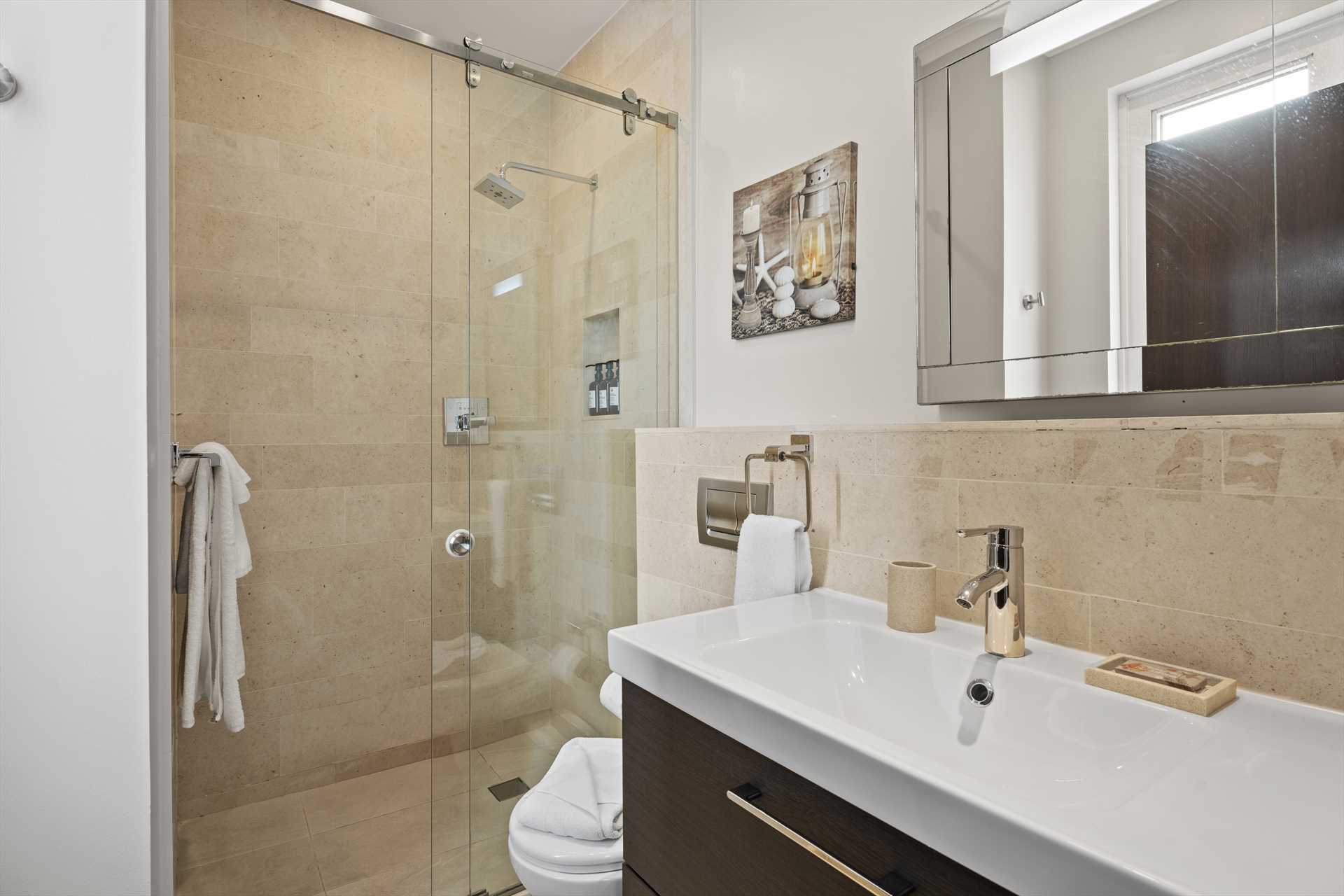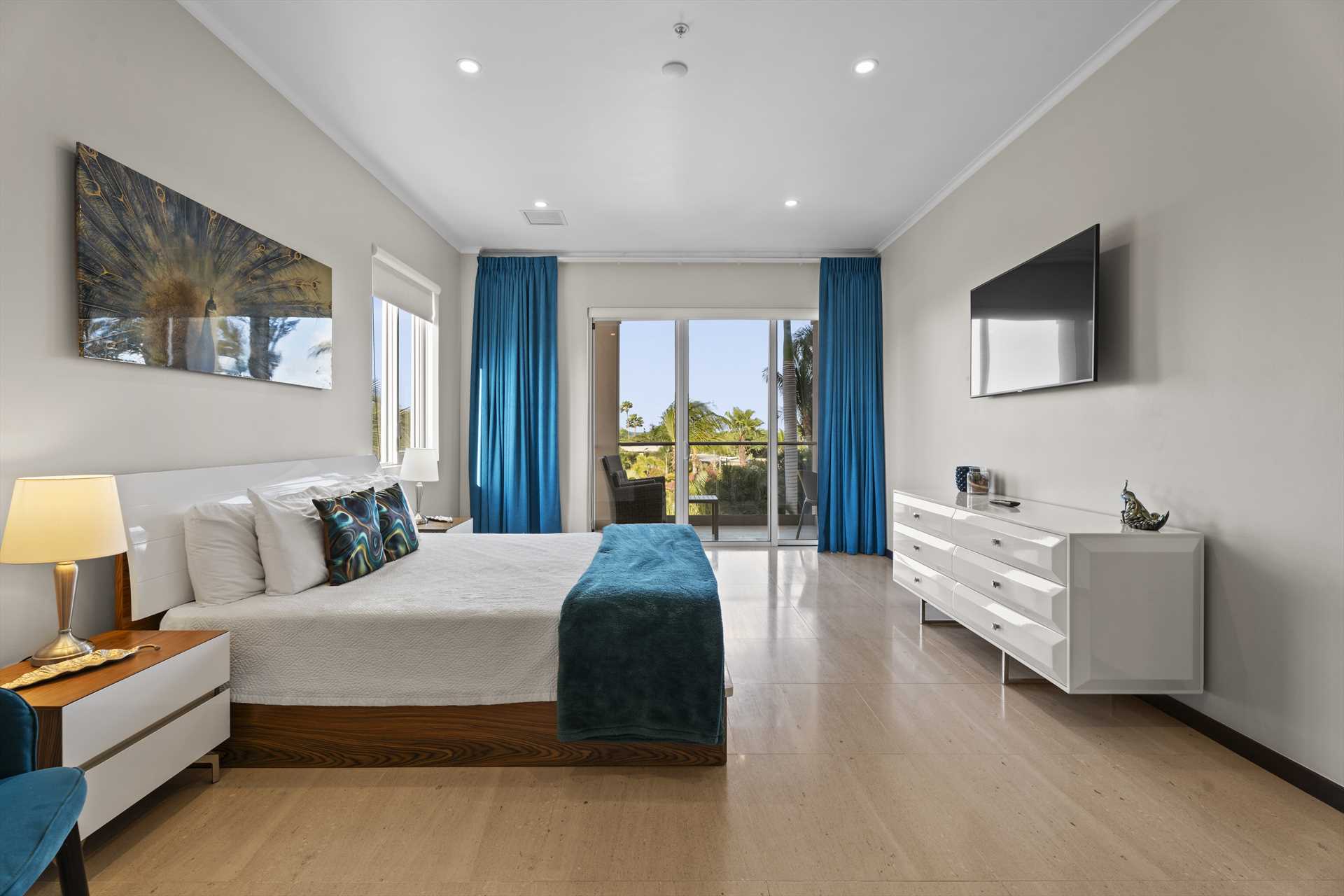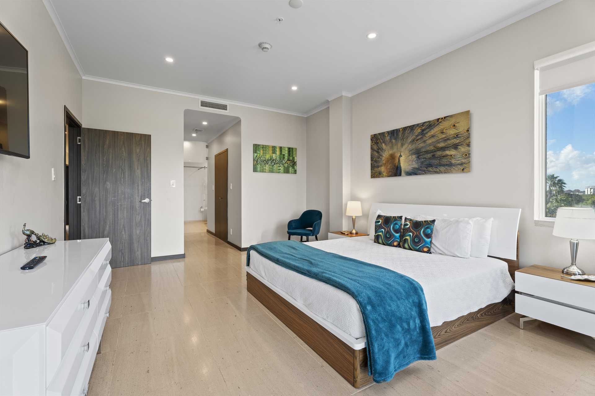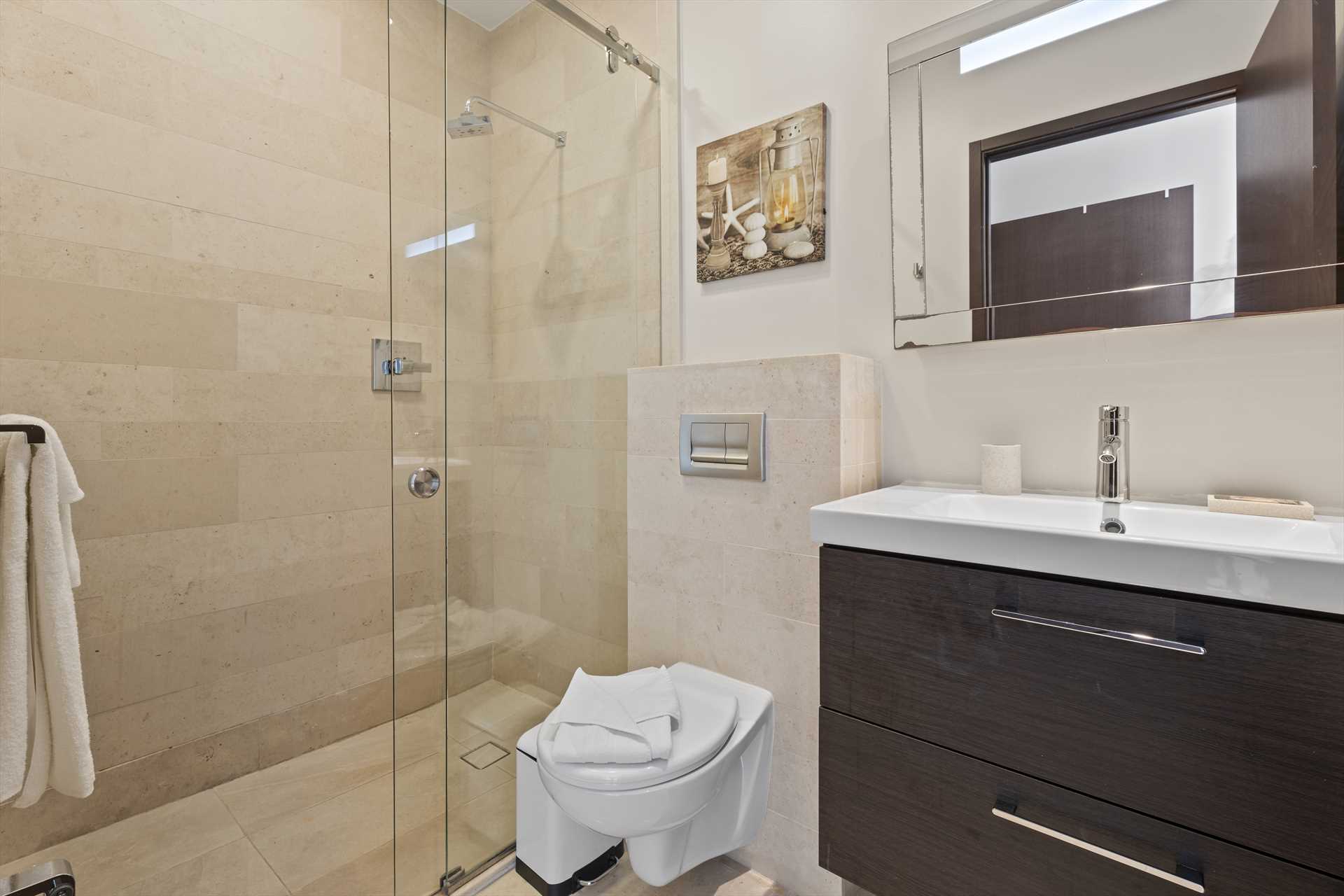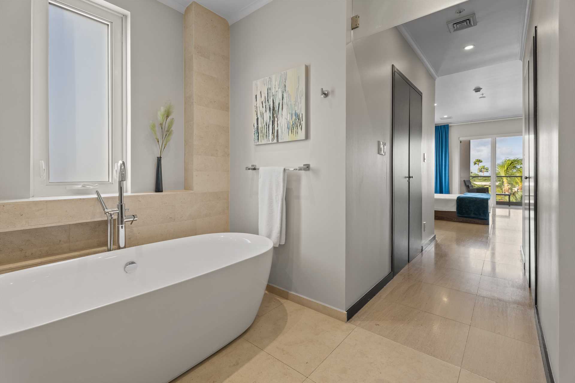 The primary bedroom has a king-size bed, a TV, a walk-in closet, and access to the balcony. The primary bedroom has a modern en-suite bathroom with a 2-sink vanity, a glass-enclosed shower and toilet, and a free-standing bathtub to soak and indulge during your stay. The second bedroom has a queen-size bed, a TV, a built-in closet, and an en-suite bathroom with a shower. And the third bedroom has two twin-size beds, a TV, a built-in closet, and an en-suite bathroom with a shower.