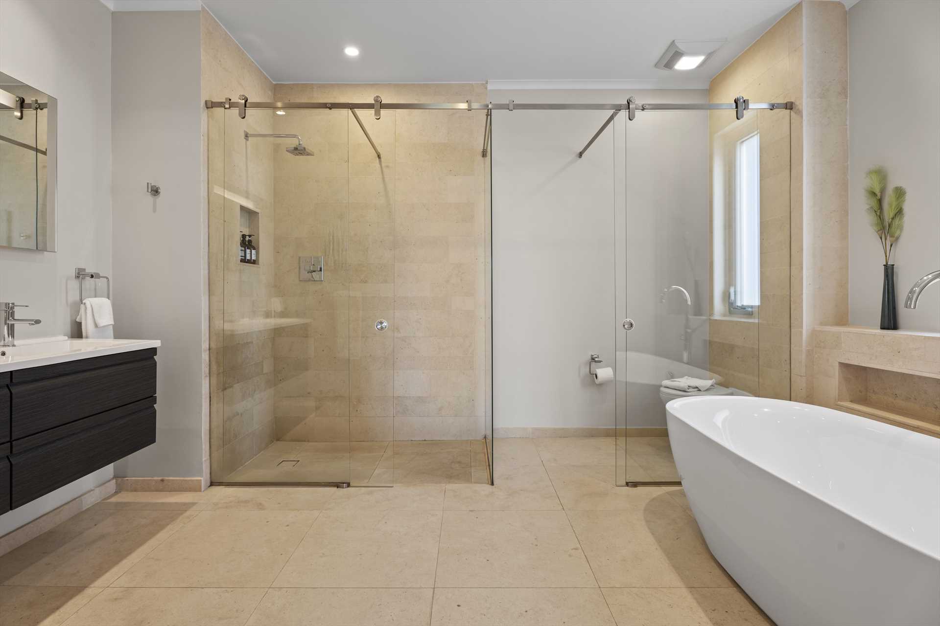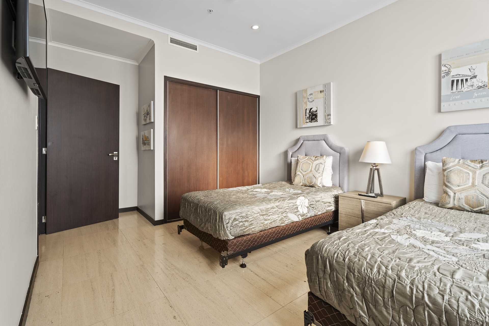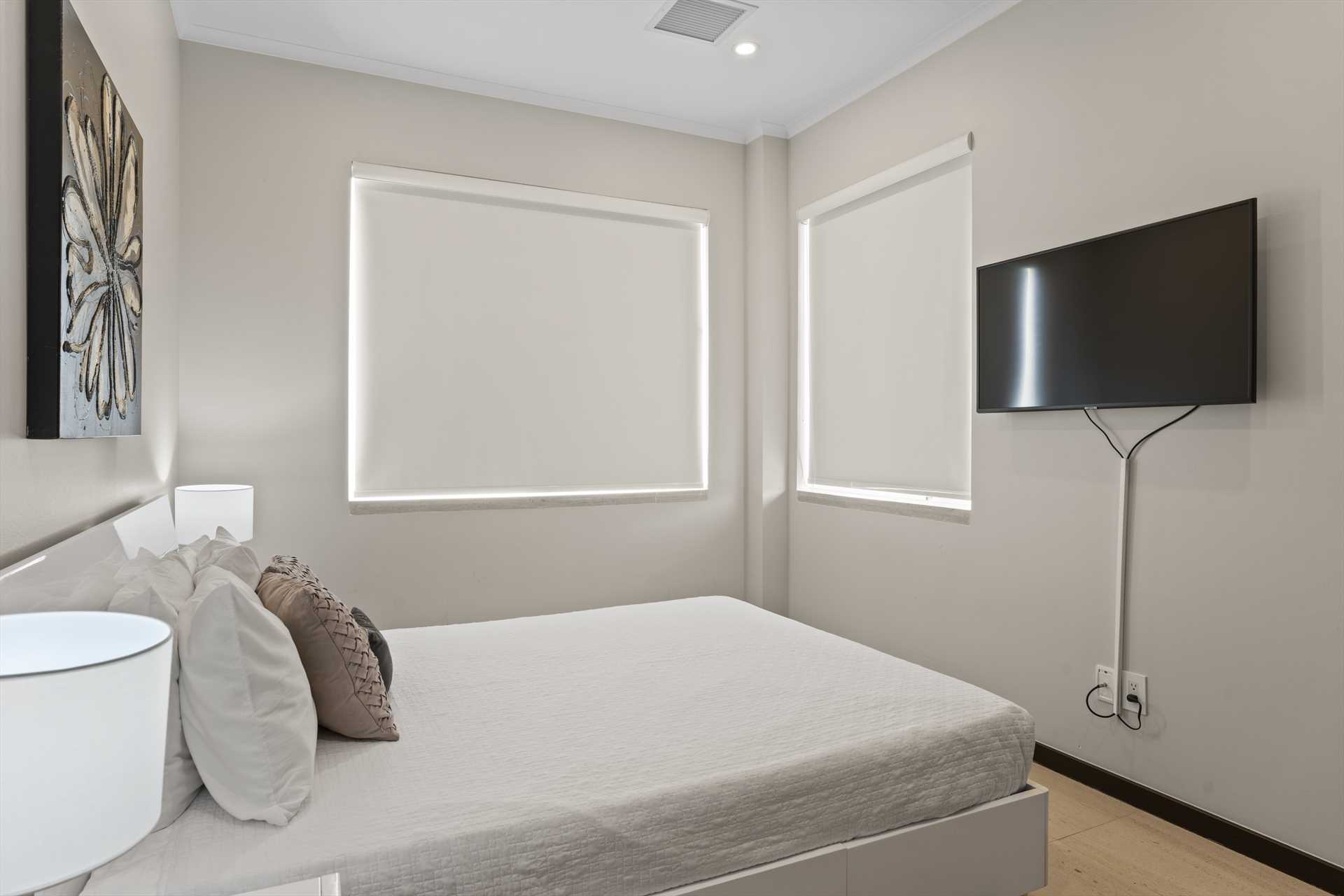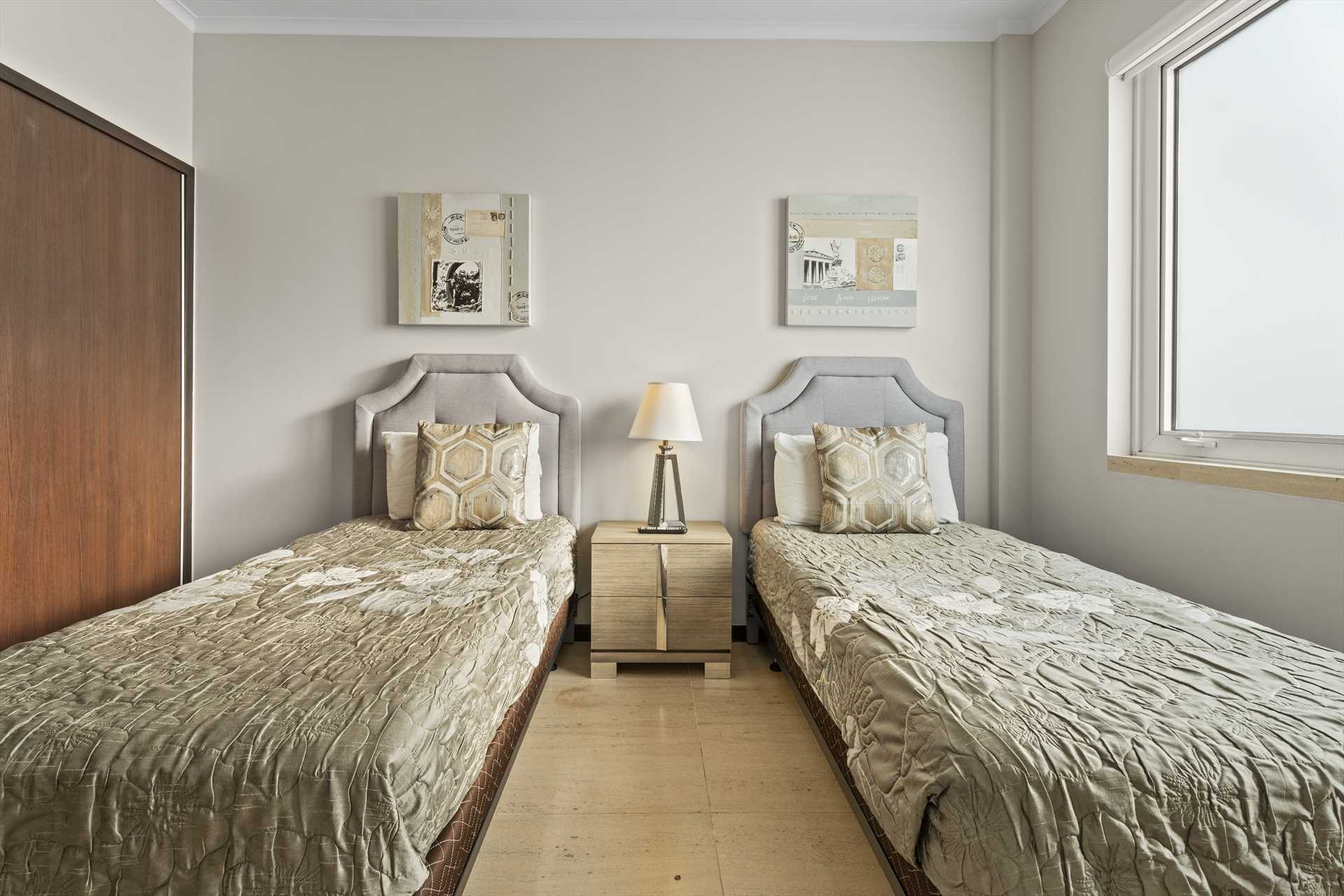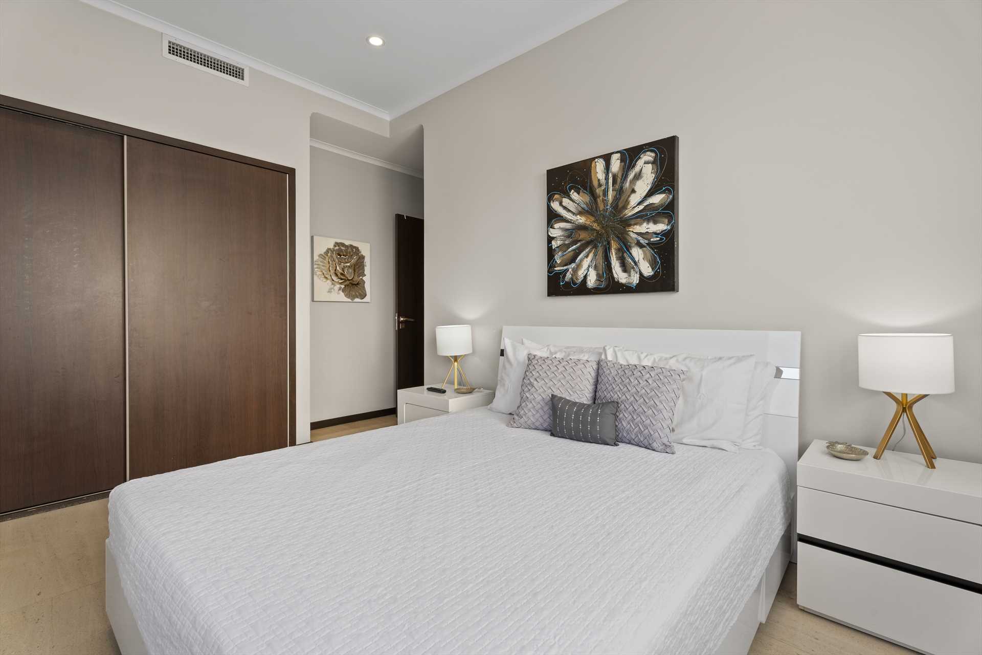 The primary bedroom has a king-size bed, a TV, a walk-in closet, and access to the balcony. The primary bedroom has a modern en-suite bathroom with a 2-sink vanity, a glass-enclosed shower and toilet, and a free-standing bathtub to soak and indulge during your stay. The second bedroom has a queen-size bed, a TV, a built-in closet, and an en-suite bathroom with a shower. And the third bedroom has two twin-size beds, a TV, a built-in closet, and an en-suite bathroom with a shower.