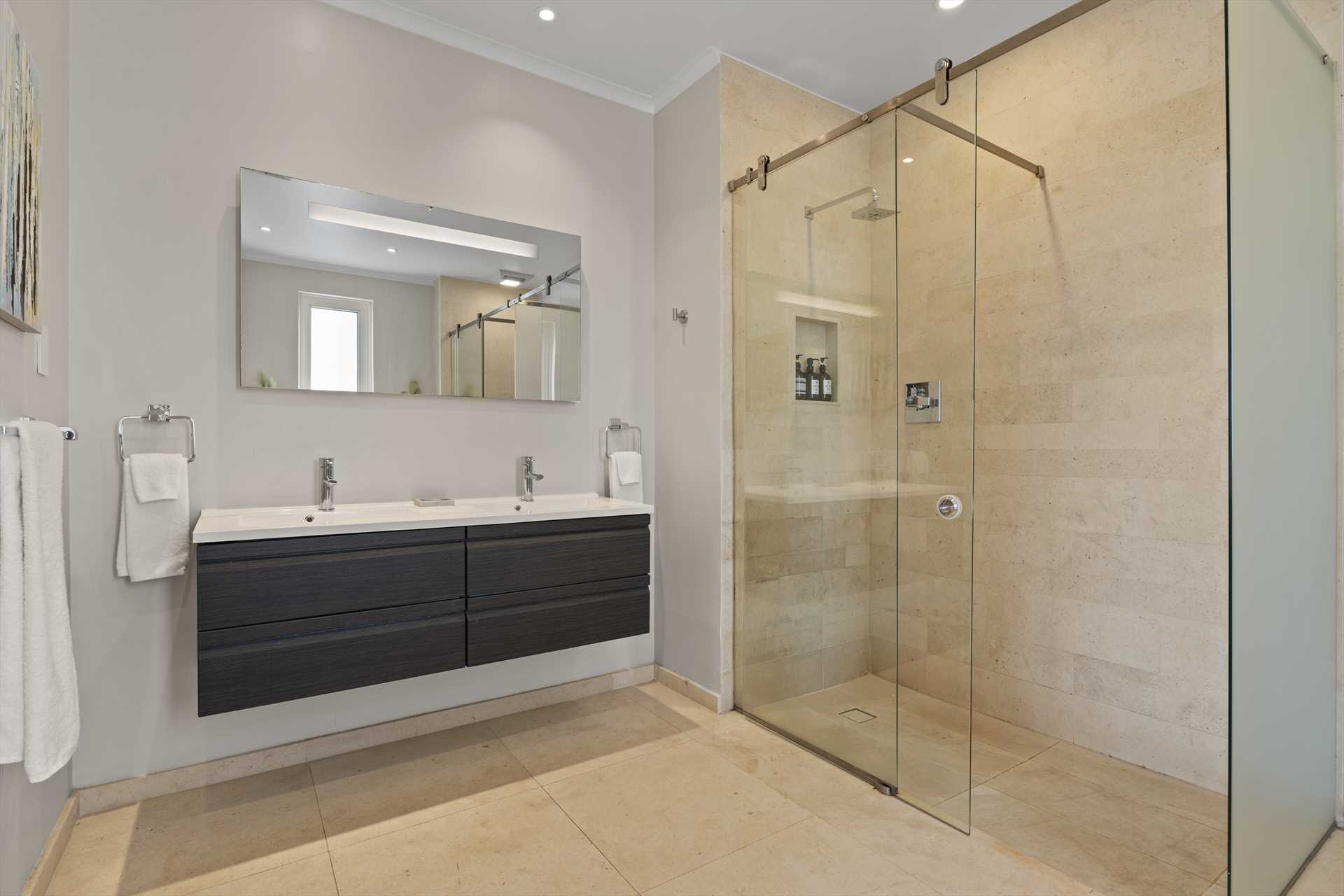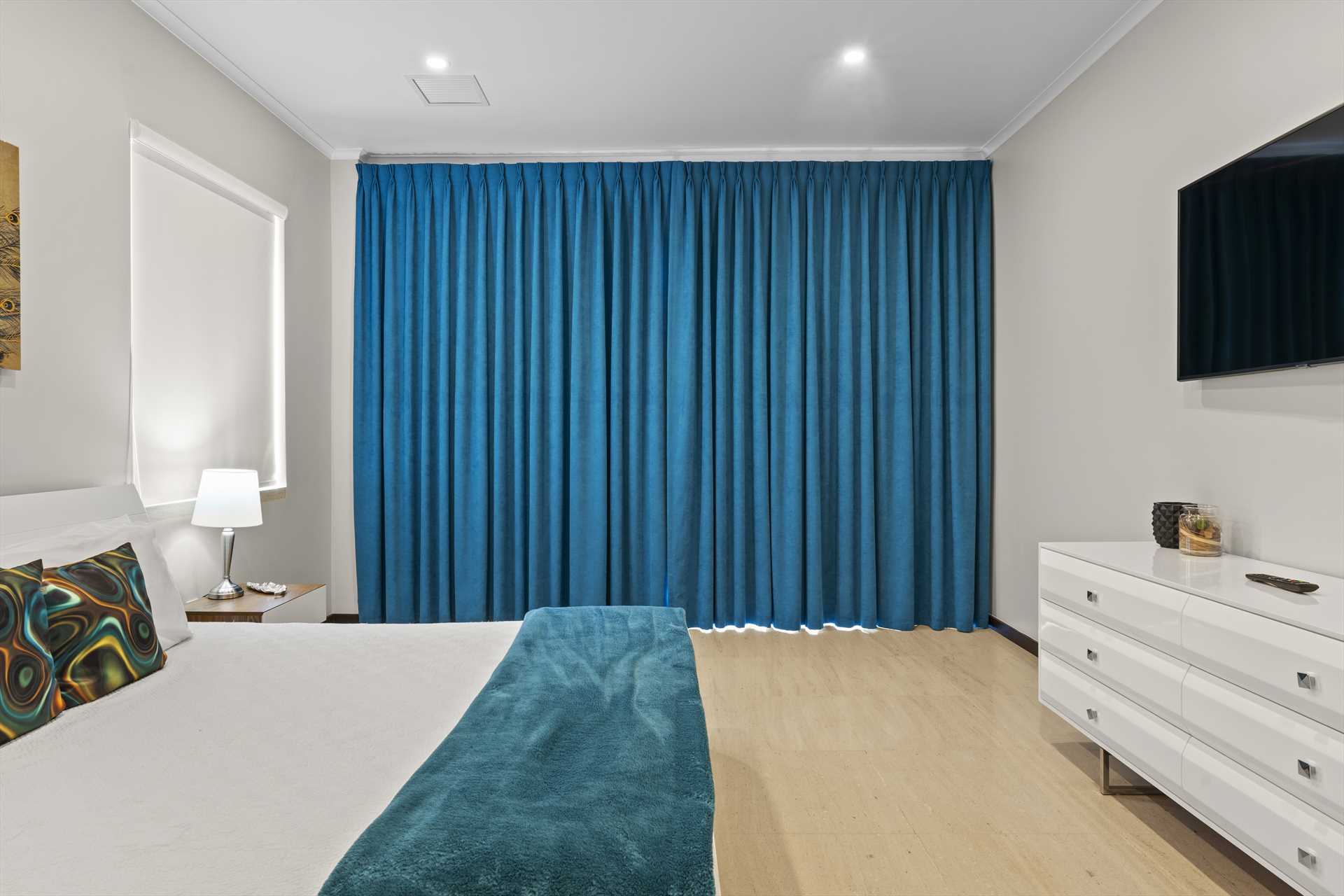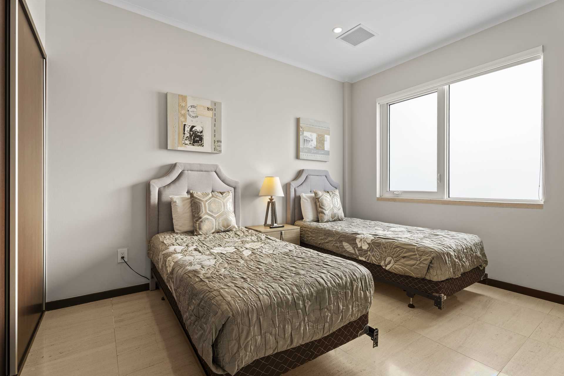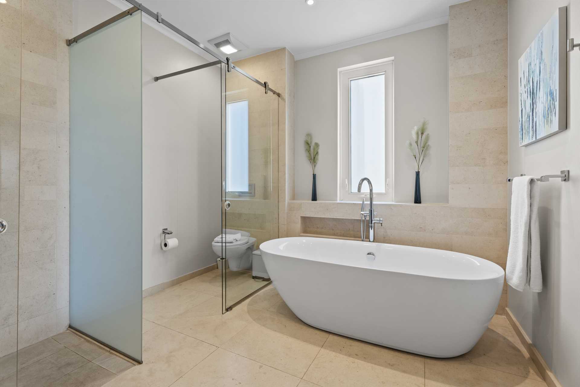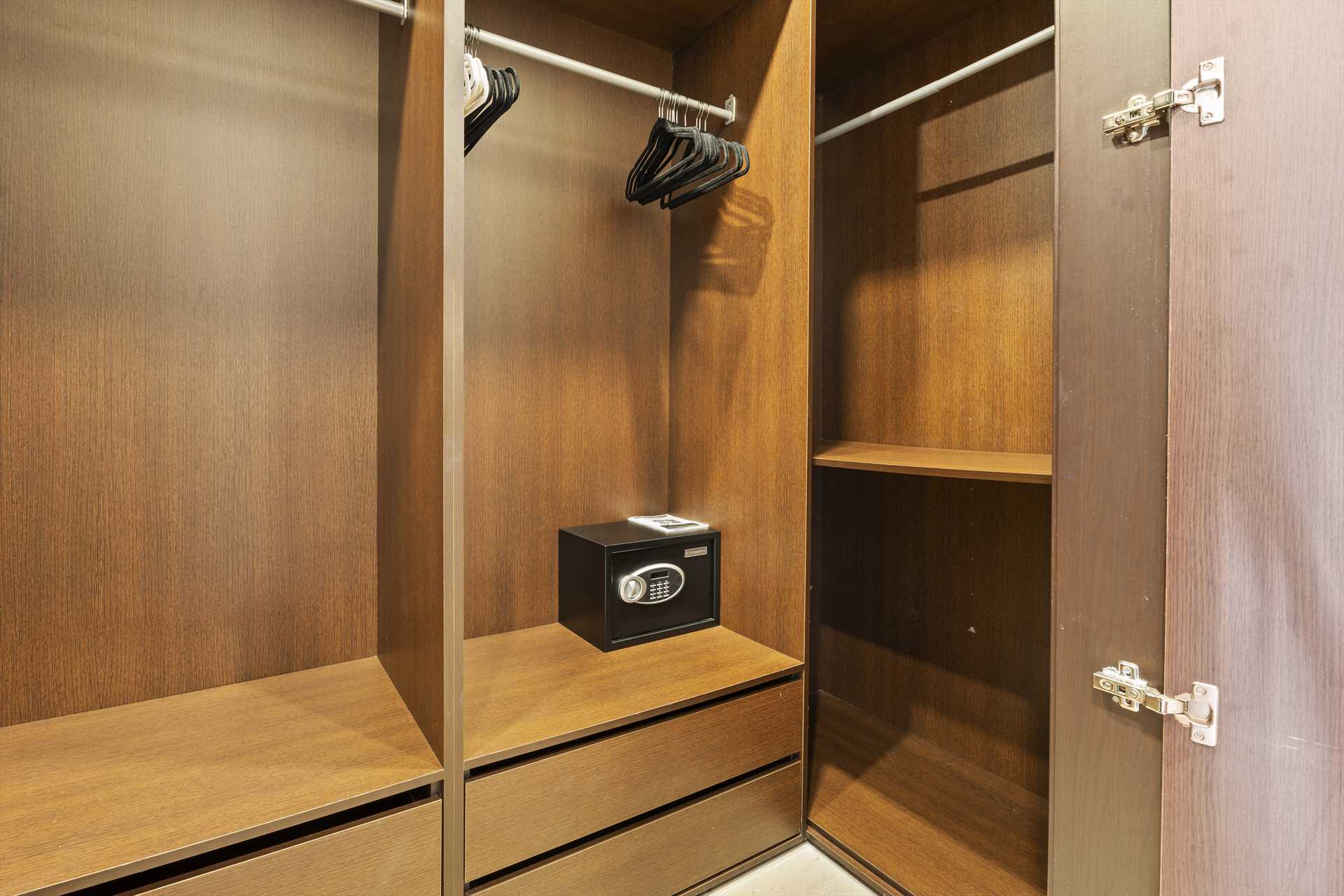 The primary bedroom has a king-size bed, a TV, a walk-in closet, and access to the balcony. The primary bedroom has a modern en-suite bathroom with a 2-sink vanity, a glass-enclosed shower and toilet, and a free-standing bathtub to soak and indulge during your stay. The second bedroom has a queen-size bed, a TV, a built-in closet, and an en-suite bathroom with a shower. And the third bedroom has two twin-size beds, a TV, a built-in closet, and an en-suite bathroom with a shower.