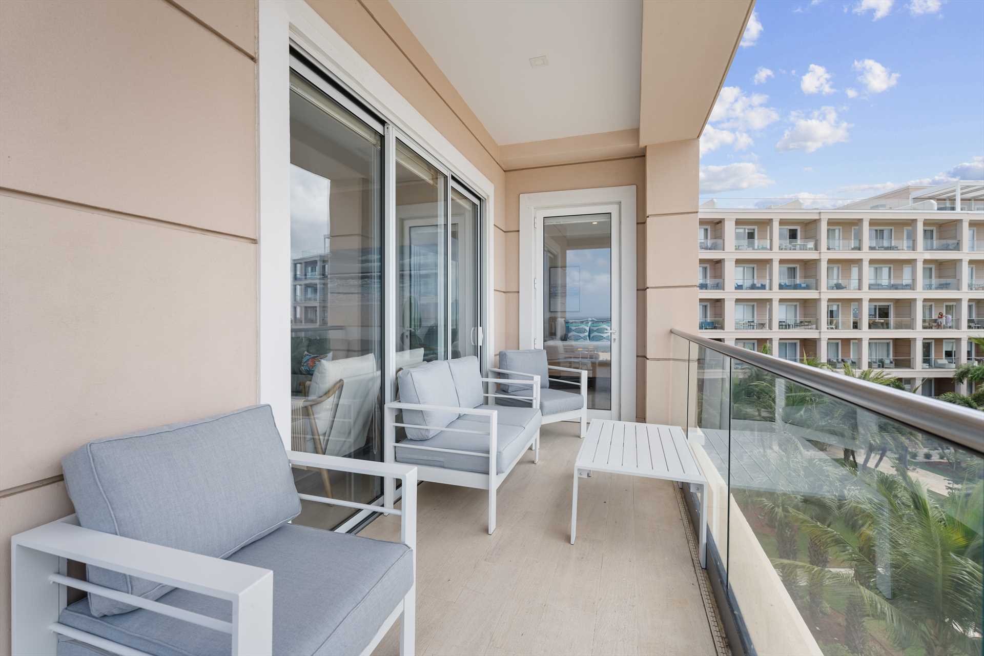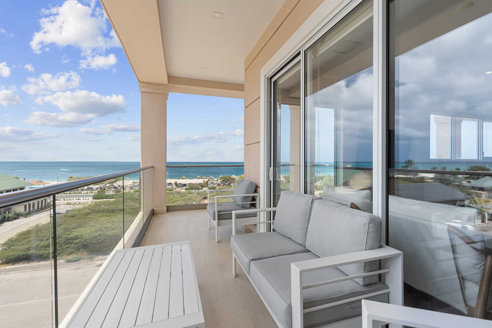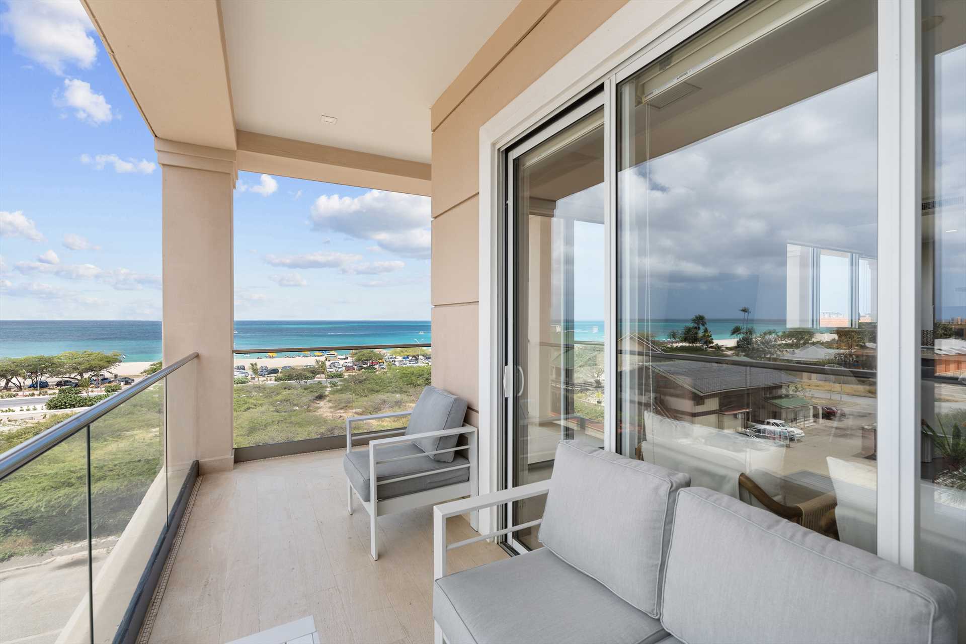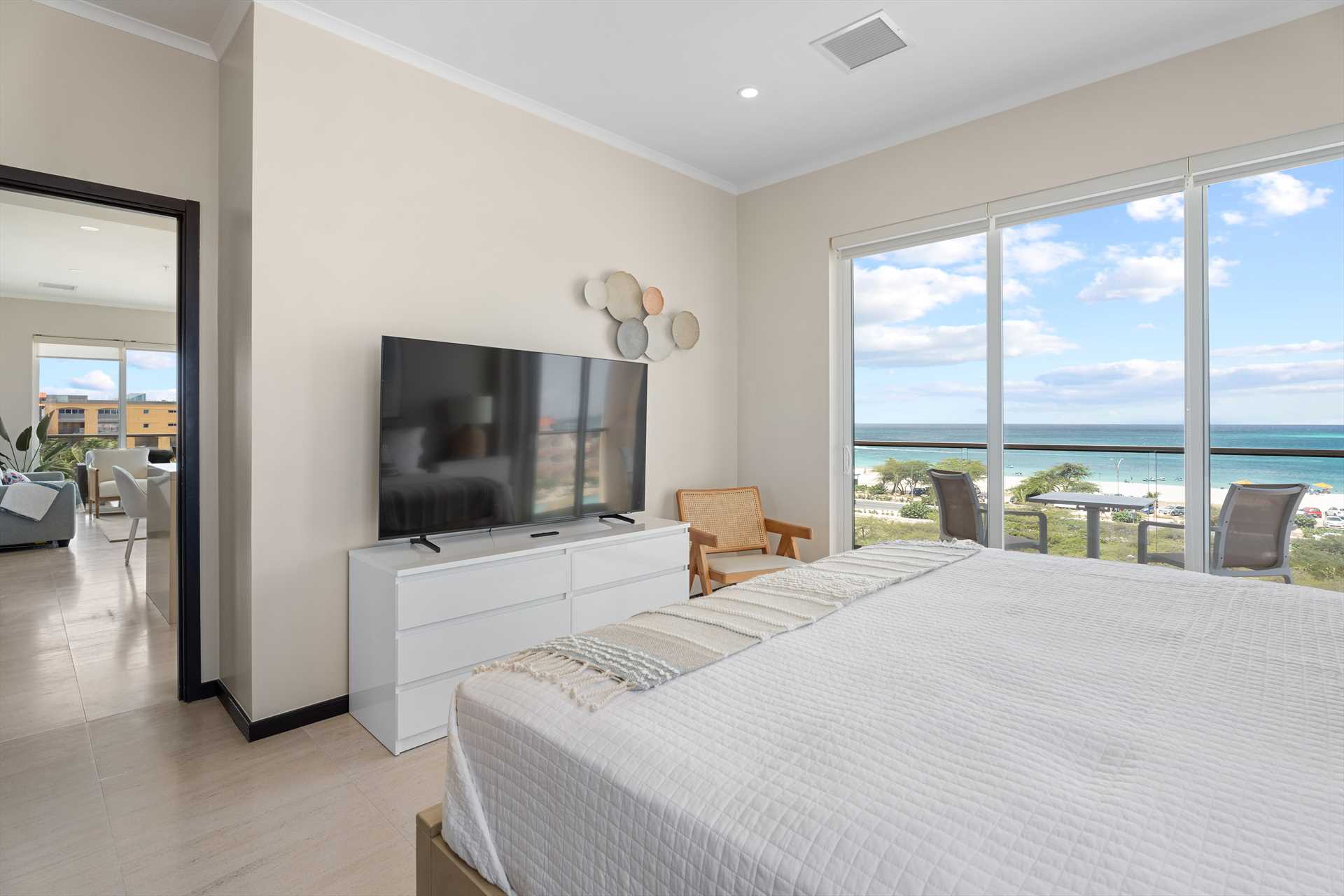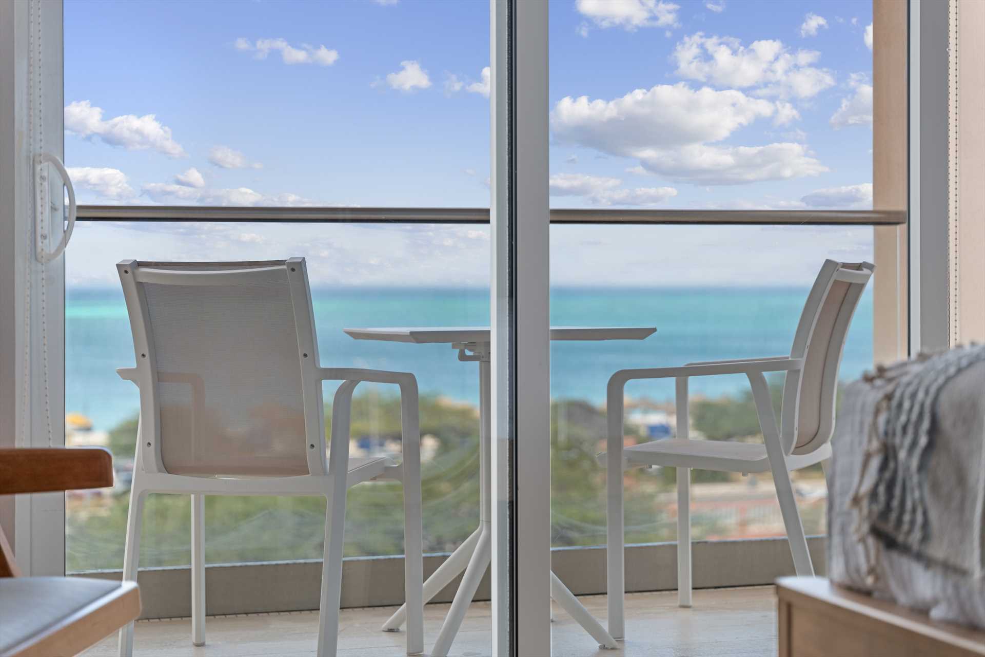 The amazing Vista Paradiso Two-bedroom condo offers breathtaking views of the beach, resort, and island from every room! Situated in the prestigious LeVent Beach Resort Aruba on Eagle Beach, you will experience the best sunsets Aruba has to offer. With two balconies to take in the blue skies and Caribbean waters, the L-shaped balcony off the living room with an outdoor seating set, and the primary bedroom's balcony with a table plus two chairs.