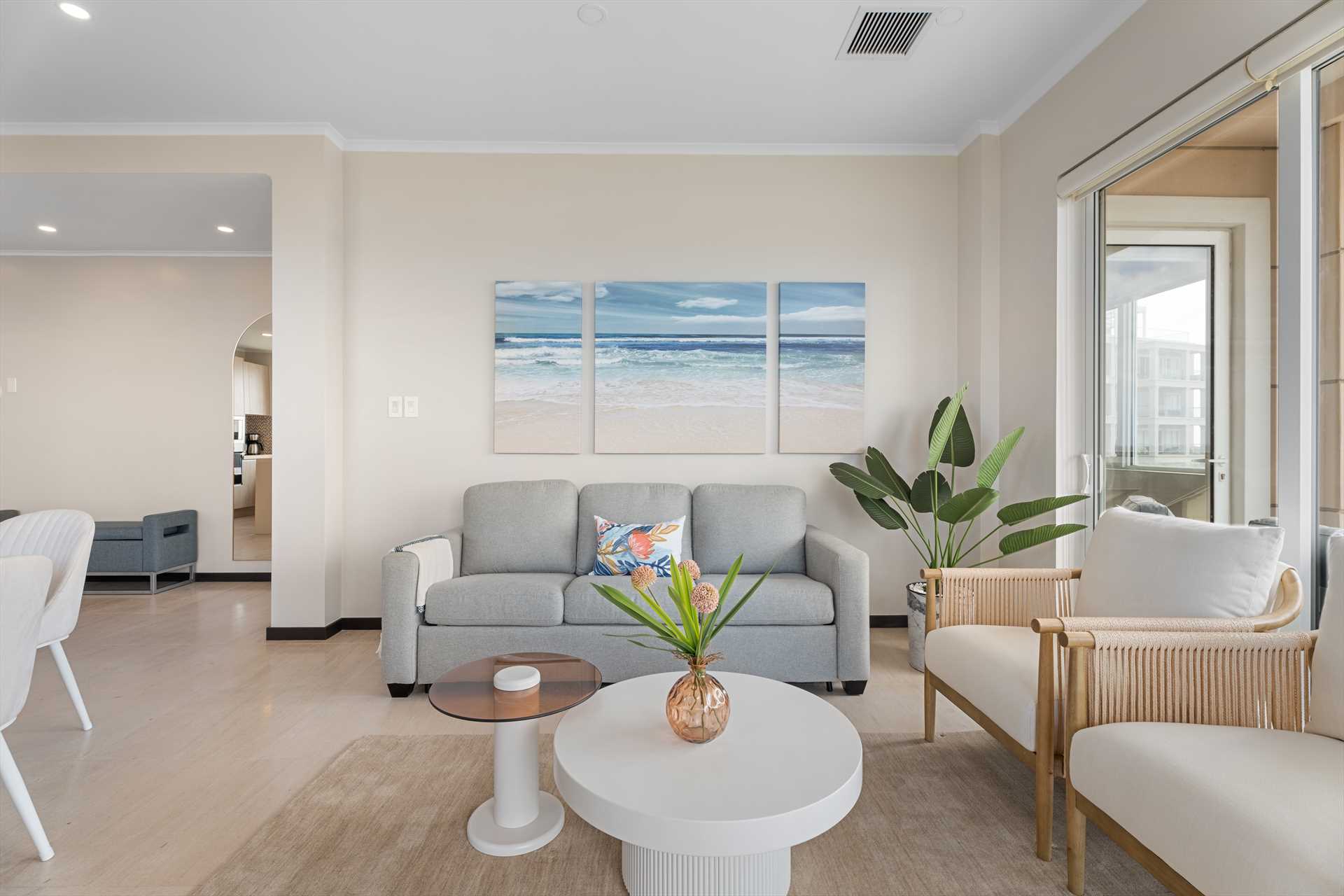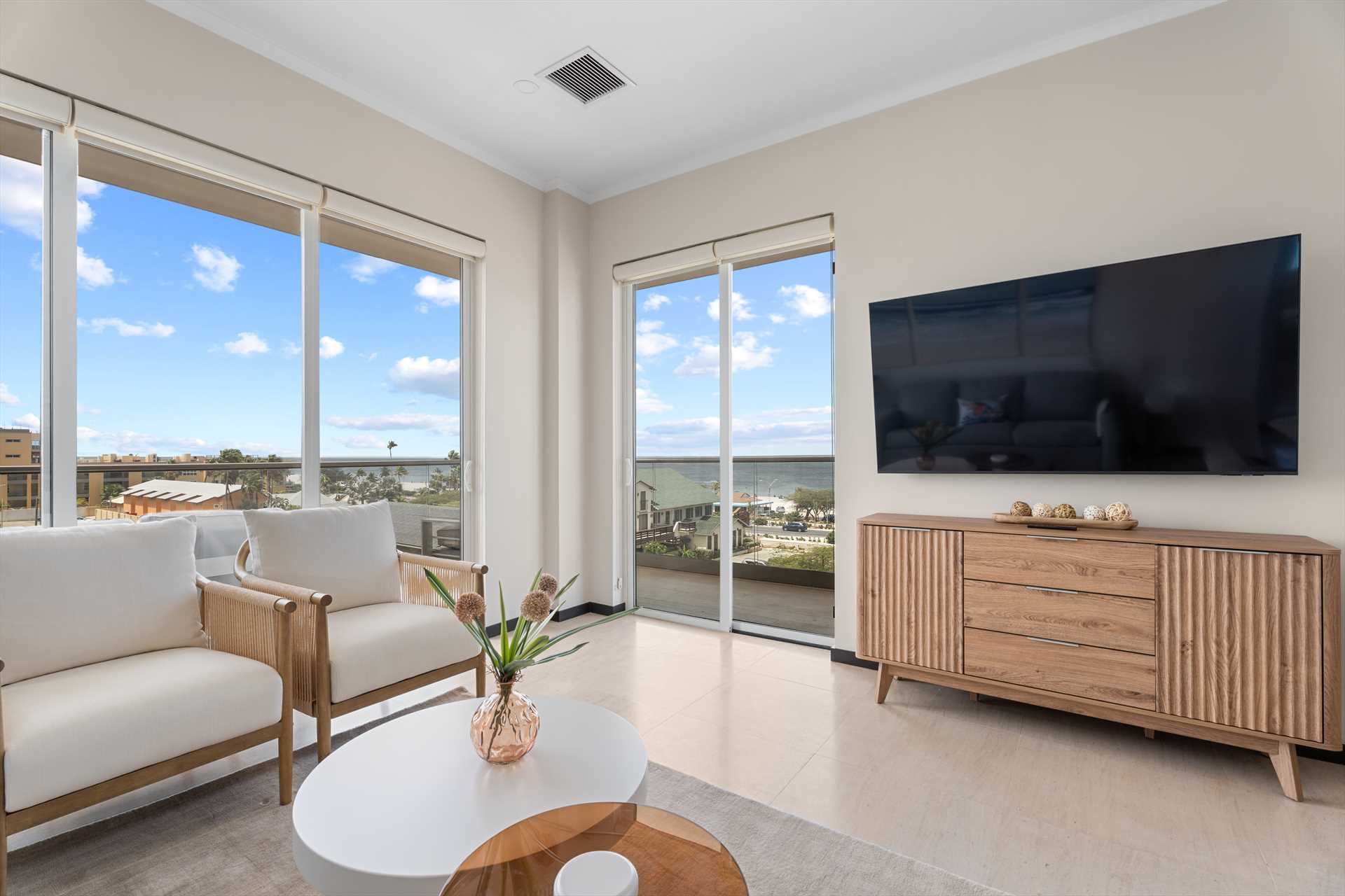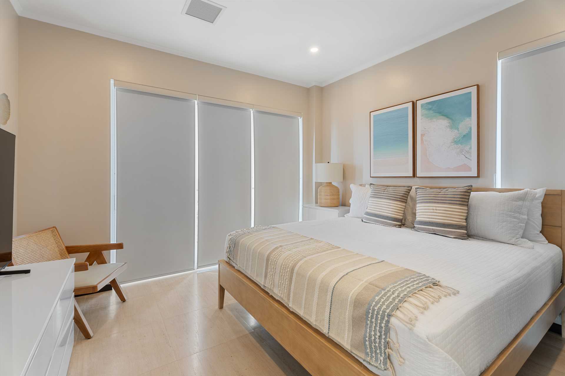 Inside, the beautiful views continue through sliding glass doors and large windows. The living room features a large Smart TV, a sofa bed with a queen-size mattress, a 6-seat dining table, and a fully equipped modern kitchen with beach views, as well as 3 bar stools. Off the entrance hallway, there's a half bathroom and a laundry room with a washer, dryer, and storage.