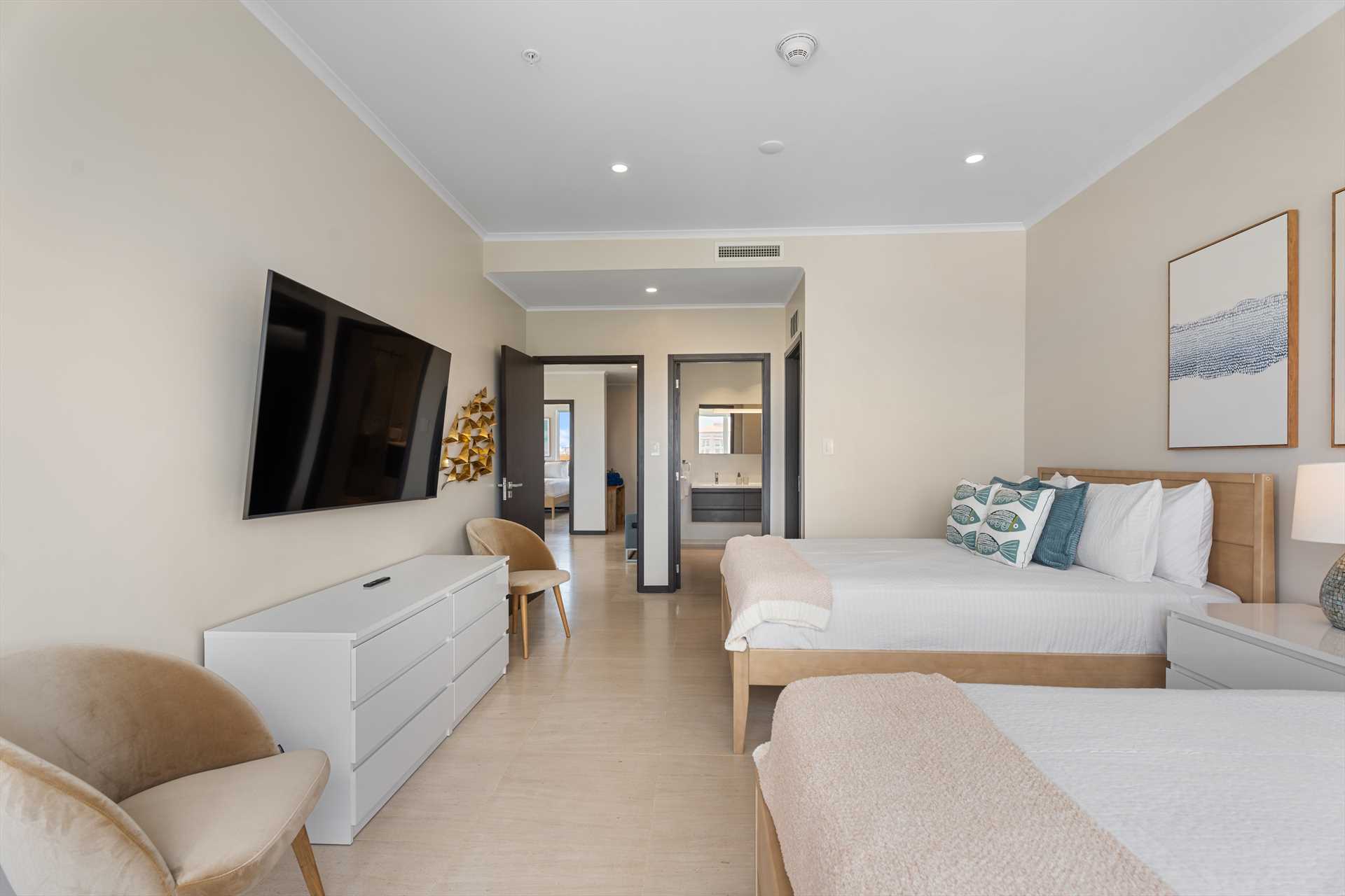 The primary bedroom features a king-size bed, a Smart TV, built-in closets, access to a balcony with breathtaking views, and a primary en-suite bathroom with a shower. The second bedroom offers two queen-size beds, a Smart TV, built-in closets, access to the living room balcony, and the second en-suite bathroom with a shower.
