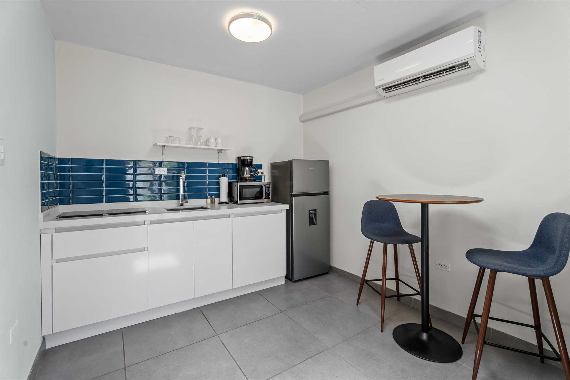 The apartment has a living room with a sofa, cable TV, a bar-height dining table for two, and a kitchenette fully equipped with a stove, fridge, microwave, coffee maker, and all essential cooking utensils. The bedroom has a king-size bed, cable TV, closet, and a full bathroom, inlcuding the shower with water heater for added comfort. Outside, there is a table with seating for two, perfect for enjoying your morning coffee or unwinding in the evening.